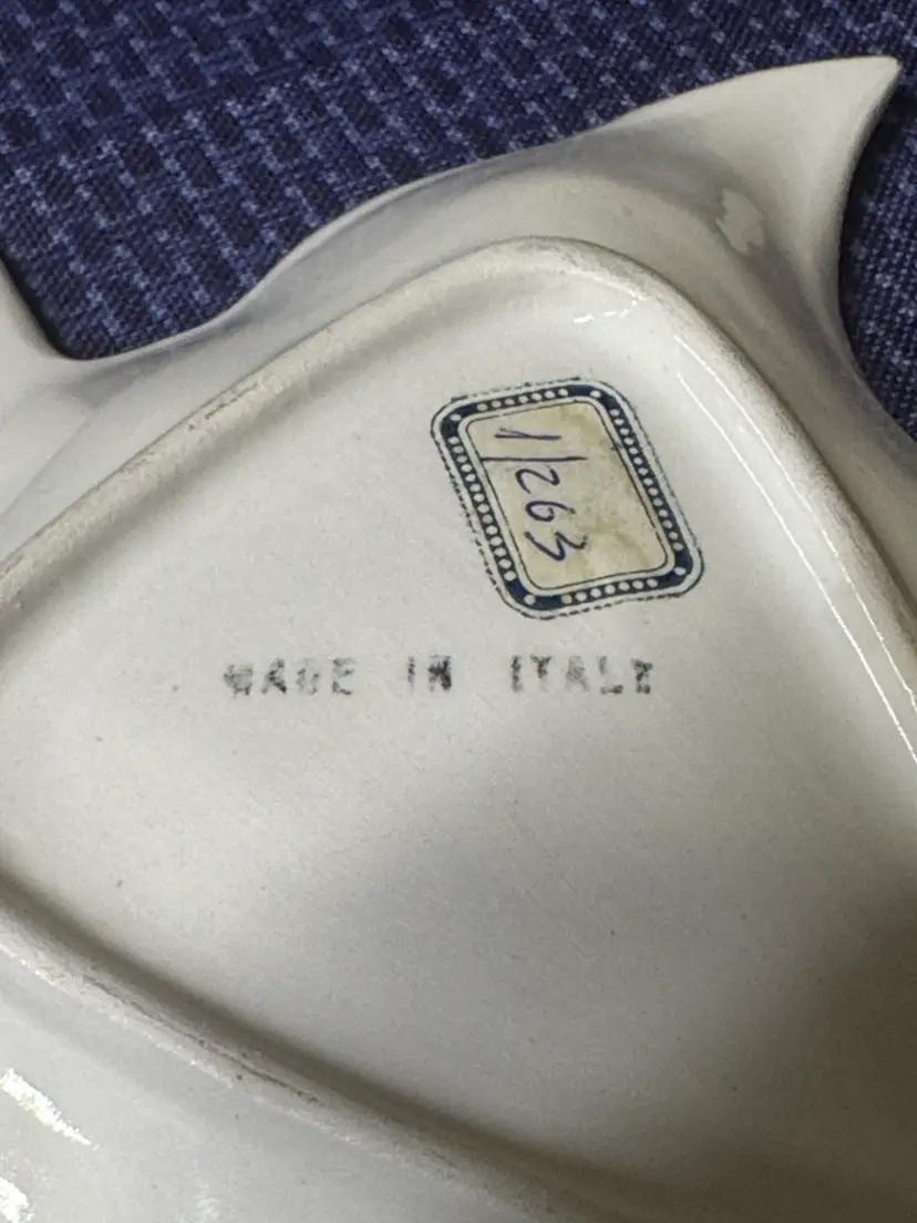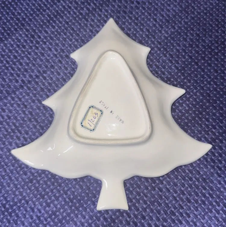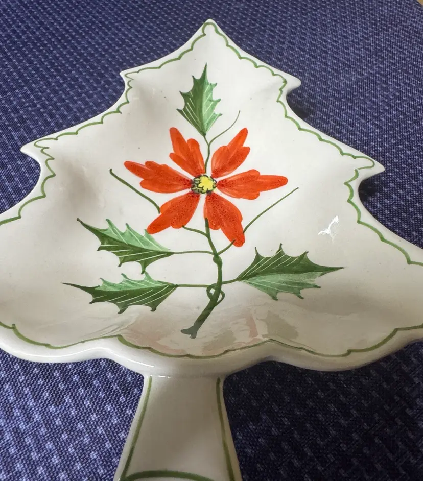 Christmas Tree Candy Dish Nut Dish hand painted red flower Made In Italy 8" tall 8” wide. Tree-shaped dish featuring a vibrant red flower and green leaves. Perfect for holiday decor. Excellent condition with no breaks or chips (13291121256)