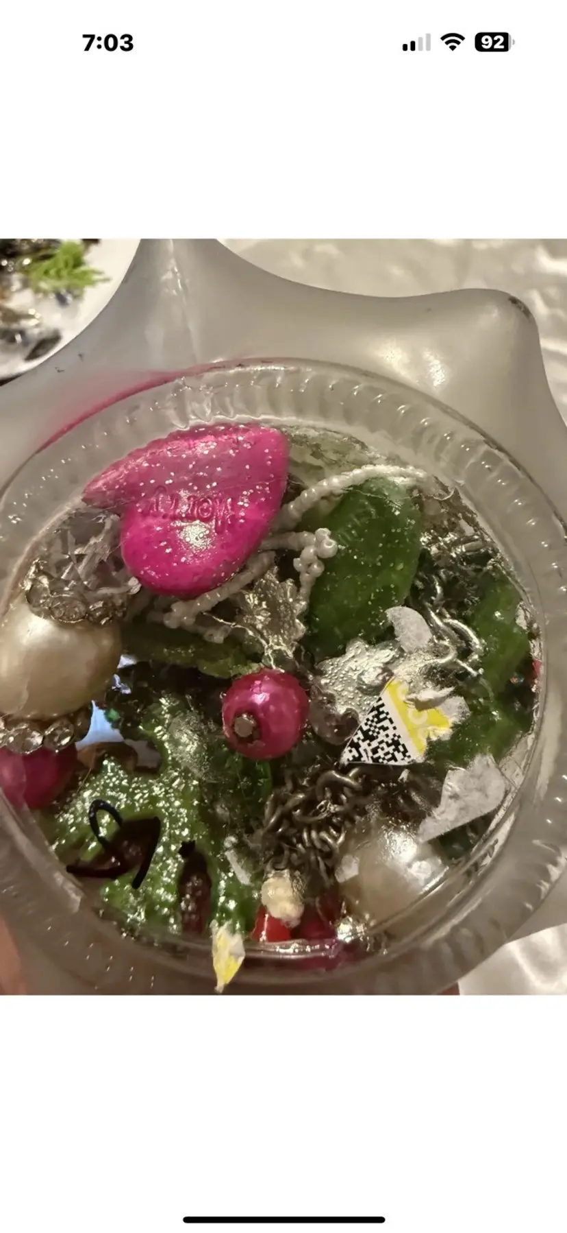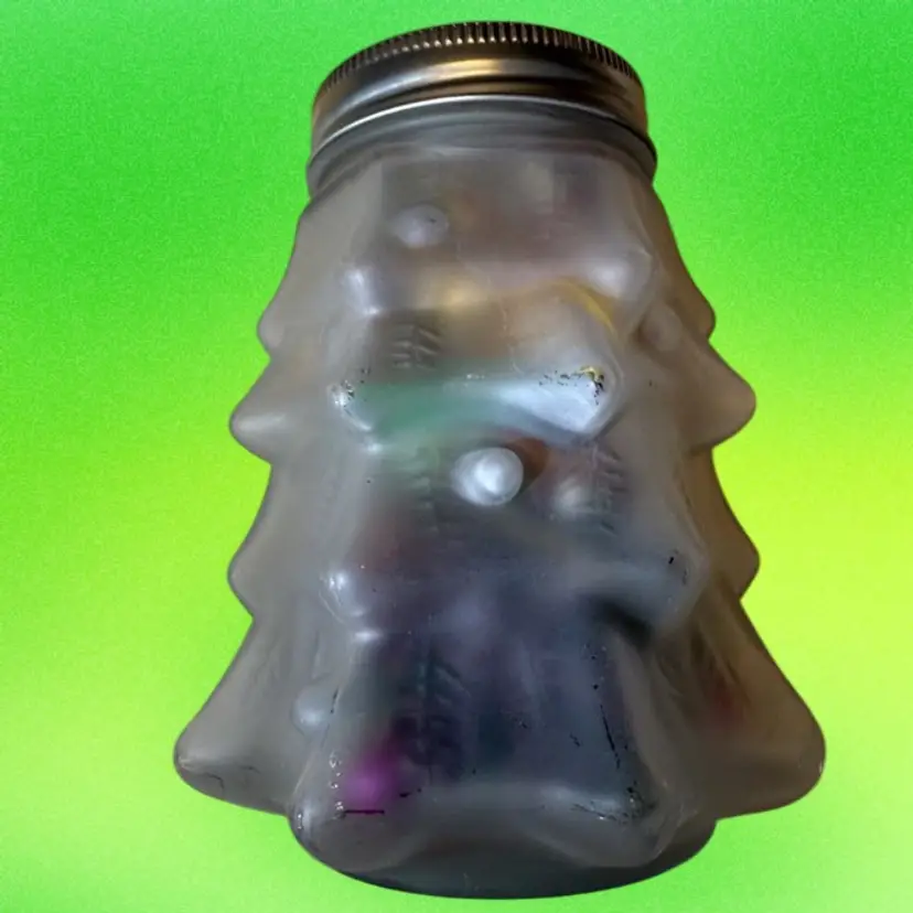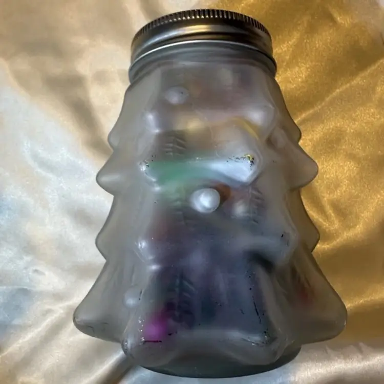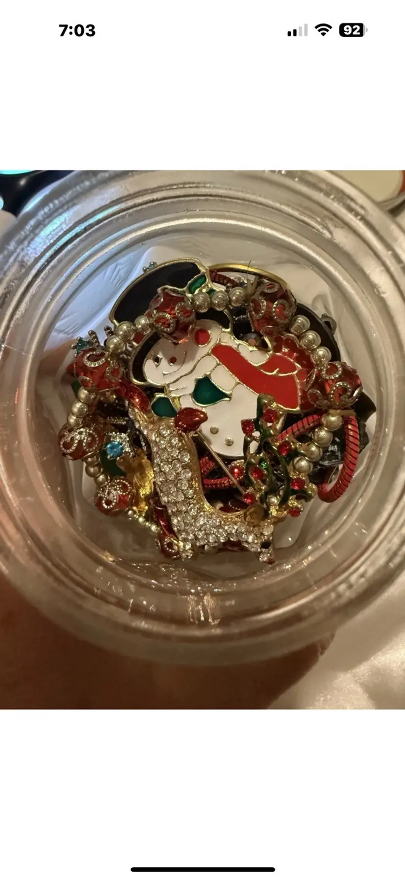 The Christmas Jewelry Jar contains a mixed lot of wearable Christmas themed earrings, necklaces, bracelets, and brooches. 1 lb of Xmas jewelry. The items are made with various mixed metals and materials, showcasing a vibrant multicolor palette. All wearable. No junk. Matched earrings