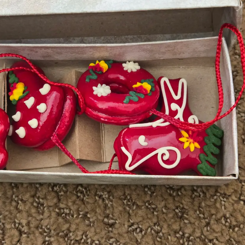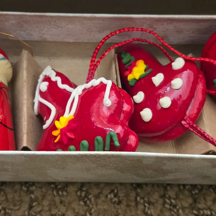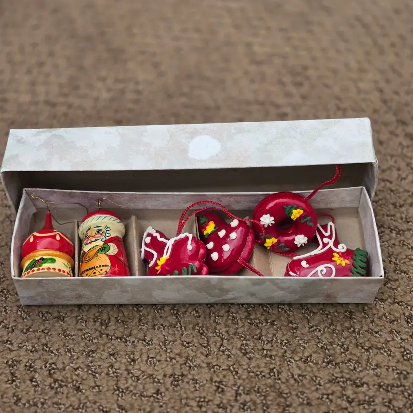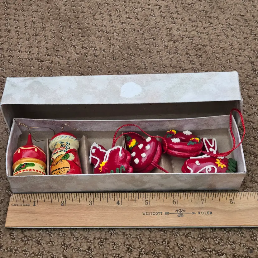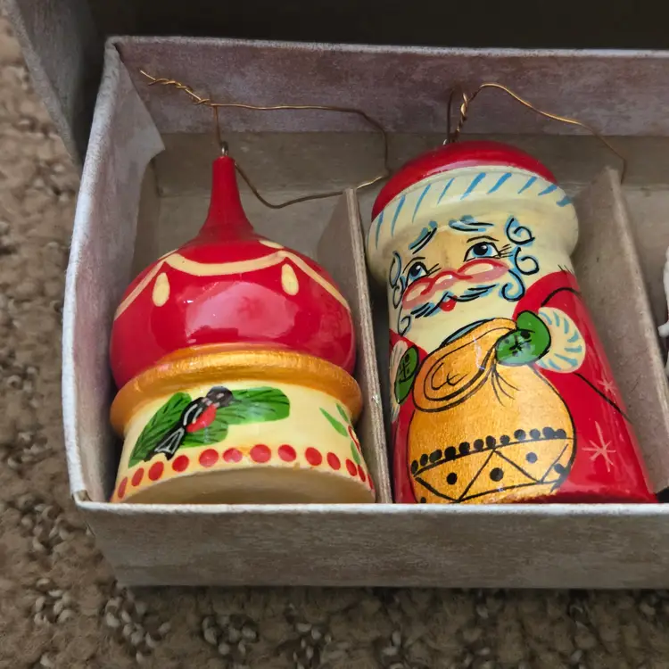 Christmas Tree Ornaments Handmade Decoration in box Unbranded Russian Vintage. Used condition missing lace, nicks, from different sets, box has tears and writing. Please view all the photos and please ask any questions prior to purchase when possible.