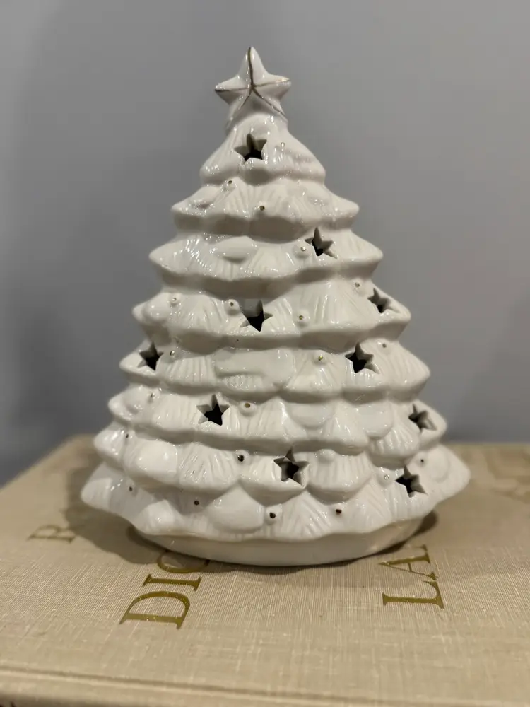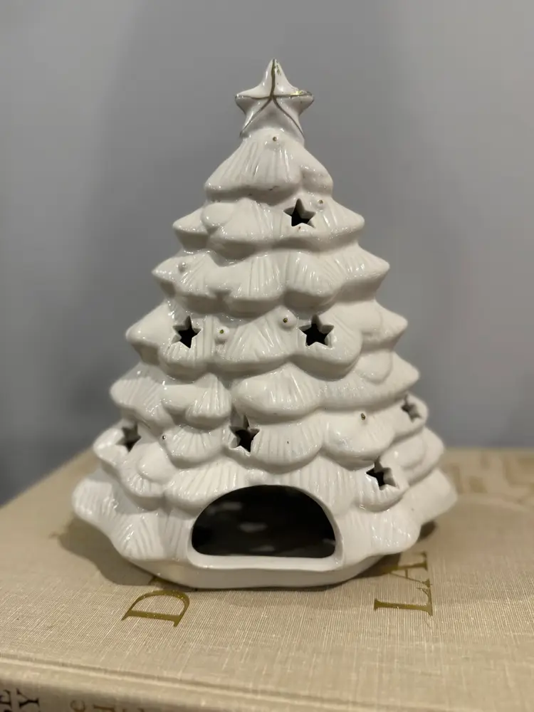 Add a festive touch to your holiday decor with this charming Christmas Tree Votive Holder. Crafted in white with elegant gold accents and star cutouts, this ceramic holder is perfect for illuminating your home with a warm, soft glow. It's an ideal piece for mantels, shelves, or tabletops during the Christmas season. Excellent pre-owned condition with no chips or cracks.
