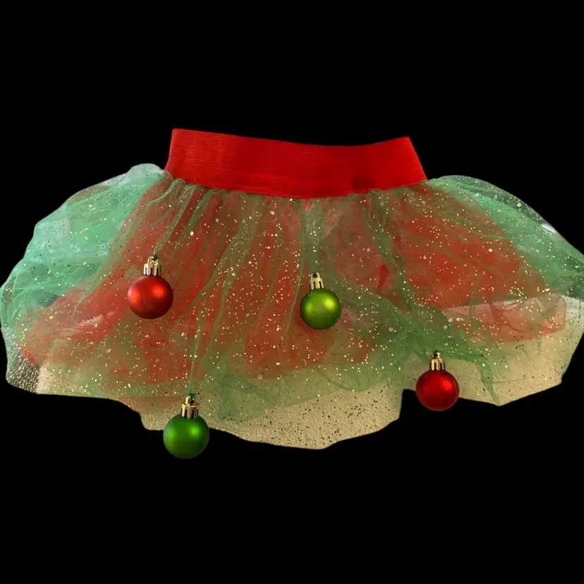 Make the holidays extra festive with this adorable Christmas tutu skirt! Featuring layers of green glitter tulle, a bright red waistband, and dangling mini ornaments, this tutu is perfect for Christmas photos, parties, or holiday dress-up. • Waist: 22” (elastic stretch) • Length: 10” • Materials: Tulle, elastic waistband, mini red & green ornaments • Condition: Excellent, like new