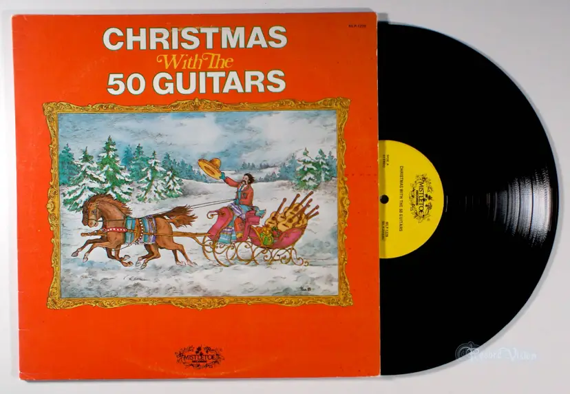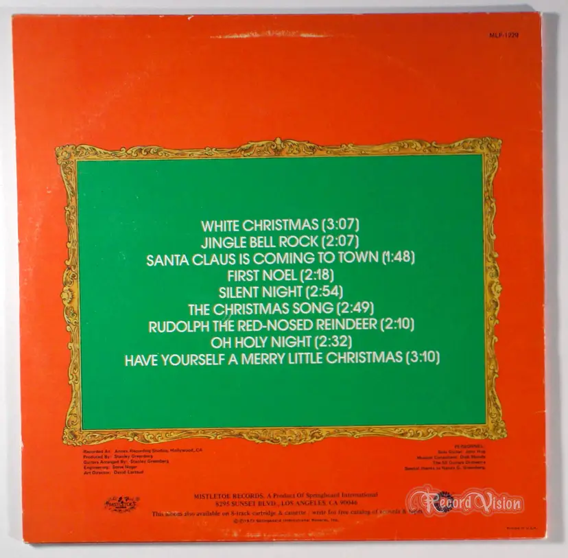 Christmas with 50 Guitars released by Mistletoe Records, is a holiday-themed vinyl LP featuring a festive collection of Christmas songs performed by a large ensemble of guitarists led by Tommy Garrett. The album includes well-known tracks such as White Christmas, Jingle Bell Rock, and Silent Night, arranged in a lush, instrumental style that emphasizes the rich textures of layered guitar sounds. While the album itself did not produce chart-topping hit singles, Jingle Bell Rock stands out as a notable track due to its enduring popularity as a holiday standard, originally popularized by Bobby Helms in 1957. The record, cataloged as MLP-1229, was released in multiple formats, including vinyl and 8-track cartridge, reflecting the era's diverse music distribution methods. Its historical significance lies in its contribution to Mistletoe Records' niche focus on Christmas music, showcasing studio musicians' talents in a period when instrumental holiday albums were a popular seasonal