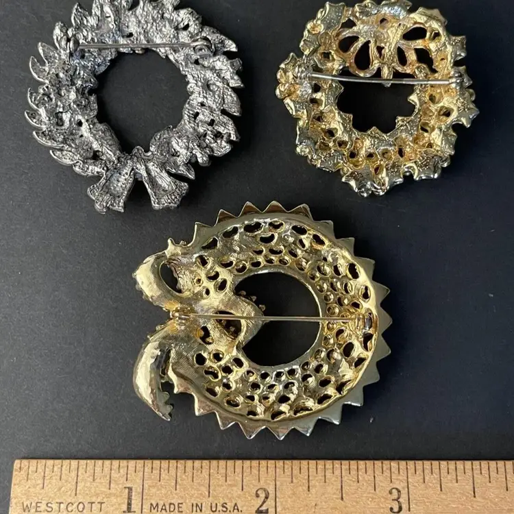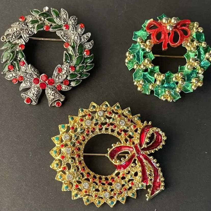 This is a CRAFT LOT OF 3 CHRISTMAS WREATH BROOCHES. All are fully functional.