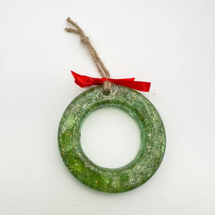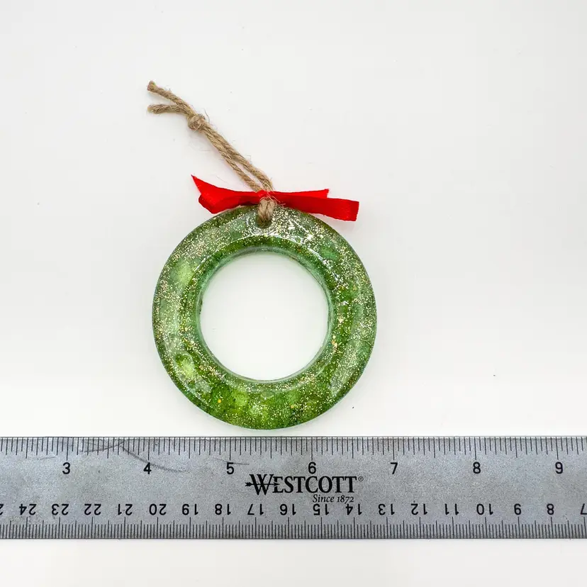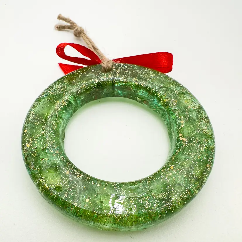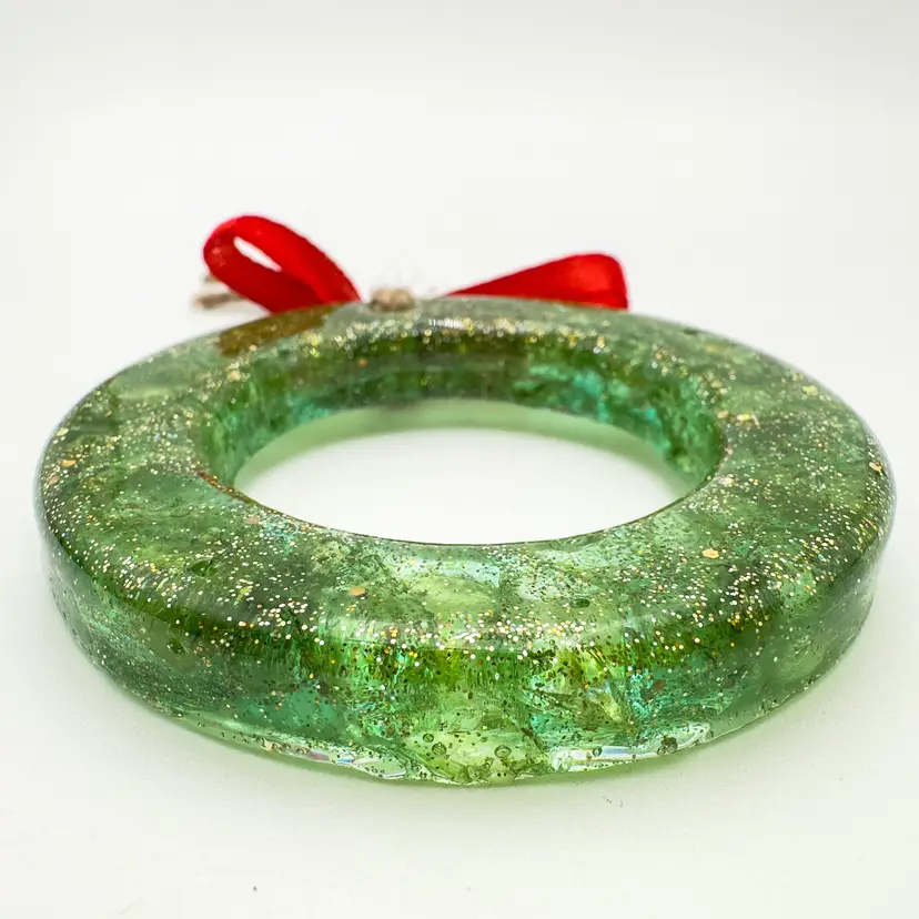 3" D Excellent condition, new, hand poured resin Features green colored resin with gold glitter and green crushed glass