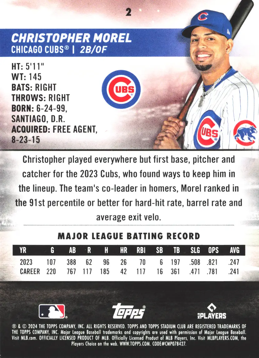 1st time buyer? Get $5 Off with code DISTRICT5 at checkout! Card as shown. All cards $20 and under ship PWE via lettertrackpro [https://www.letter-track.com/registerap.asp?AFID=8757] Sport: Baseball Set: 2024 Topps Stadium Club Card Name: Christopher Morel - Chicago Cubs Card Number: 2 Player/Athlete: Christopher Morel Team: Chicago Cubs