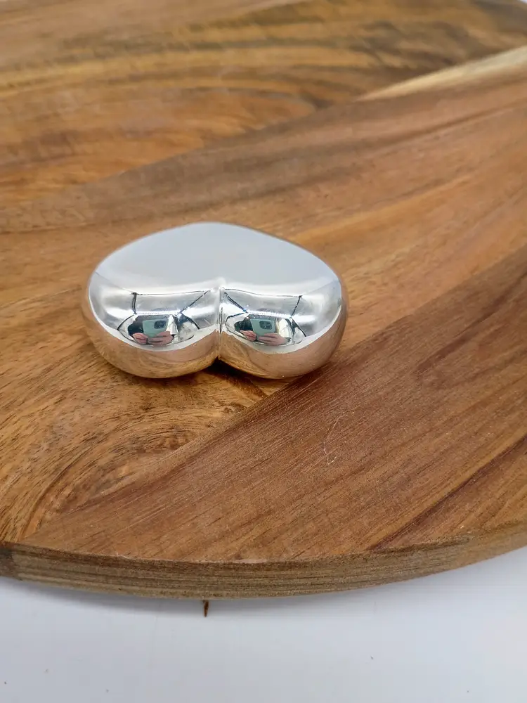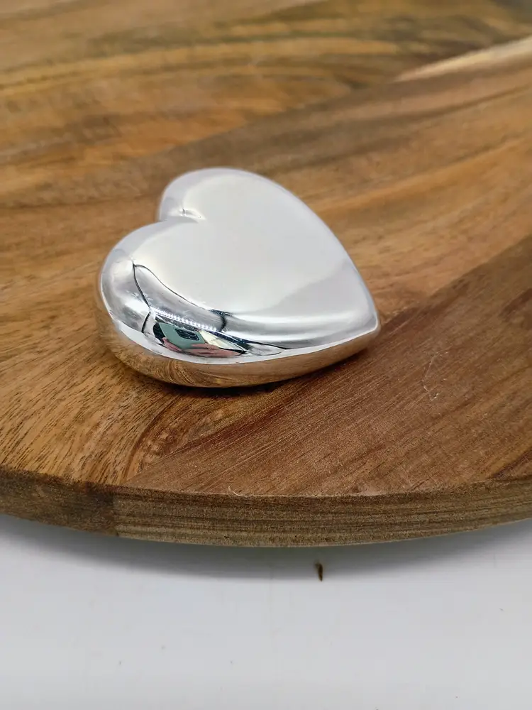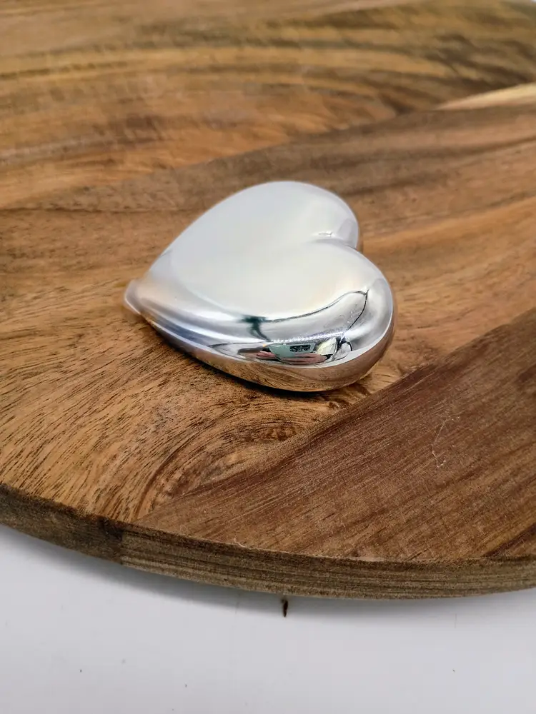 Chrome Plated Heart Shaped Paperweight . This is unmarked for country of origin or maker. But it is solid and heavy for its size. Across the heart is 2.25 inches. 2 inches top to point and is about 1 inch thick .Bottom has felt backing there might be a mark under that but I'm not peeling off the felt.This is preowned, No dents or dings no damage to finish.Excellent condition. Ships USPS