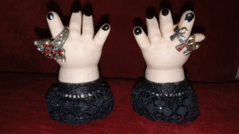 These ring/trinket holders are handmade, a one of a kind, set of 2 hands from a vintage porcelain doll. The nails have been painted with black nail polish. Wrists decorated with new black lace trim. Glued to a plastic base and felt backer to protect furniture. They don't hold too many rings, but could you really live with yourself for covering up those chubby cuties?! About 3 inches tall. Makes a charming conversation piece on your coffee table or an unexpected gift for your gothic punk friend.