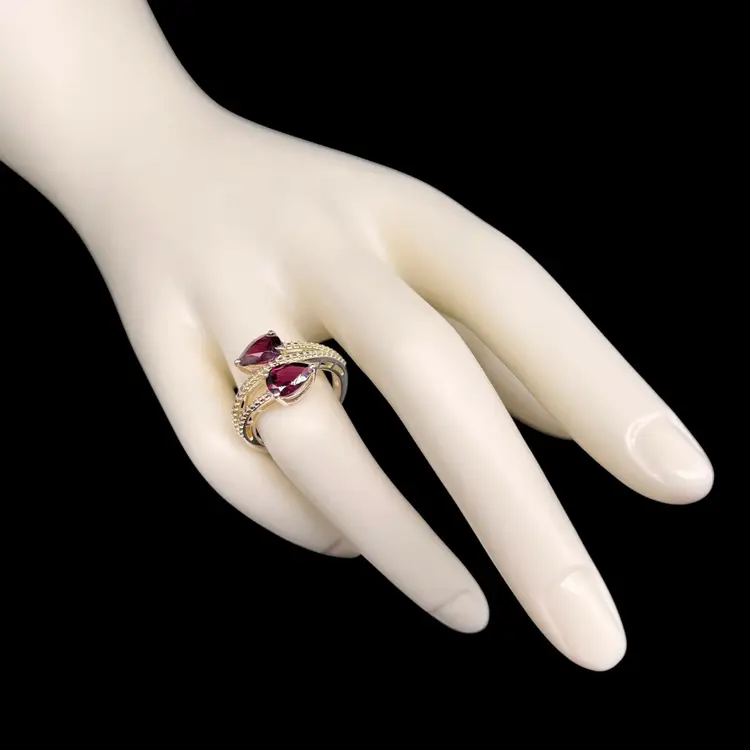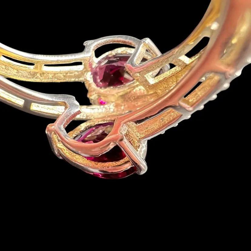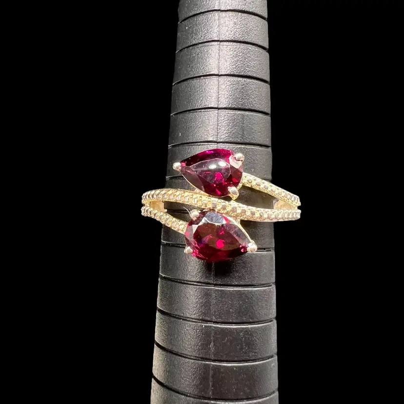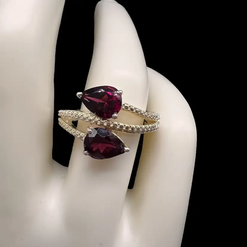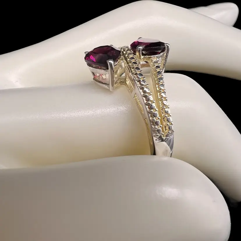 This stunning ring by Chuck Clemency features 2 pear cut red garnets, with a spiral band design. The ring is crafted from 925 sterling silver and is signed by the artist. The gemstones are set in a prong setting and the ring is available in size 7. The ring is perfect for a variety of occasions including Mother’s Day, anniversaries, and birthdays.