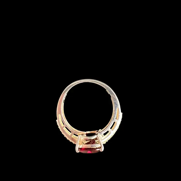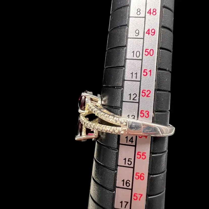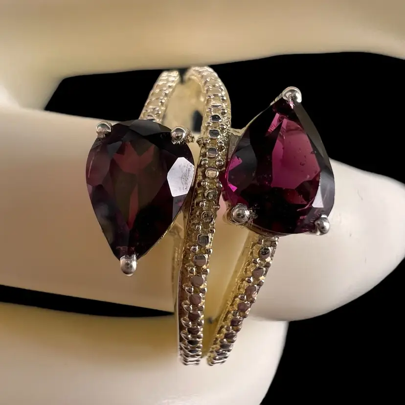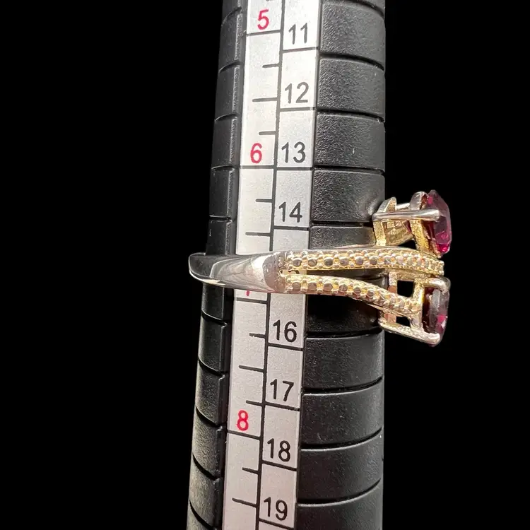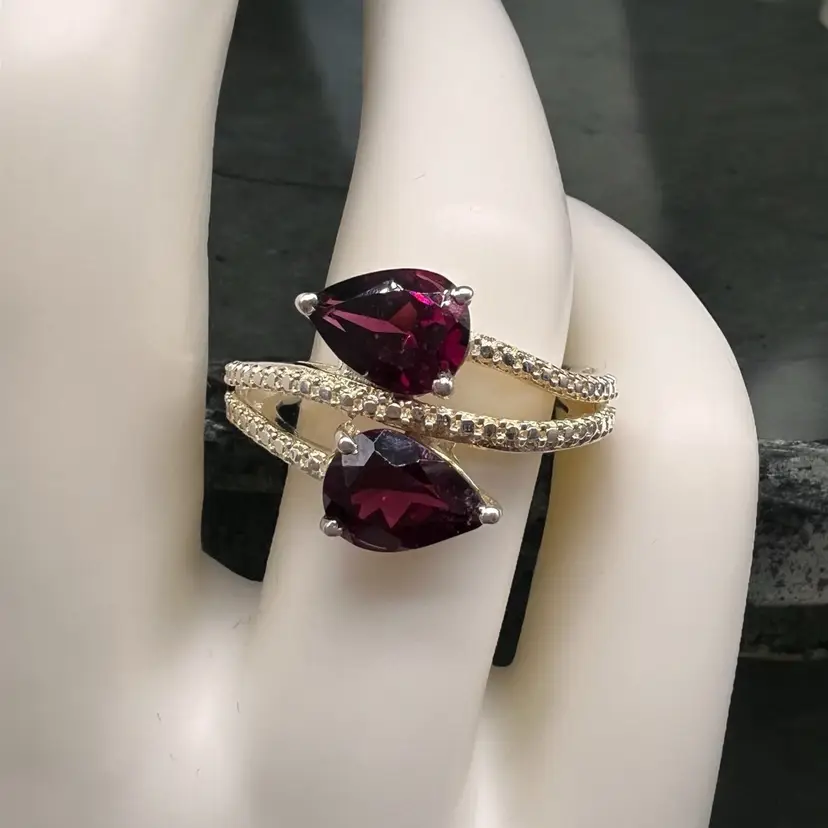 This stunning ring by Chuck Clemency features 2 pear cut red garnets, with a spiral band design. The ring is crafted from 925 sterling silver and is signed by the artist. The gemstones are set in a prong setting and the ring is available in size 7. The ring is perfect for a variety of occasions including Mother’s Day, anniversaries, and birthdays.
