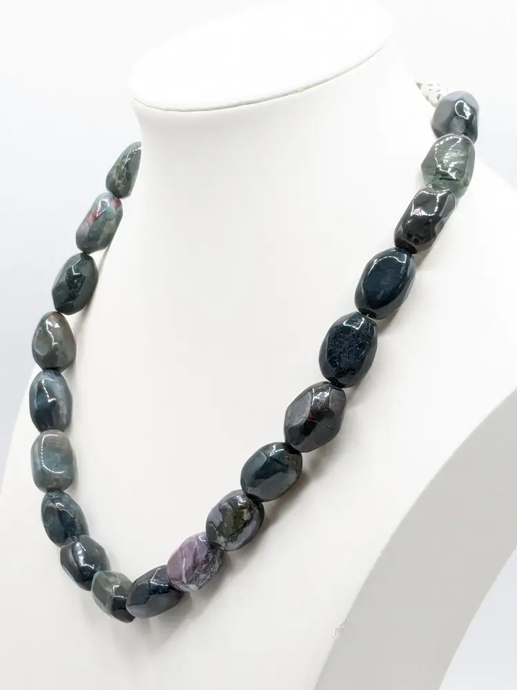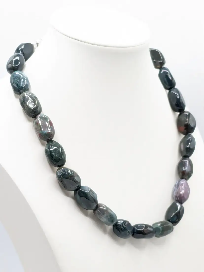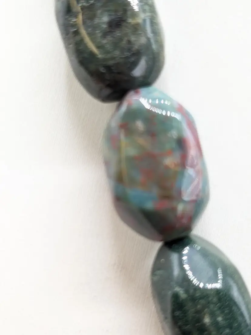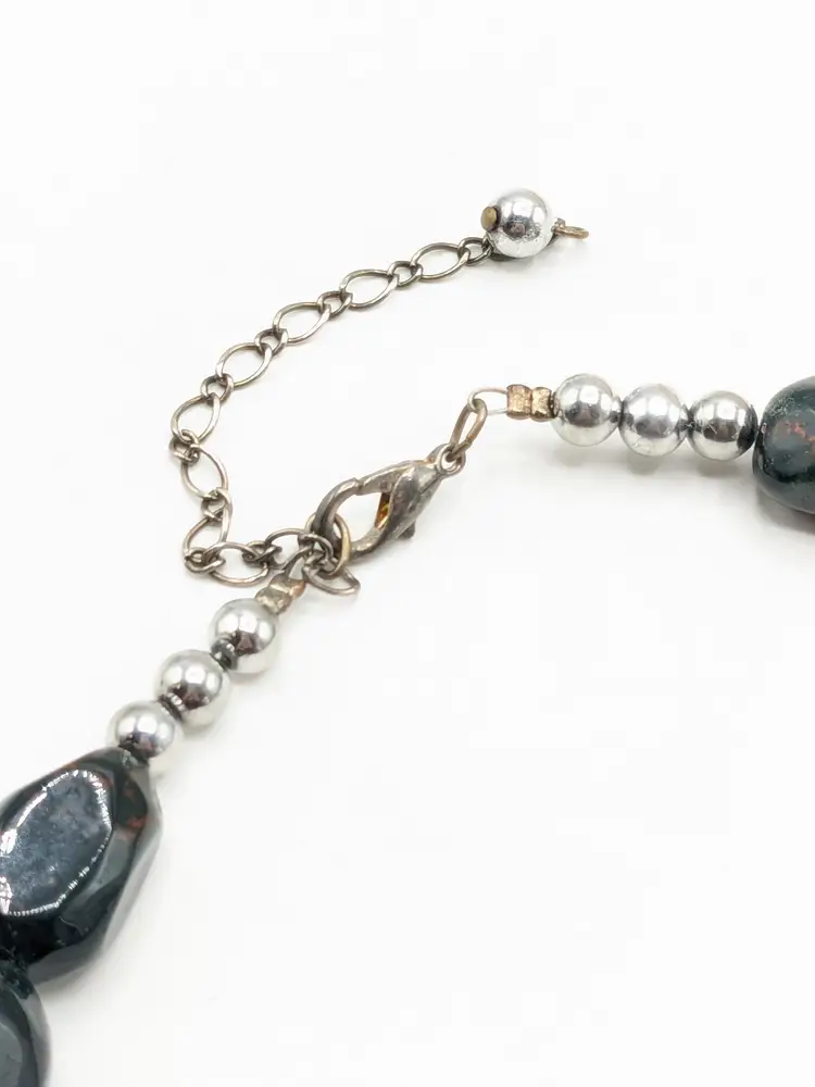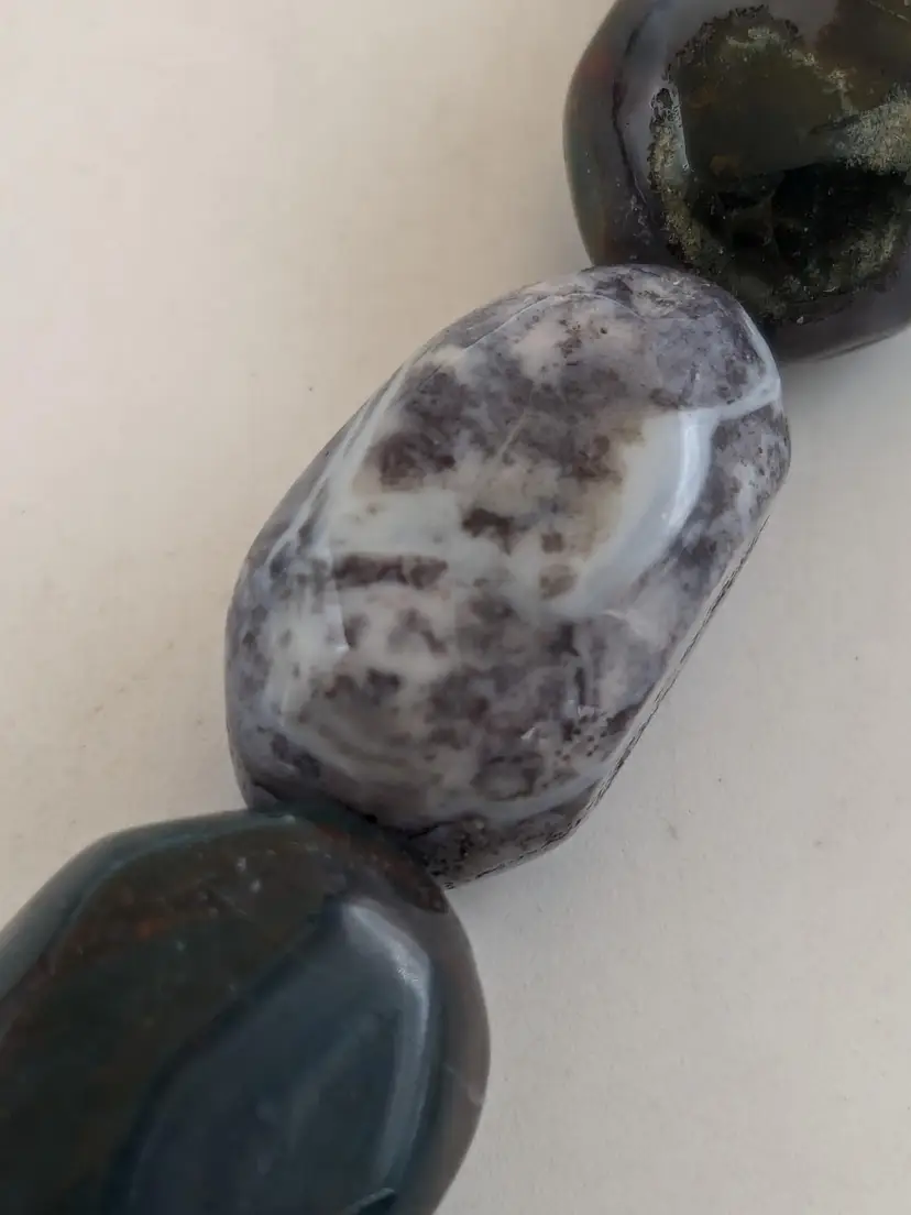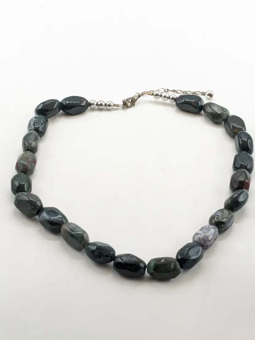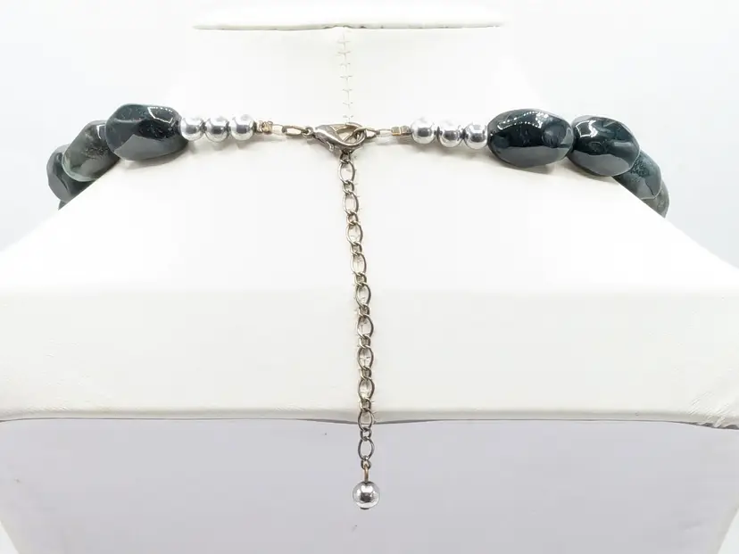 Good condition. Features large, polished gemstones with a mix of earthy tones. Measures approximately 18 inches long with a 3" extension. EN2