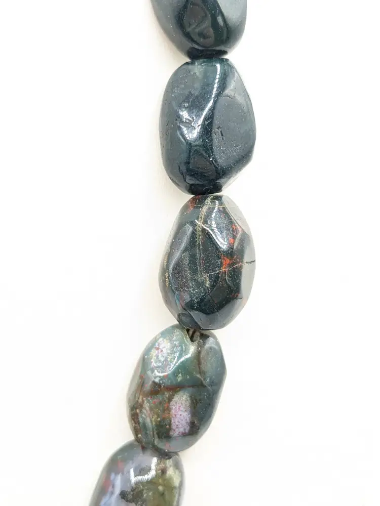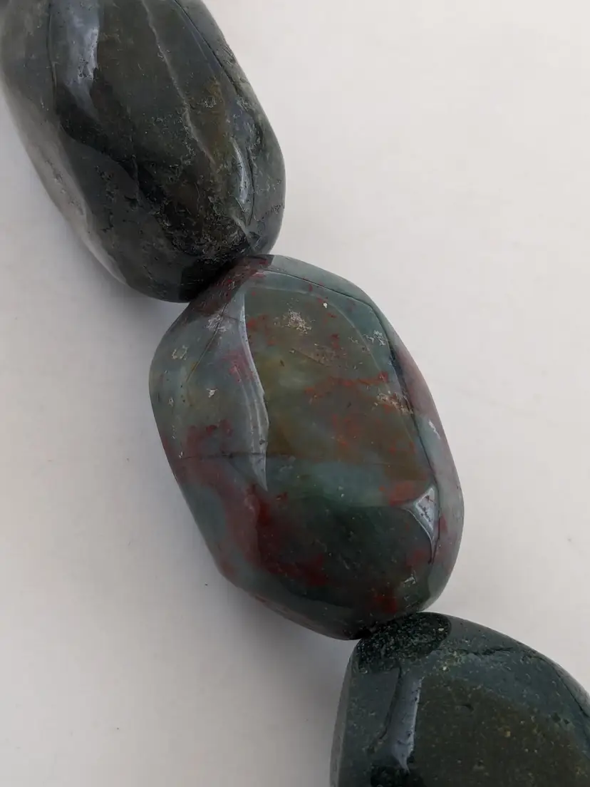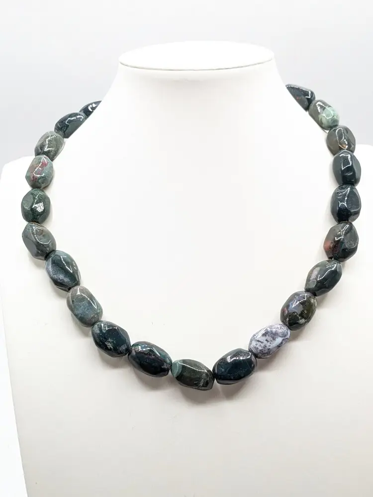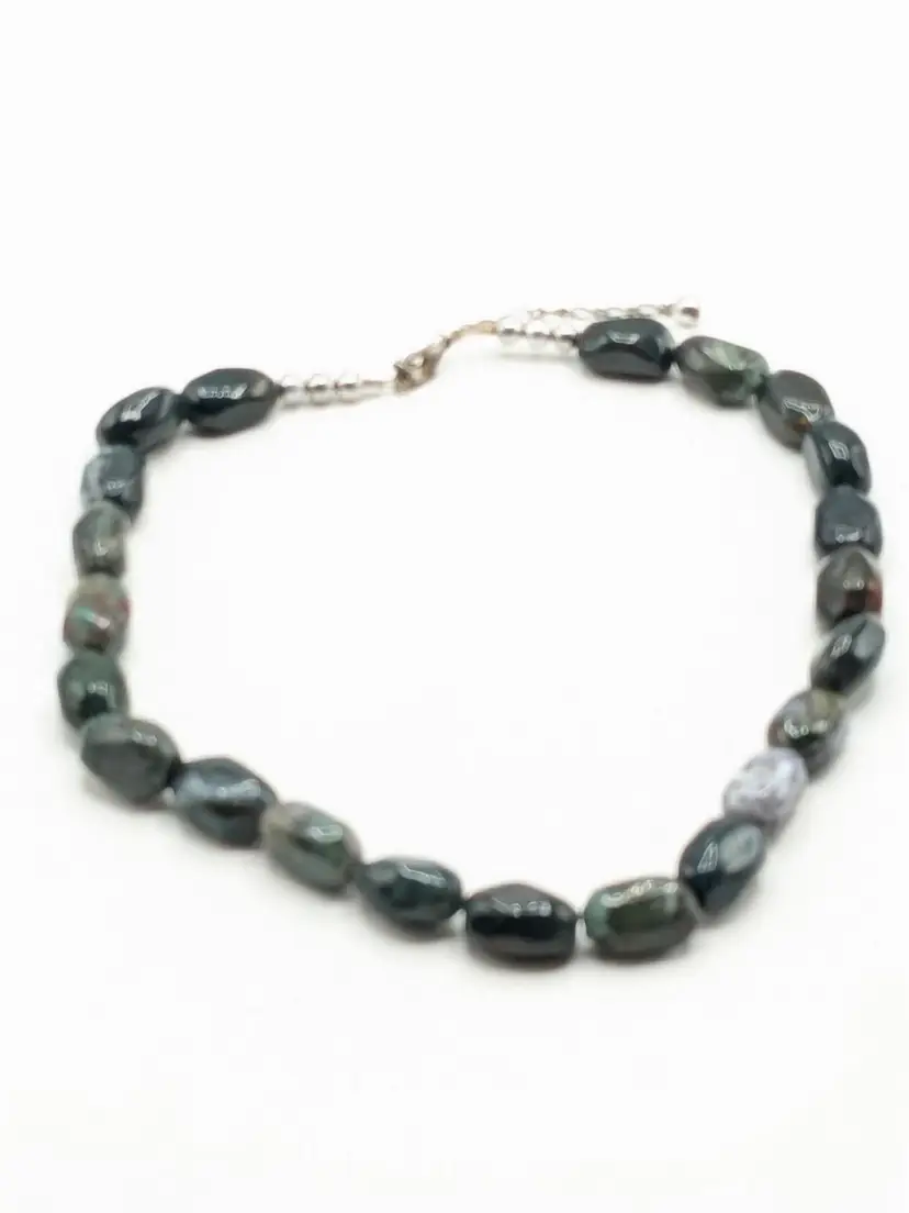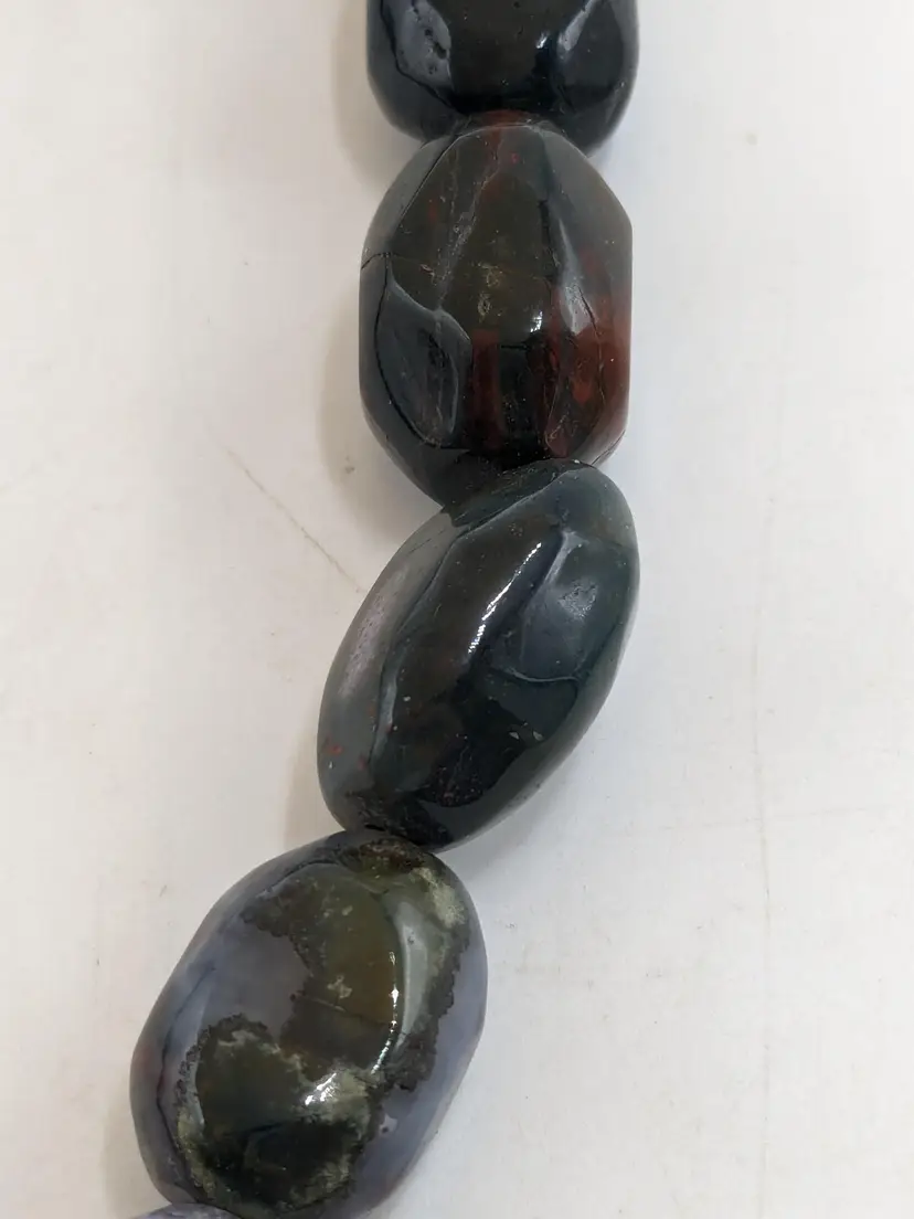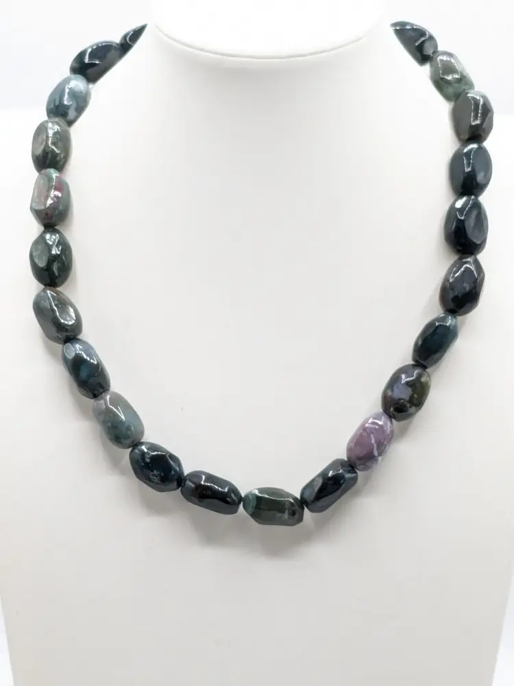Good condition. Features large, polished gemstones with a mix of earthy tones. Measures approximately 18 inches long with a 3" extension. EN2