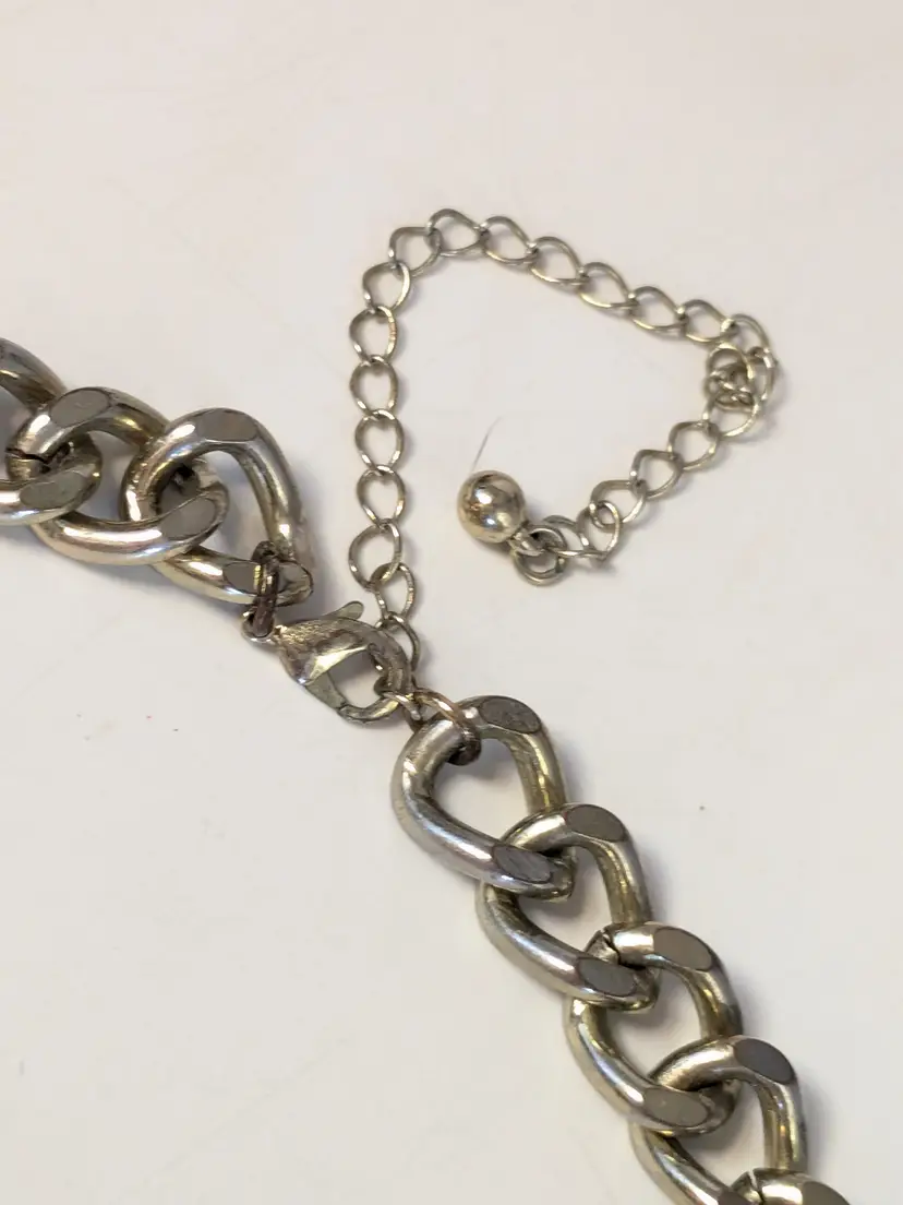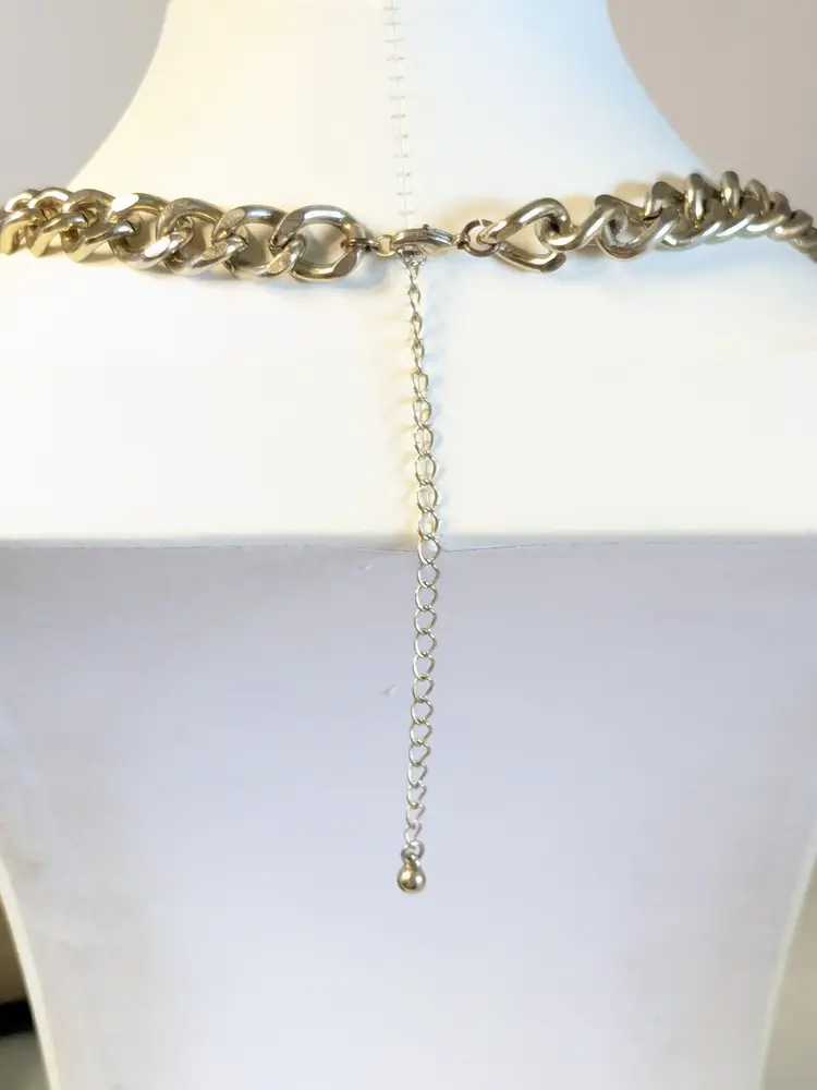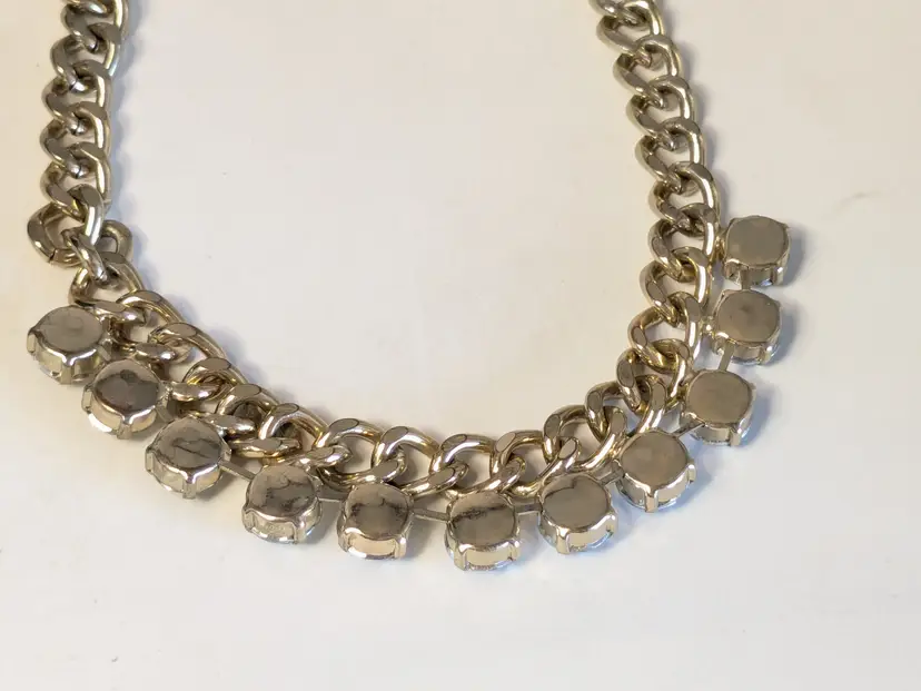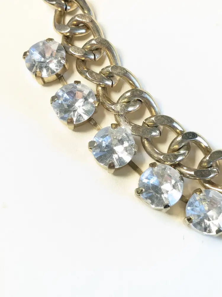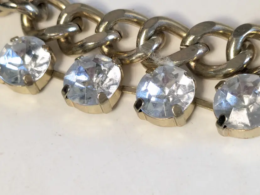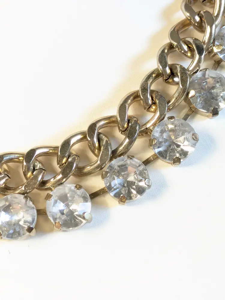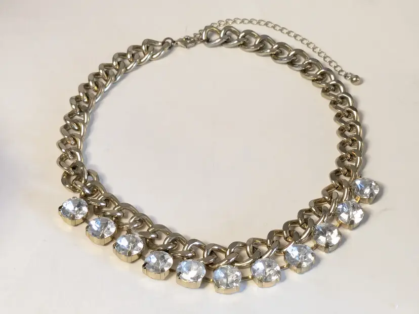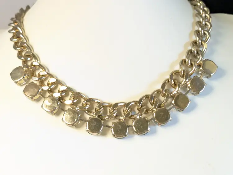 Good condition. Gold tone is bright and shiny with no color loss. Prong set rhinestones are sparkly and all present. Chain measures 16" with a 4" extension. Stones are 1/2". wen