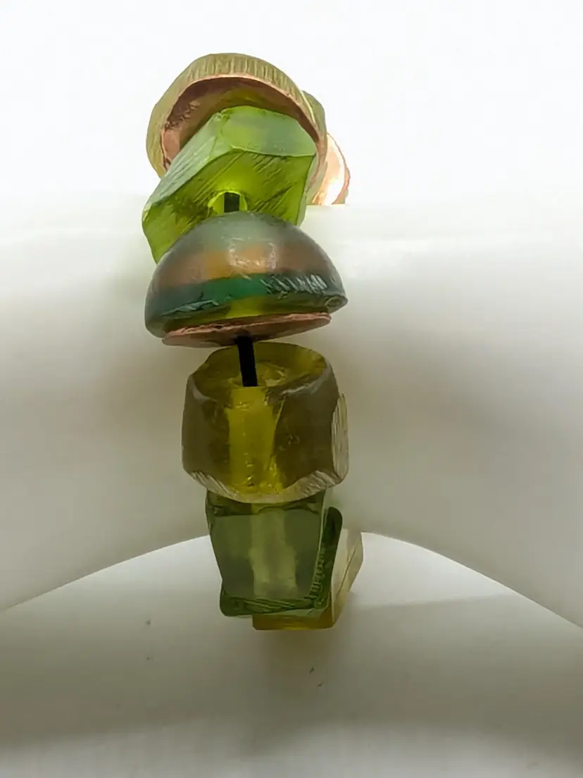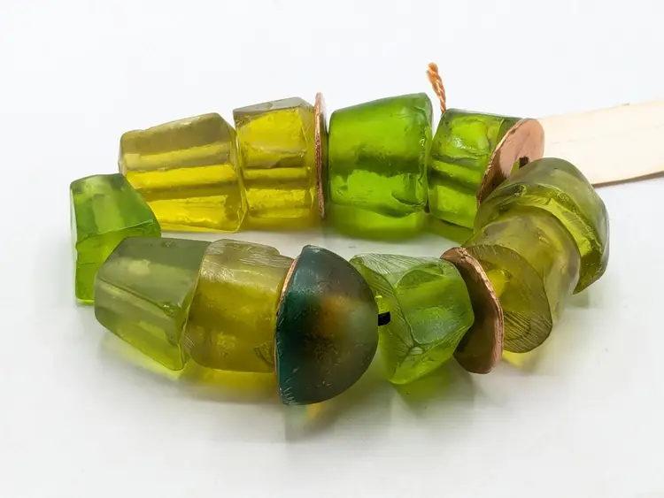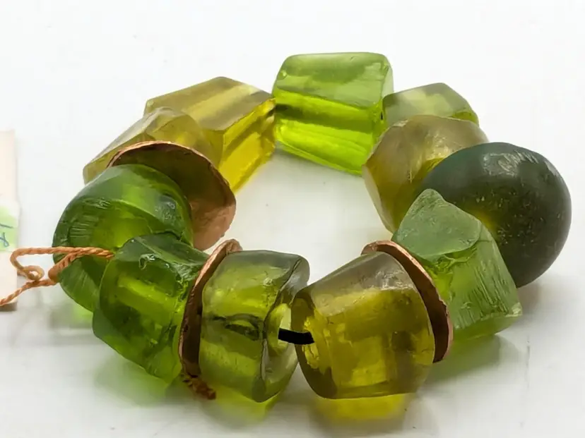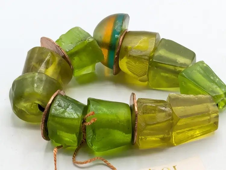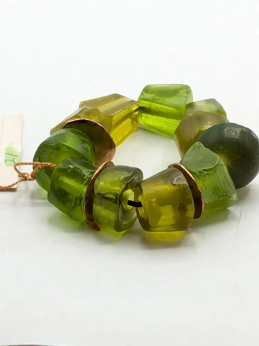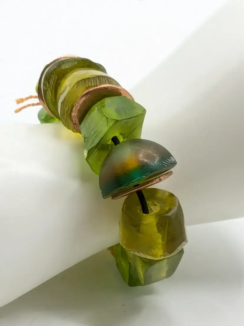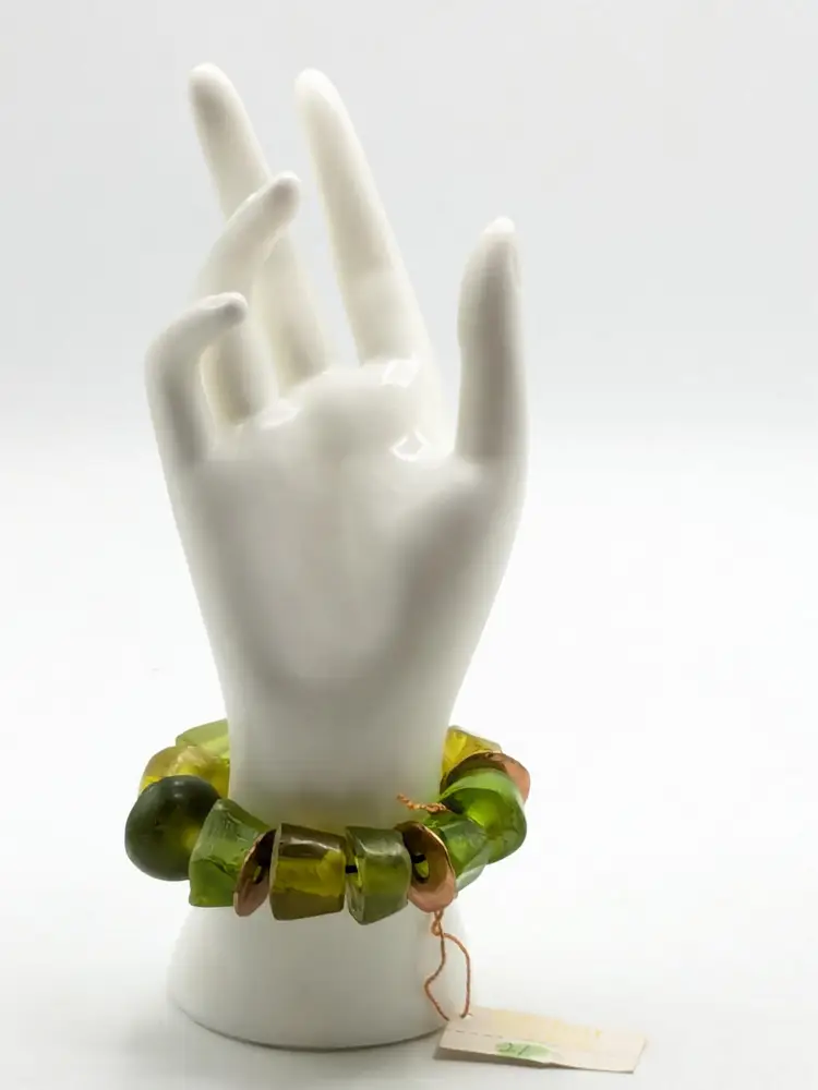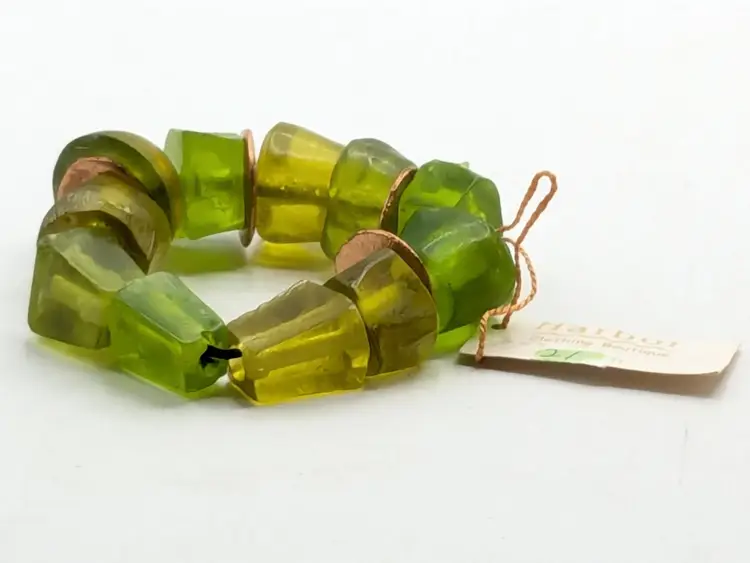 Good condition. Unique and vibrant, this bracelet features chunky green beads with eye-catching copper accents. Perfect for adding a pop of color to any outfit. Size 6 but is a stretch bracelet. New old stock. (EN2)
