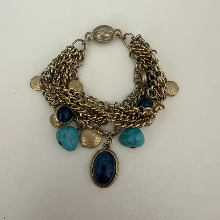 Chunky Metal Charm Bracelet With Blue & Turquoise Toned Stones Pre-owned