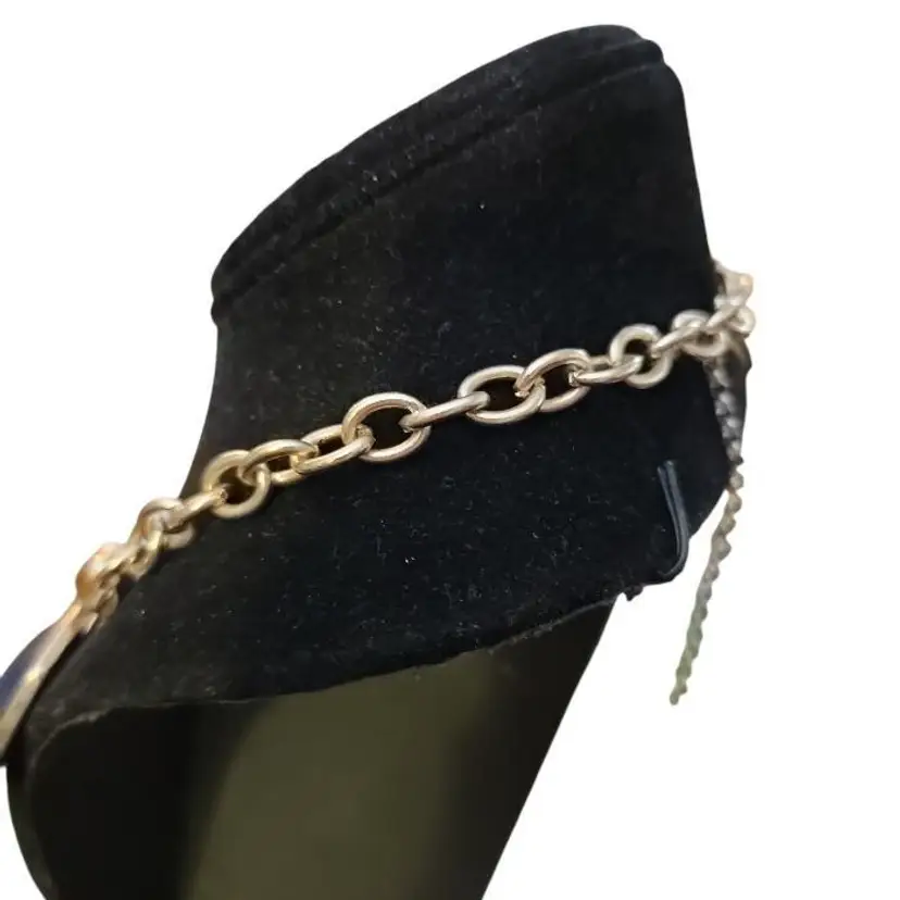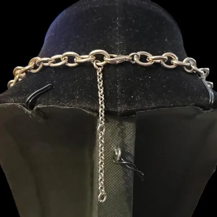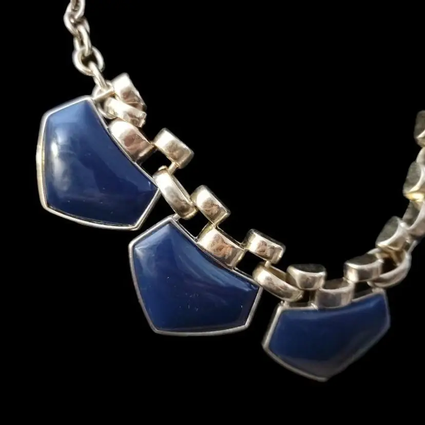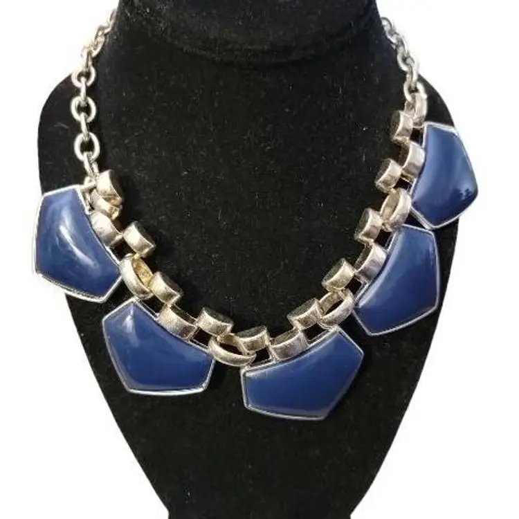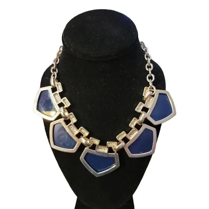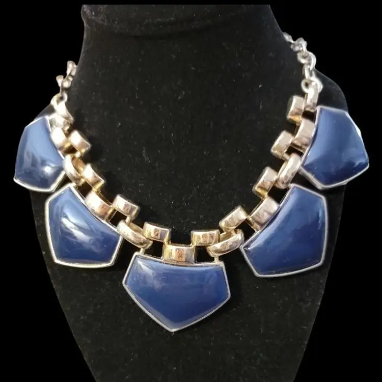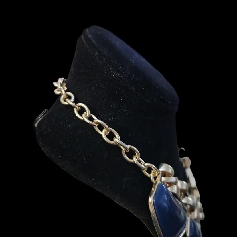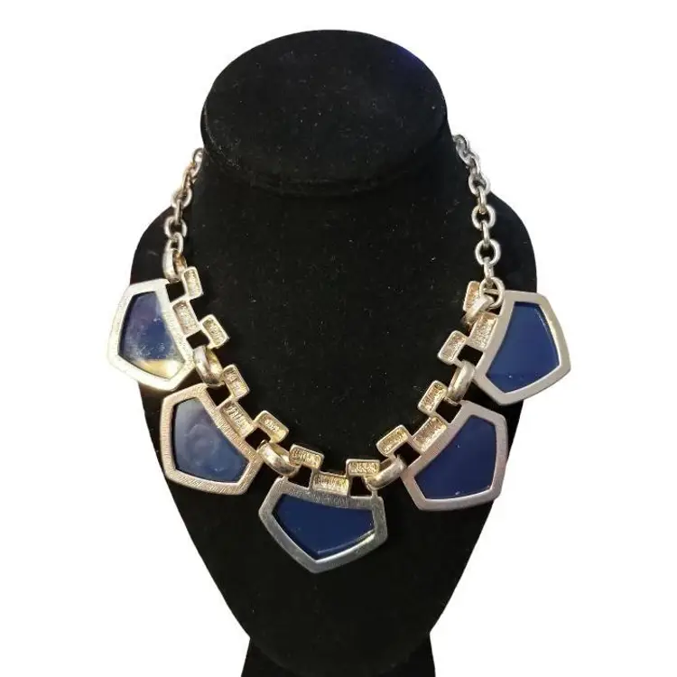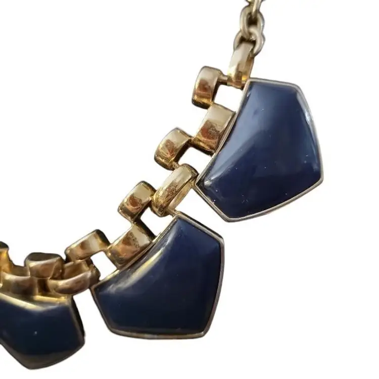 Make a statement with this bold navy blue vintage chunky geometric necklace. This 14" adjustable necklace is perfect for any occasion with a 2 1/2" extender (actually 2 extenders combined). The gold tone links are vibrant, and the 5 navy blue 5 sided pendants are eyecatching. There is slight wear consistent with normal use and care.