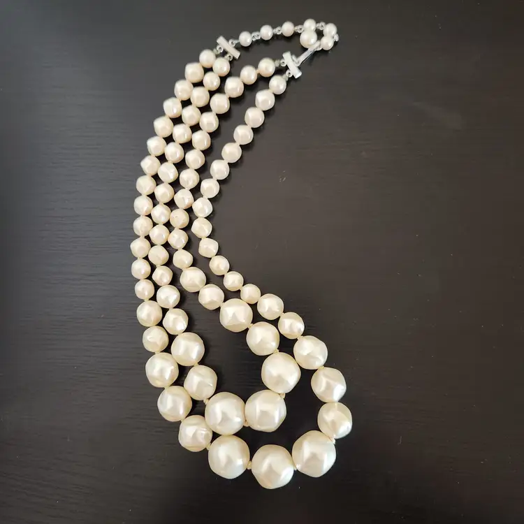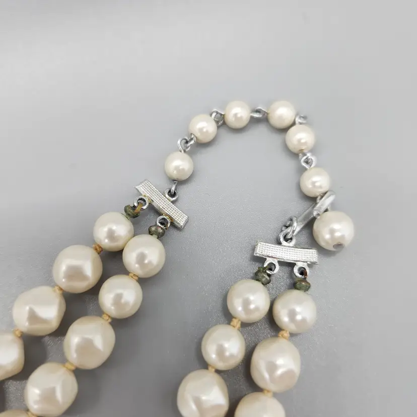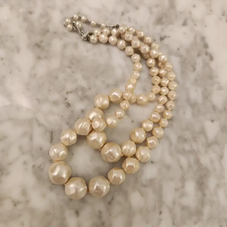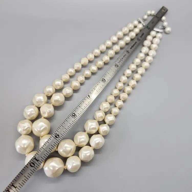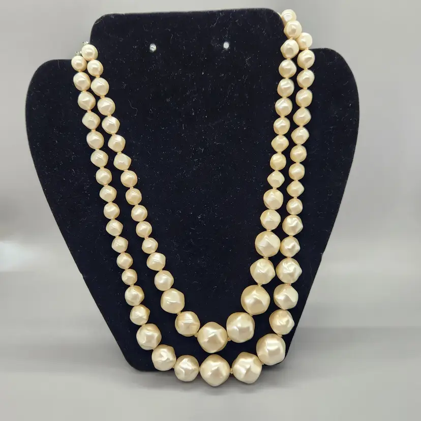 Statement piece from the 1950s or 60s, likely Jackie Kennedy inspired. Graduated double strand beads, the largest being 3/4" w. These have a beautiful pearl iridescence and are marked Japan on the closure hook. These are adjustable from approx. 17 - 21" l Comes in a new jewelry box w ribbon, great for storage or for gifting.