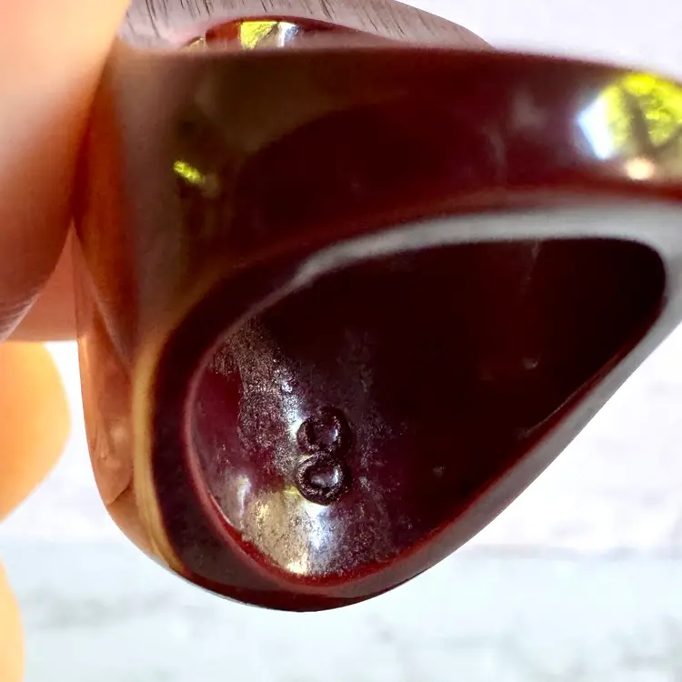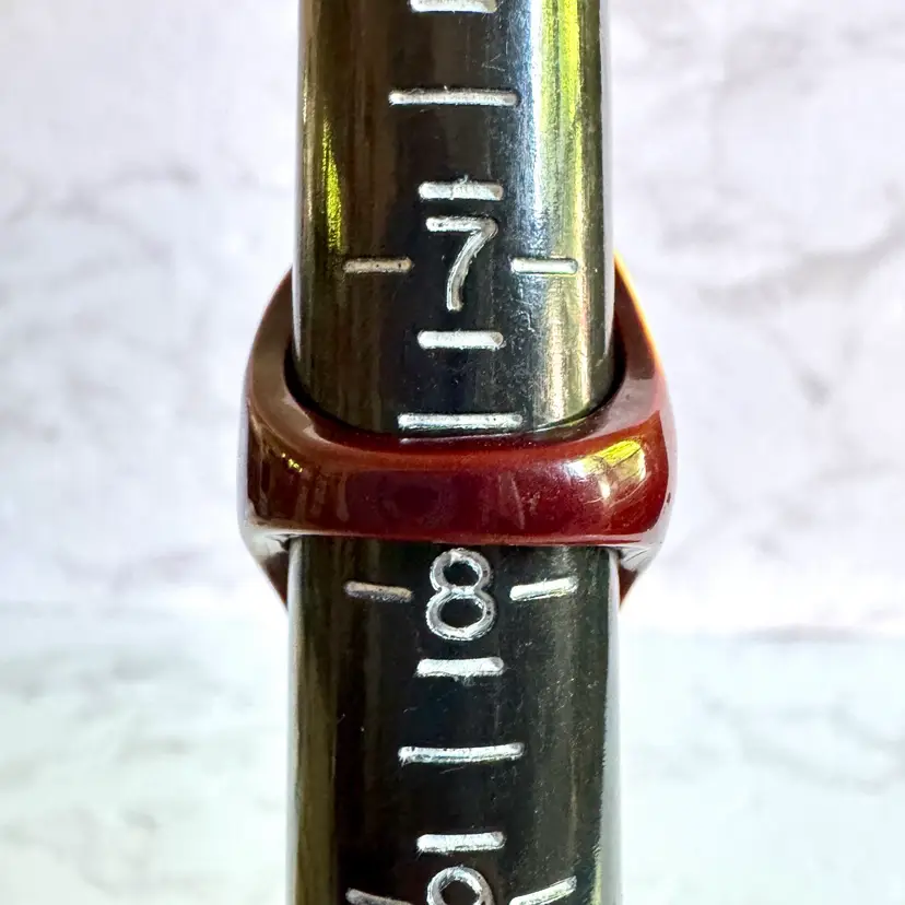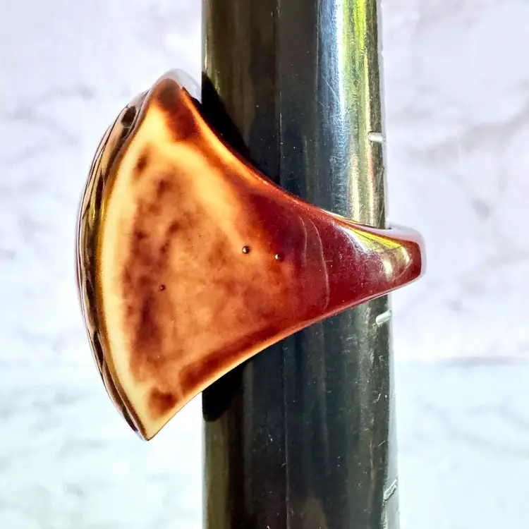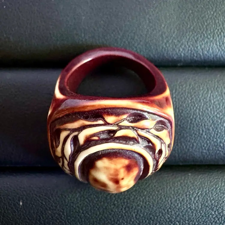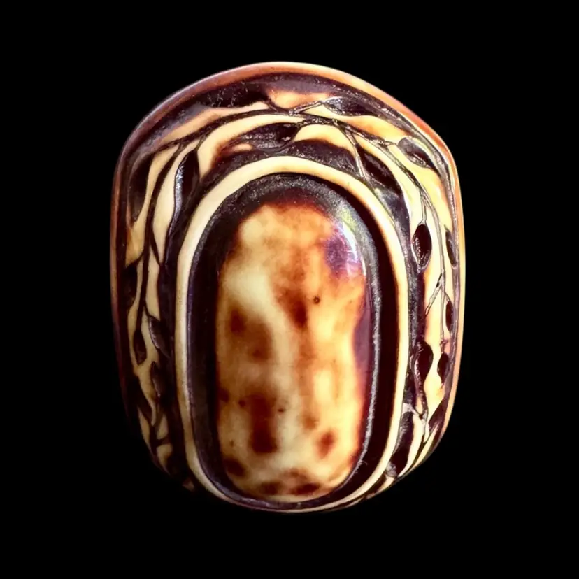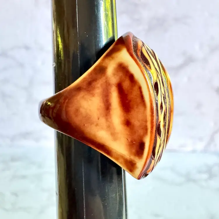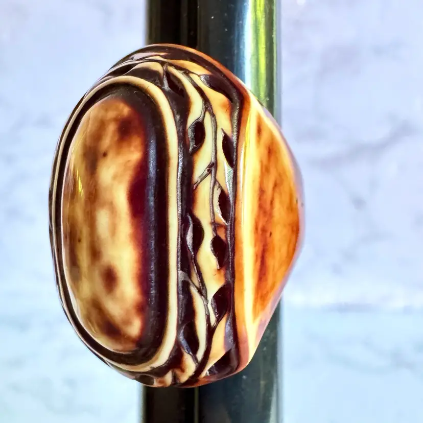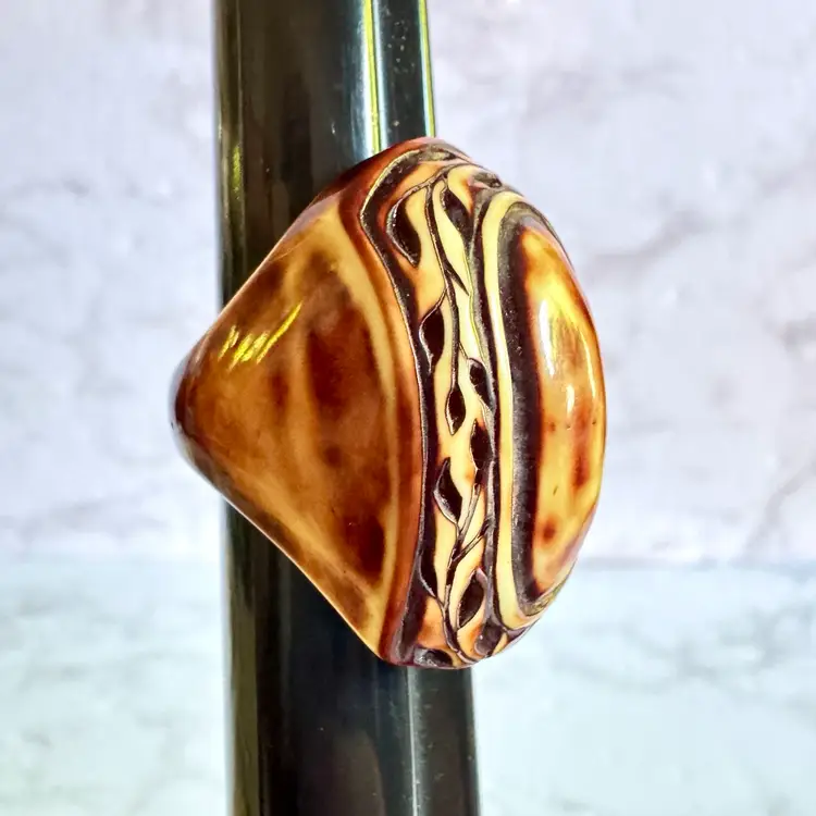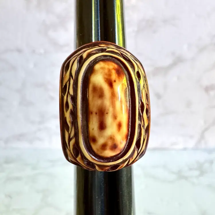 Unique hand-carved tagua nut ring, size 7.75, featuring an oval design with intricate patterns. A sustainable, eco-friendly piece with a rich brown and cream finish, perfect for adding a natural touch to any collection.