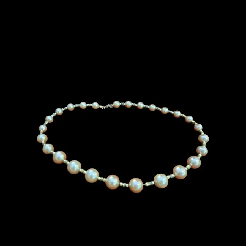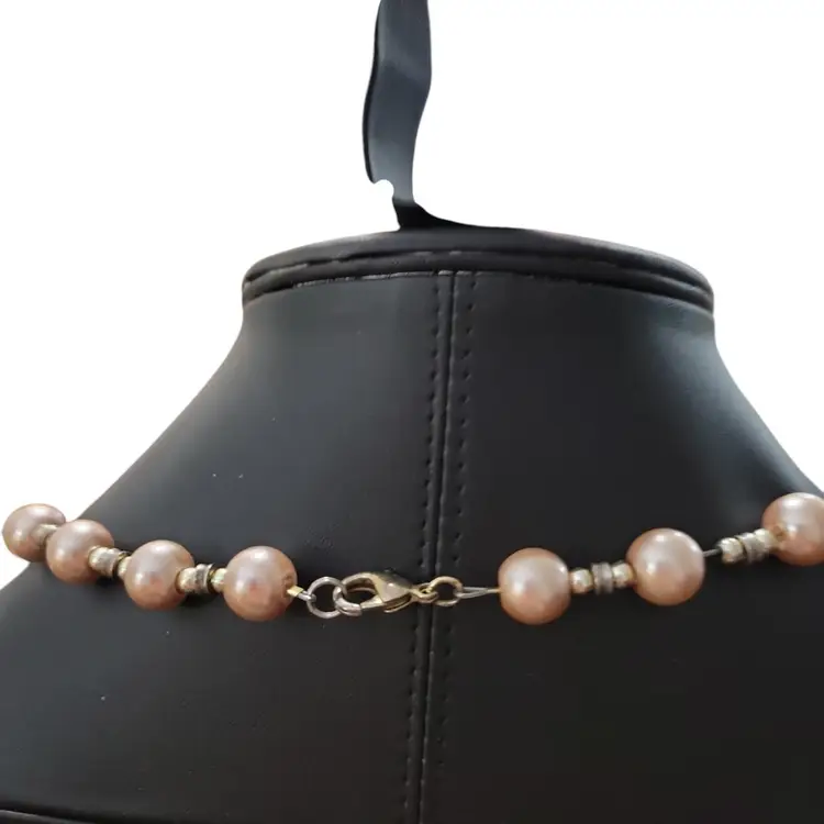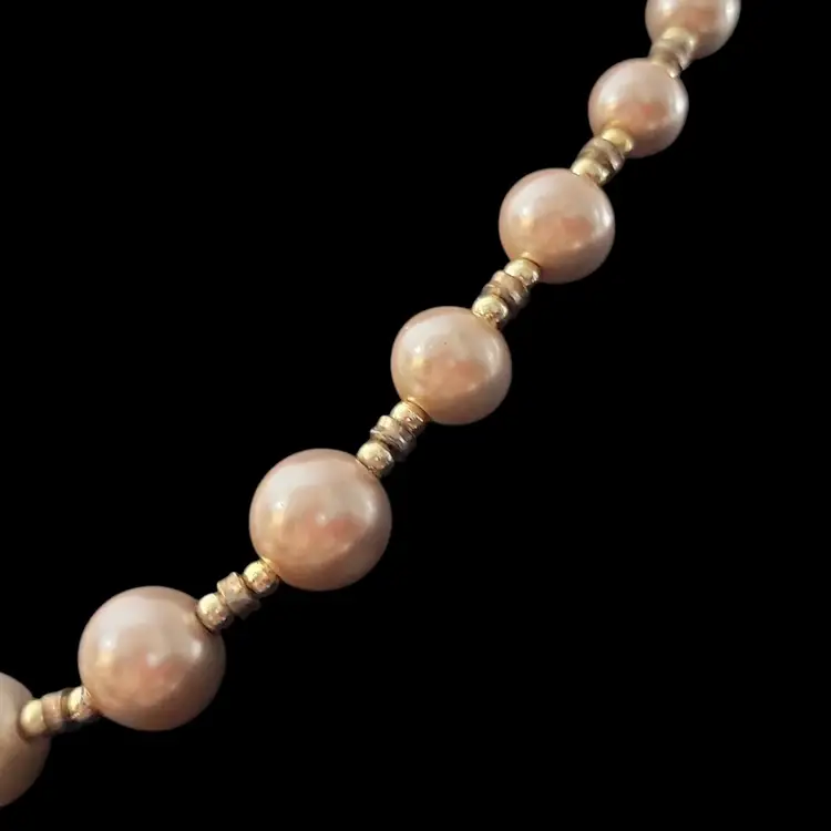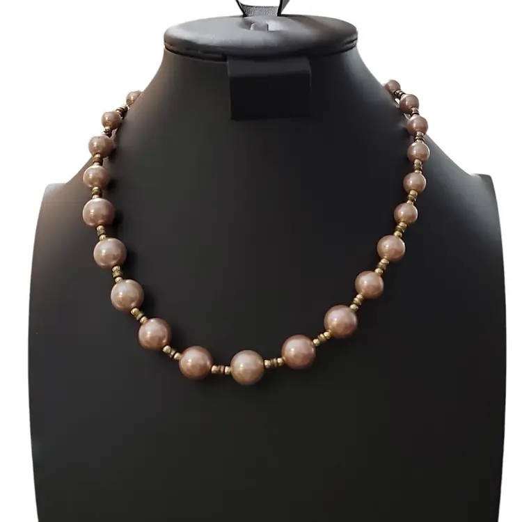 Elevate your style with this 19" chunky vintage faux pearl necklace. The necklace features a beautiful beaded design and is made of high-quality non-glass material with a slight pink color and gold tone metal rondelles. It is perfect for any occasion, whether it's a night out or a casual day at work.