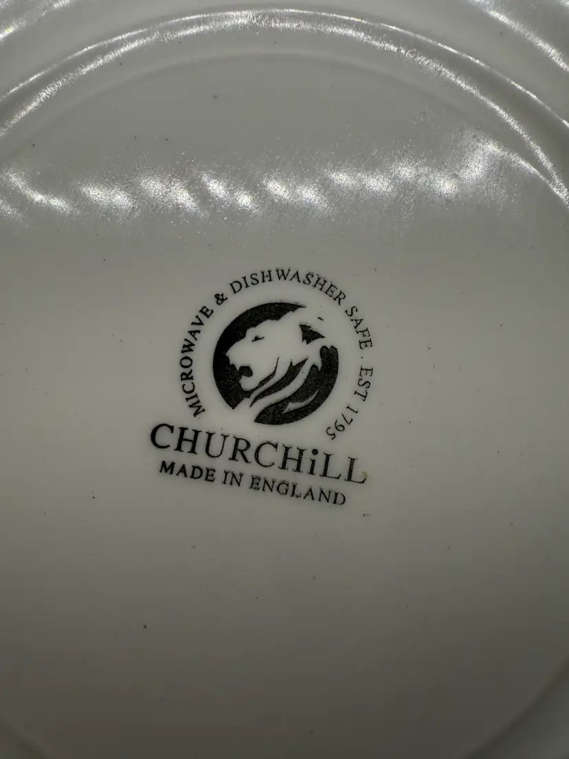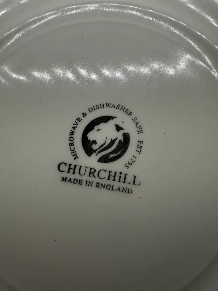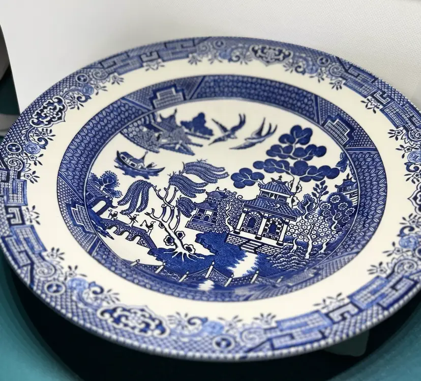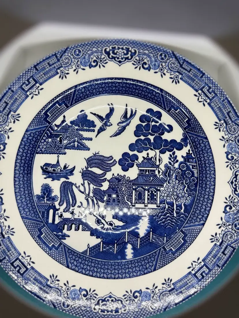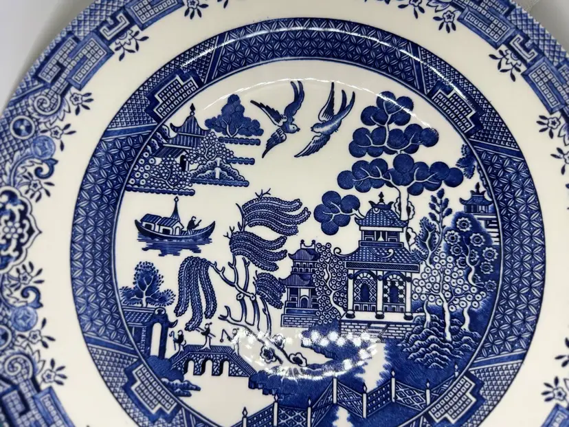Made in England Classic Blue Willow dinner plate featuring deep cobalt blue transferware scenery with pagoda, willow tree, boat, and bridge details. No visible cracks, scratches or chips
