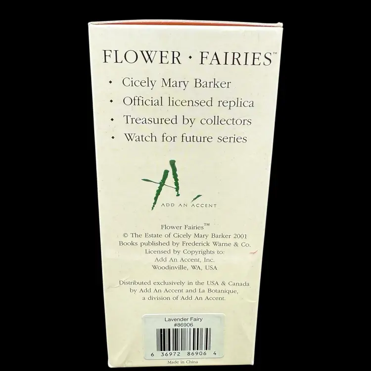 The Cicely Mary Barker Flower Fairies Series 1 Lavender Fairy 86906 is a figurine from the popular Flower Fairies brand. This fantasy-themed collectible features a fairy design inspired by nature, specifically the Lavender flower. Made in China, this decorative piece is a delightful addition to any fairy or fantasy-themed collection. Perfect for fans of mythical and magical creatures, this figurine brings a touch of whimsy and charm to any space.