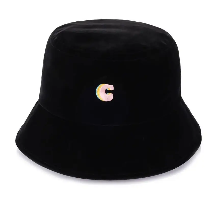 Cider logo bucket hat. Black velvet with the C for Cider embroidered on front in pink, yellow and blue. Soft luxurious velvet sheen in black, sleek bucket hat design. Perfect for day outings and casual occasions. Black velvet super soft 7 1/4 - 7/38. Hat size is 56-58 cm and is equivalent to a US hat size of 7/14-7 3/8, circumference of 22-23 inches. Hand Wash, Steam press if necessary. Versatile, stylish, black velvet hat, black bucket hat, everyday wear, touch of whimsy, touch of luxury, soft velvet fabric, comfortable, any time hat, hat, black hat, bad hair day, casual or dressy.