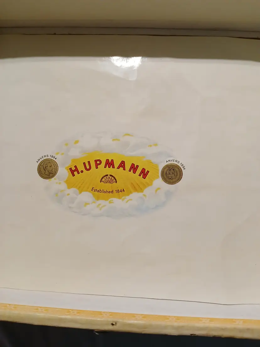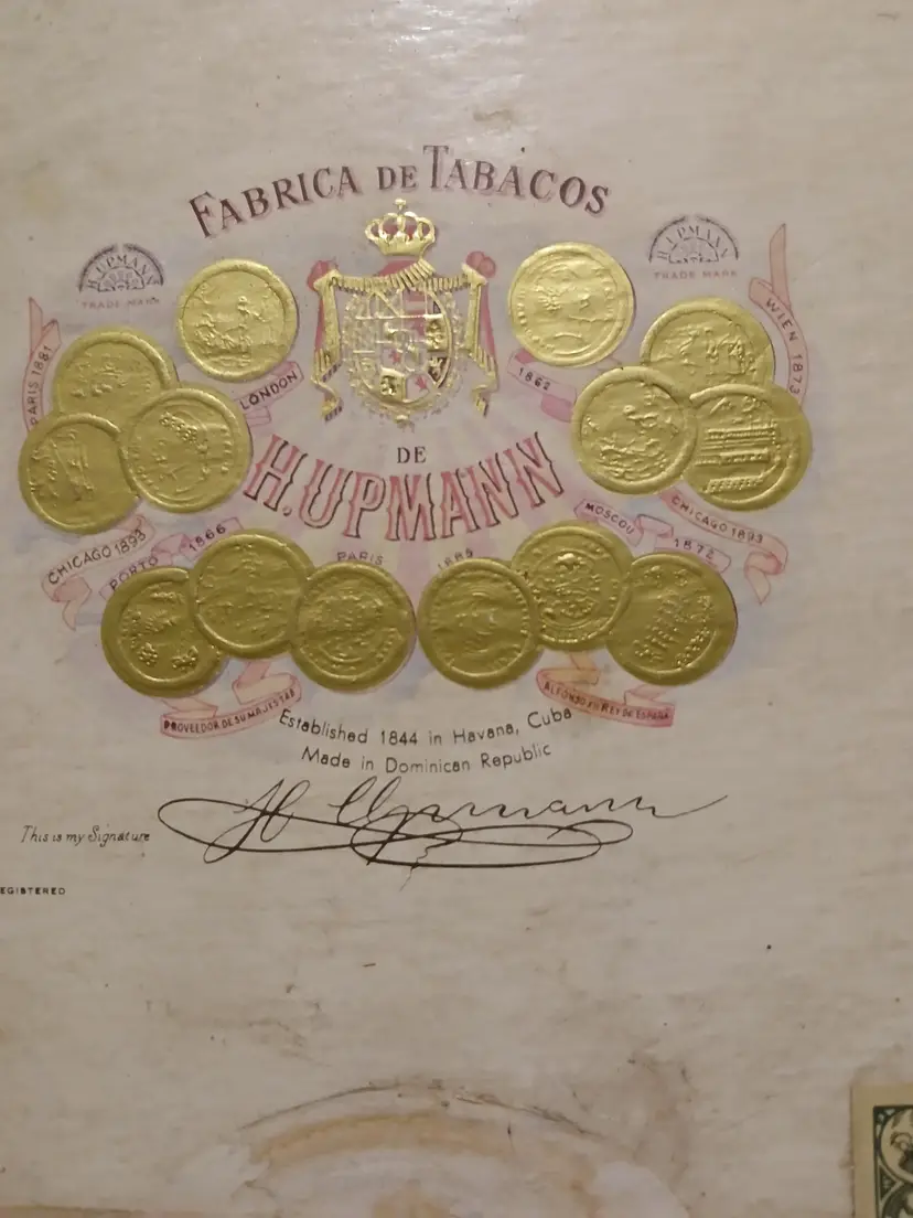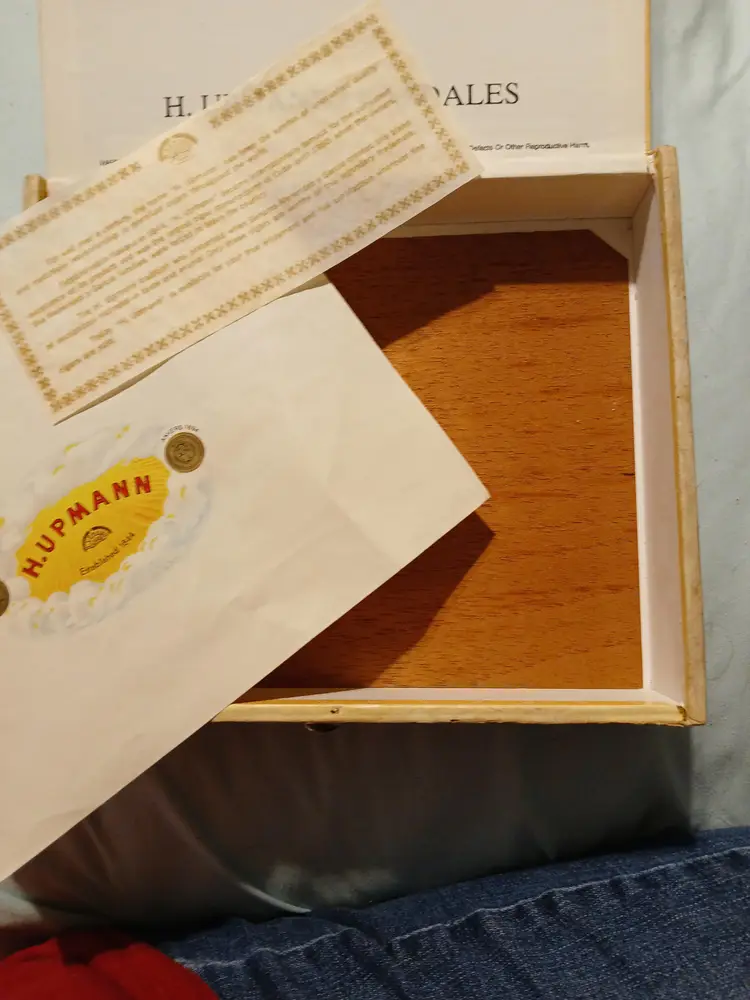 Wooden cigar Box covered in paper.Has a little wear and tear. See photos. Contains original papers. See photos. Ships USPS.