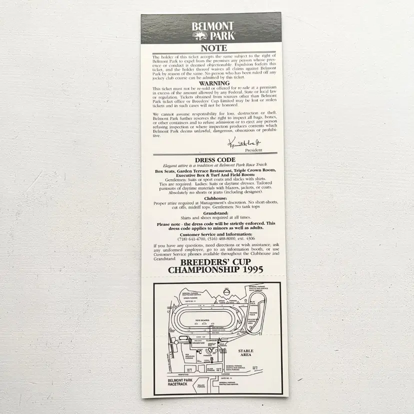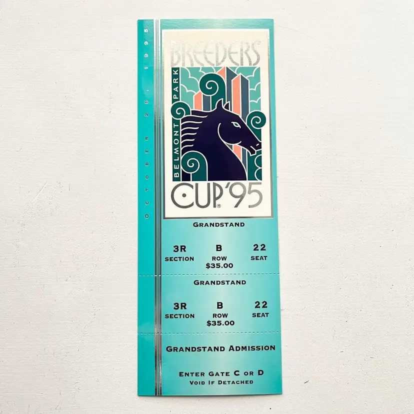 Cigar Horse Racing Belmont Park Racetrack Breeders Cup Ticket 1995 Vintage 1990s Thoroughbred Horse Racing Belmont Park, New York October 28, 1995 Cigar career wins included the 1995 Breeders Cup Classic, NYRA Mile, Jockey Club Gold Cup, Woodward Stakes, Oaklawn Handicap, Hollywood Gold Cup and more. Condition: Full Ticket Measures 8 inches x 3 inches Packaged in a plastic sleeve inside a rigid envelope Visit my store to see more vintage ephemera, advertising, novelties, gifts, estate sale and yard sale finds https://district.net/u/finderspickerspaper SKU B31