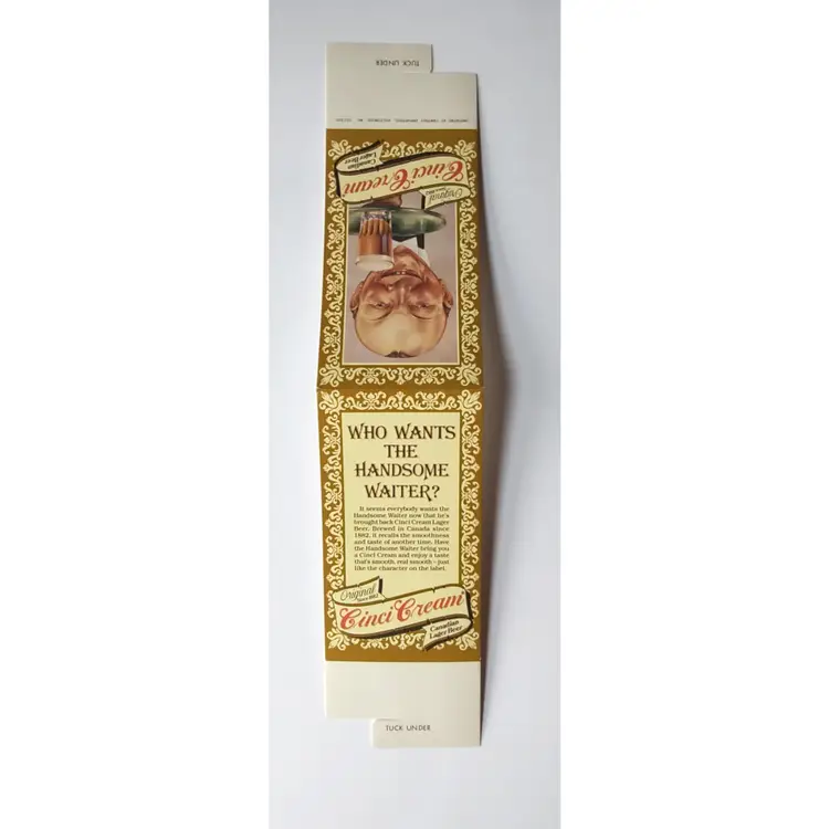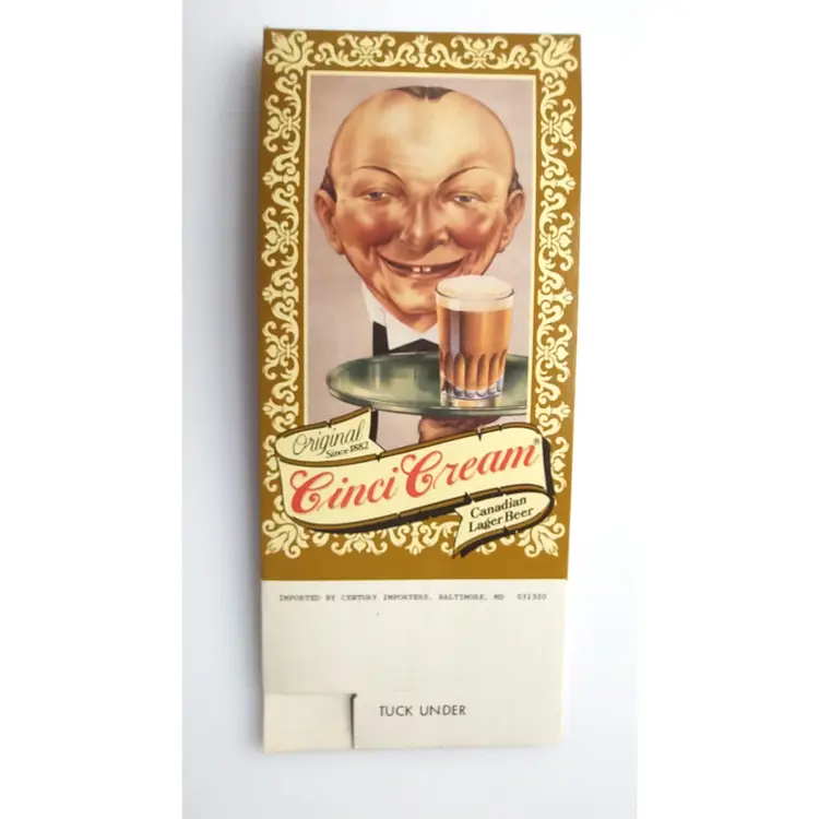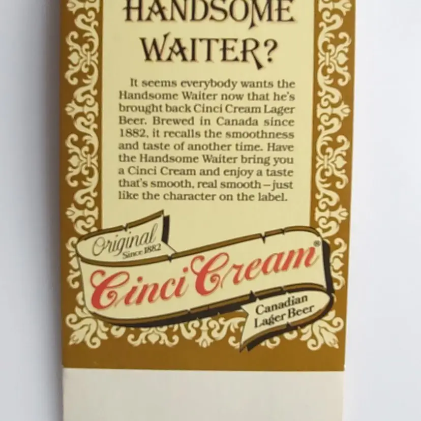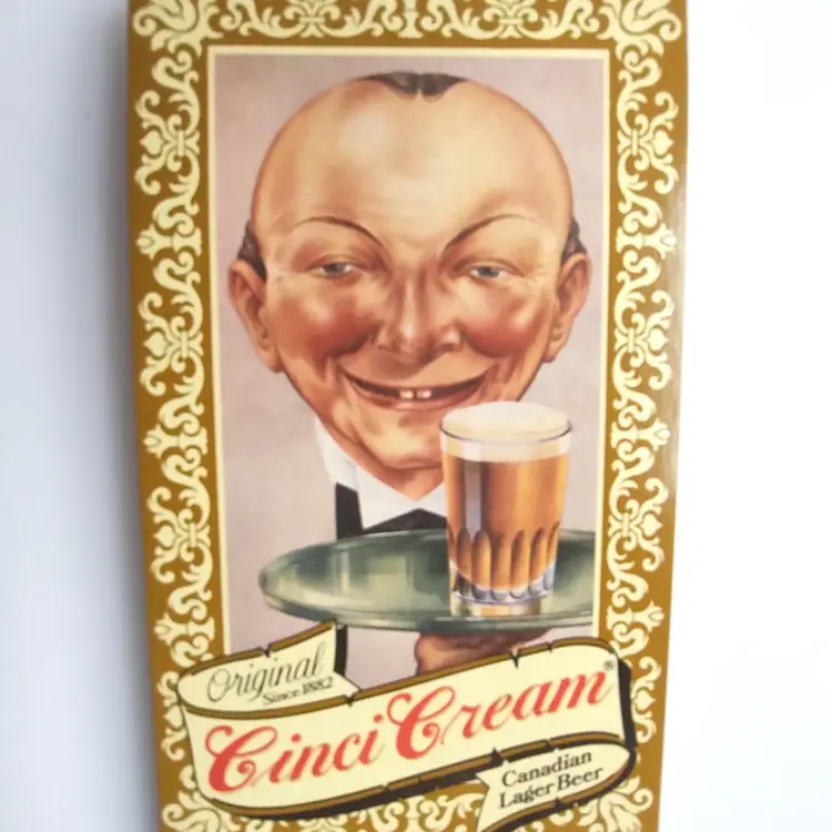 This vintage table sign is a charming piece of ephemera that would look great in any home bar or man cave. The sign features a handsome waiter holding a tray of Cinci Cream Canadian Lager Beer, making it a great addition to any beer lover's collection. Made in the United States, this piece is a testament to the quality of American advertising in the 1960s and beyond. Perfect for collectors of vintage paper and advertising, this Cinci Cream Canadian Lager Beer table sign is a must-have for any fan of retro beer memorabilia. The sign is in great condition, with only minor signs of wear and tear that add to its vintage charm. Whether you're a fan of beer or simply appreciate the aesthetics of vintage advertising, this sign is sure to make a great addition to your collection. Size as shown is 7.5" x 3.25". stock#cinci2-14-2024-box8A
