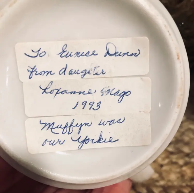 This beautiful mug would be a real treasure for any lover of these sweet dogs. With no chips or cracks, it is in lovely vintage condition and measures approximately 3 3/4 inches tall. One of the special things about this mug in particular, is the little note on the bottom (which I left because I enjoy knowing the history of the previous owner)… little Muffyn must have been well loved.