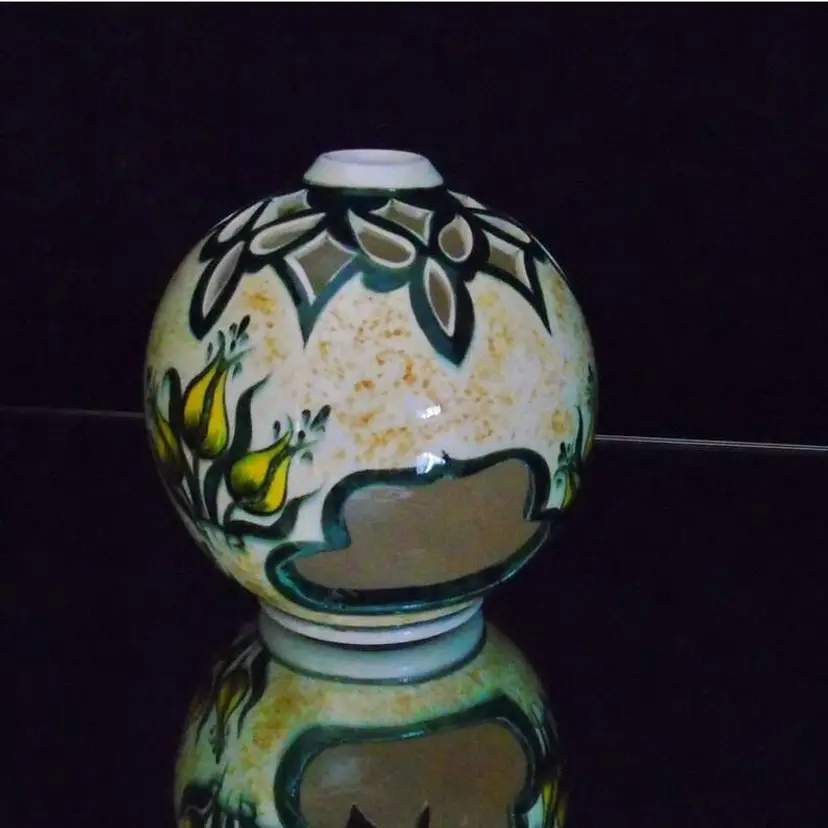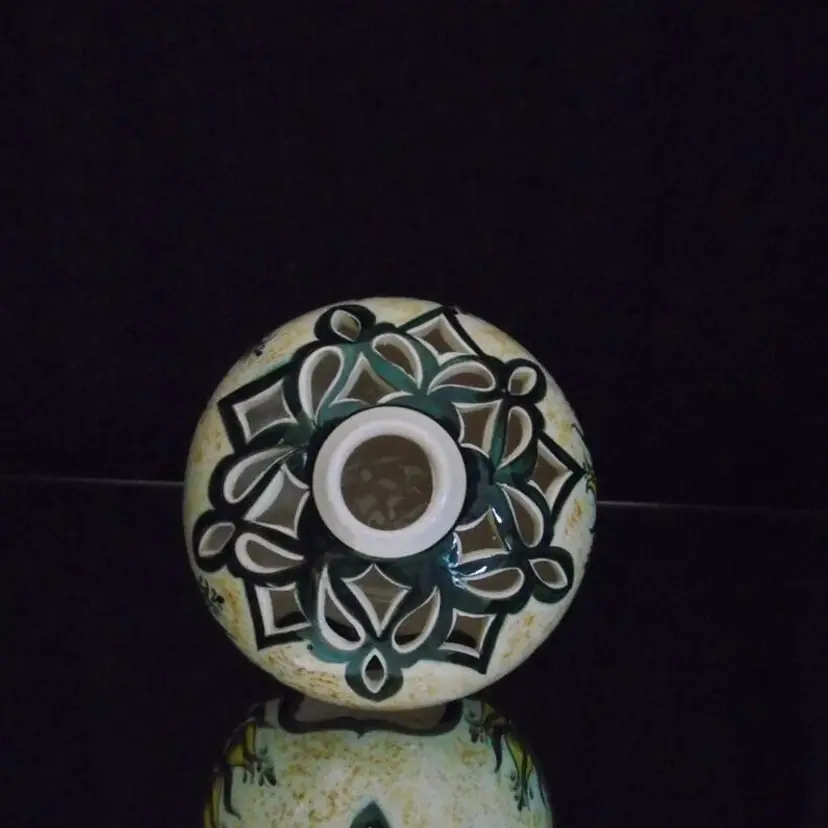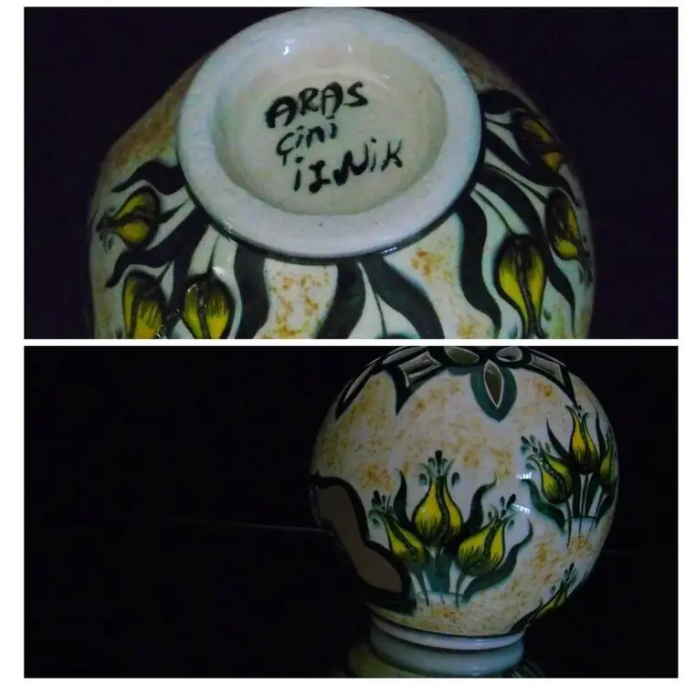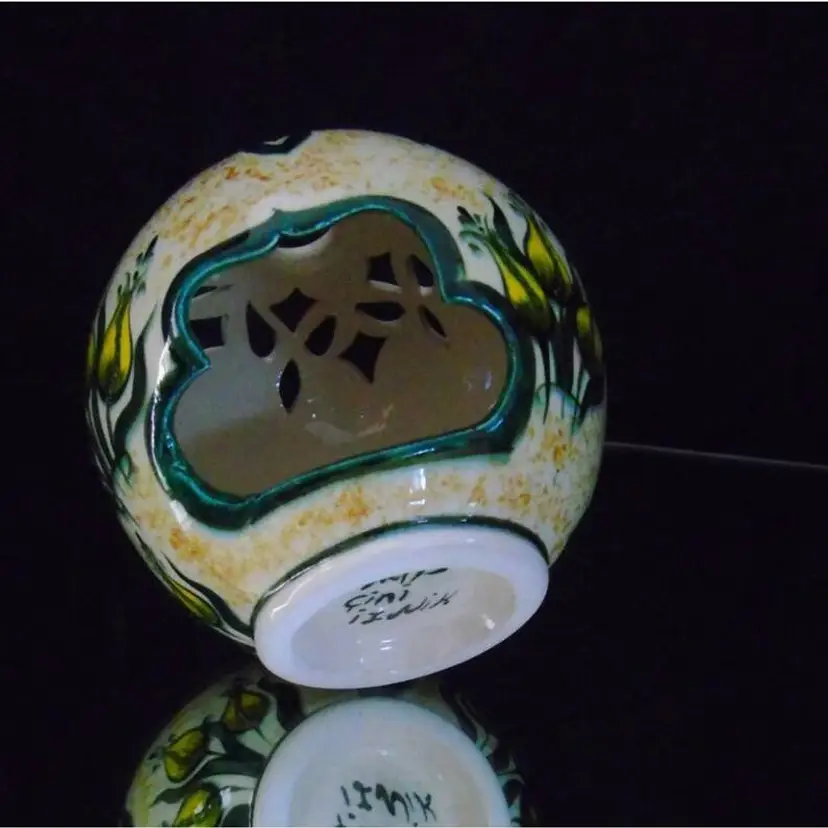 Tea Light Candle Votive Holder Turkish (Chini) Çini Iznik Pottery Aras Signed Bowl Gorgeous Hand Painted Tea Light Holder Cini Pottery in Green Yellow and Beige Signed 5" tall with 15" circumference , 2.5" x 1.75" opening Çini or english "Chini" is the name given to a special quality of ceramic tiles and pottery produced in İznik (historic Nicaea) ,Turkey. These exquisite tiles and pottery, represented the cultural and artistic zenith of the Ottoman Empire Today various artist use the same techniques to achieve art works synthesizing traditional Iznik designs with modern themes. Makes A Great Gift!