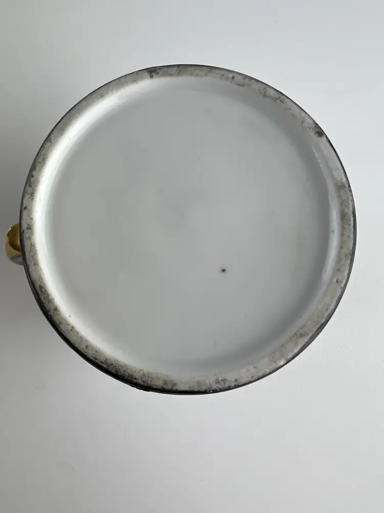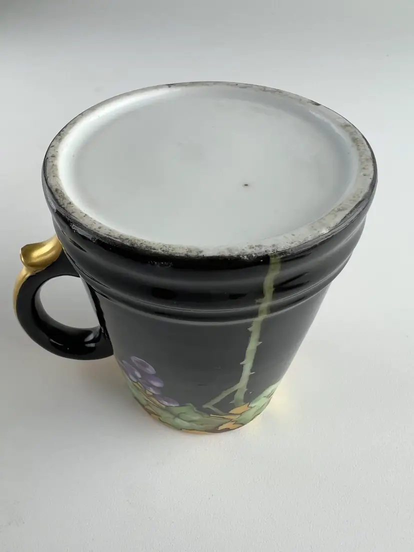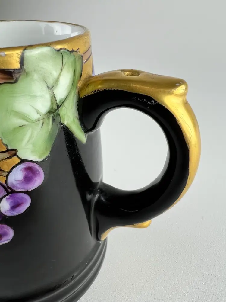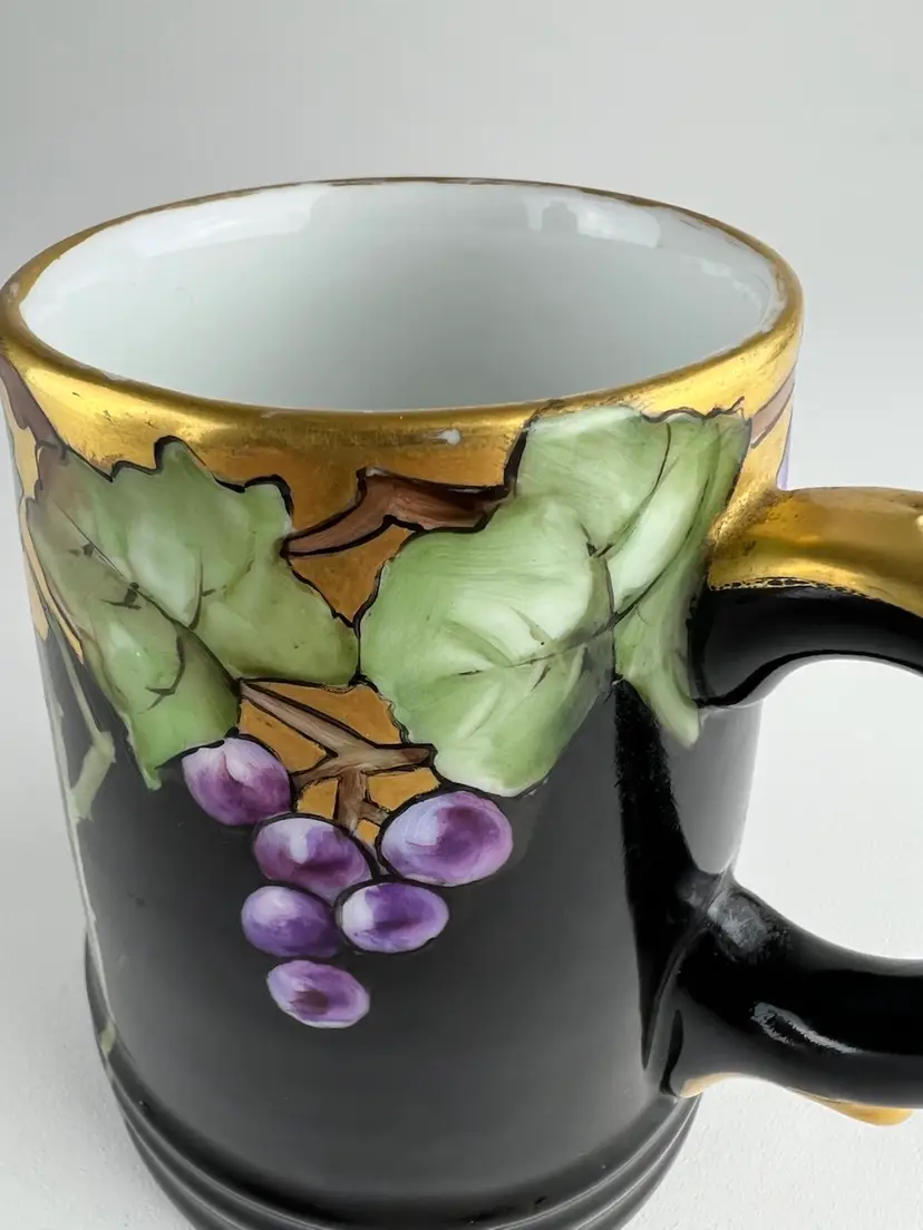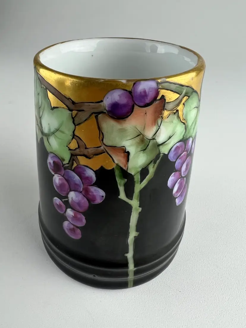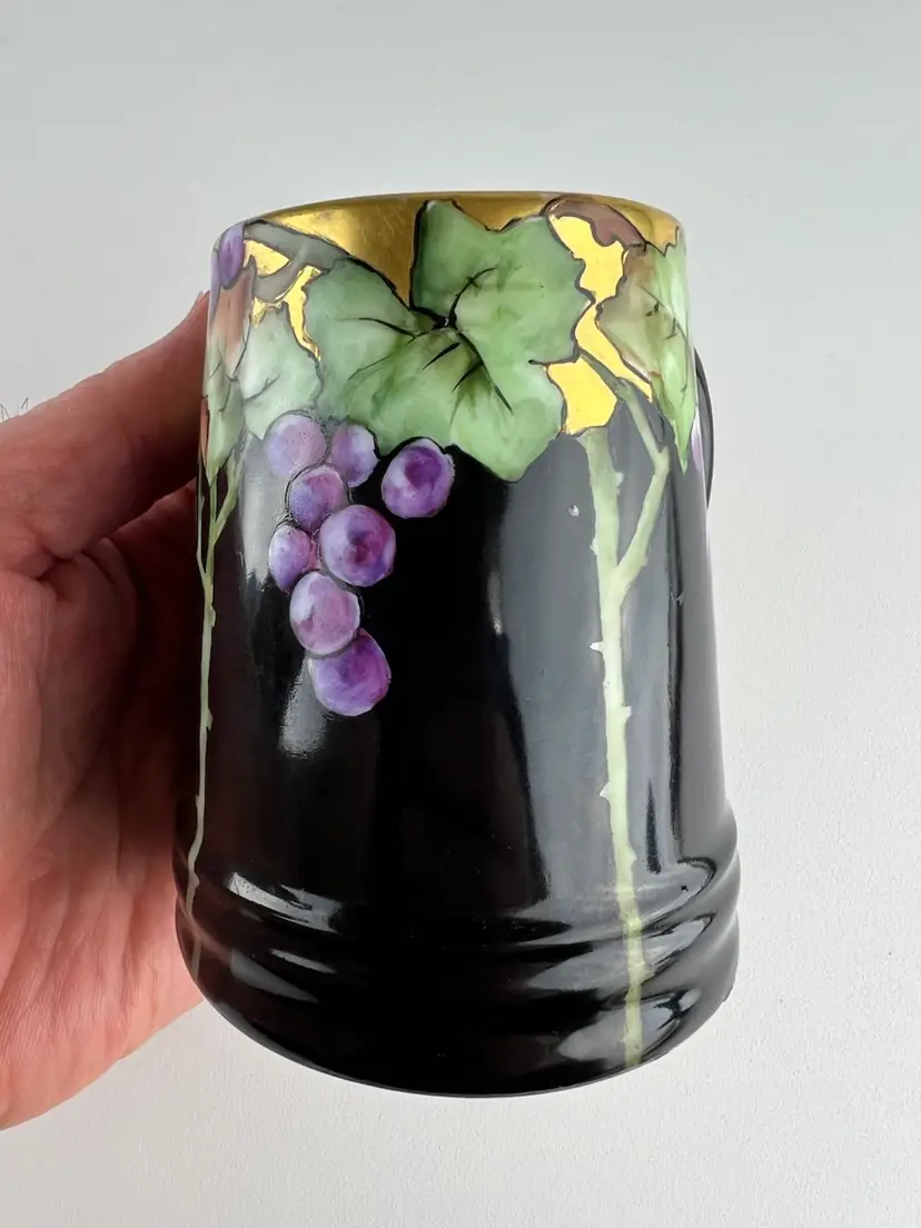 The Charlie B Gallery of Carson City, Nevada is offering this small stein or mug with original grape design. This iconic design is a well known one and a real signature of the Arts and Crafts Movement. This is a porcelain form that has been China-painted with gold gilding. This is fresh from a local collection in Carson City, Nevada.
