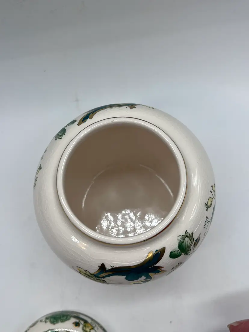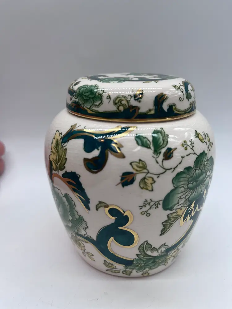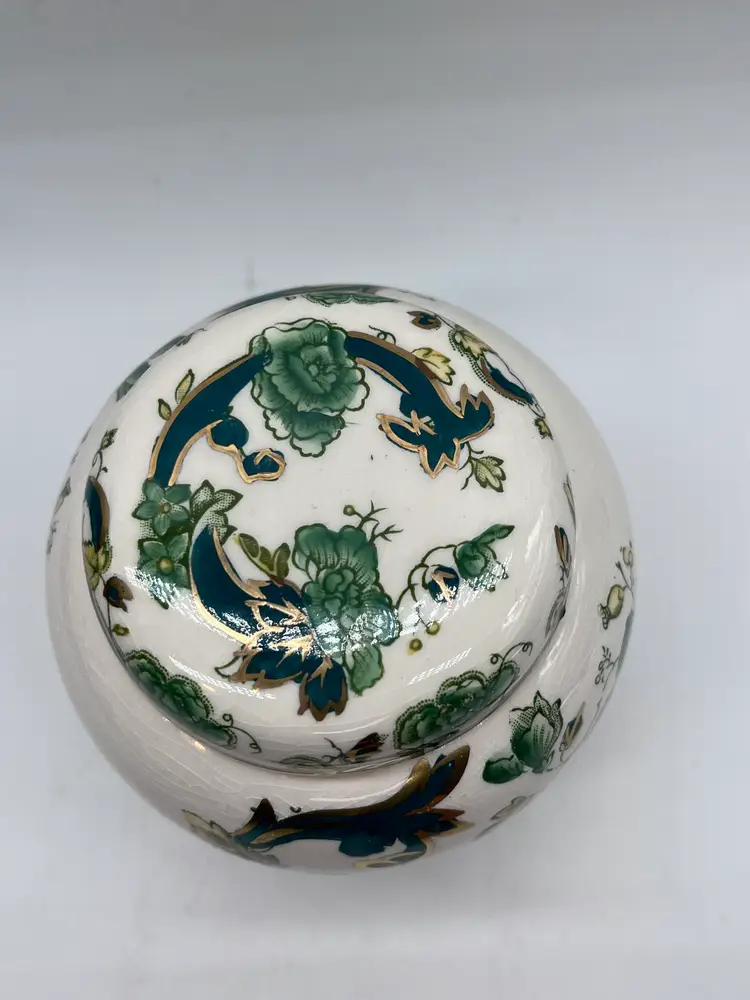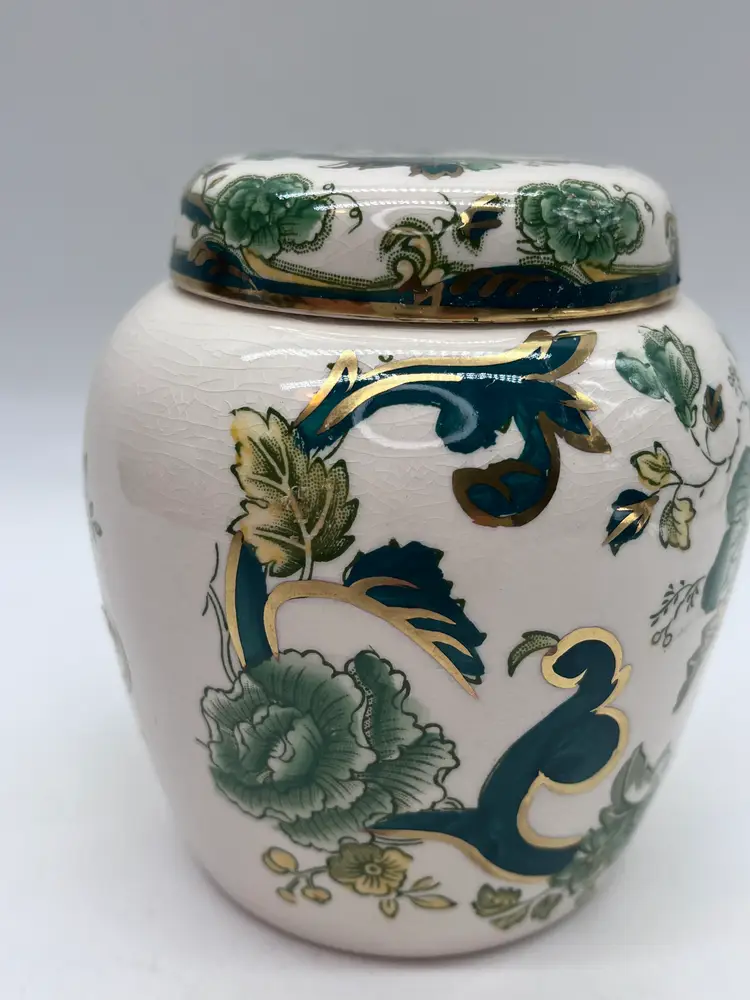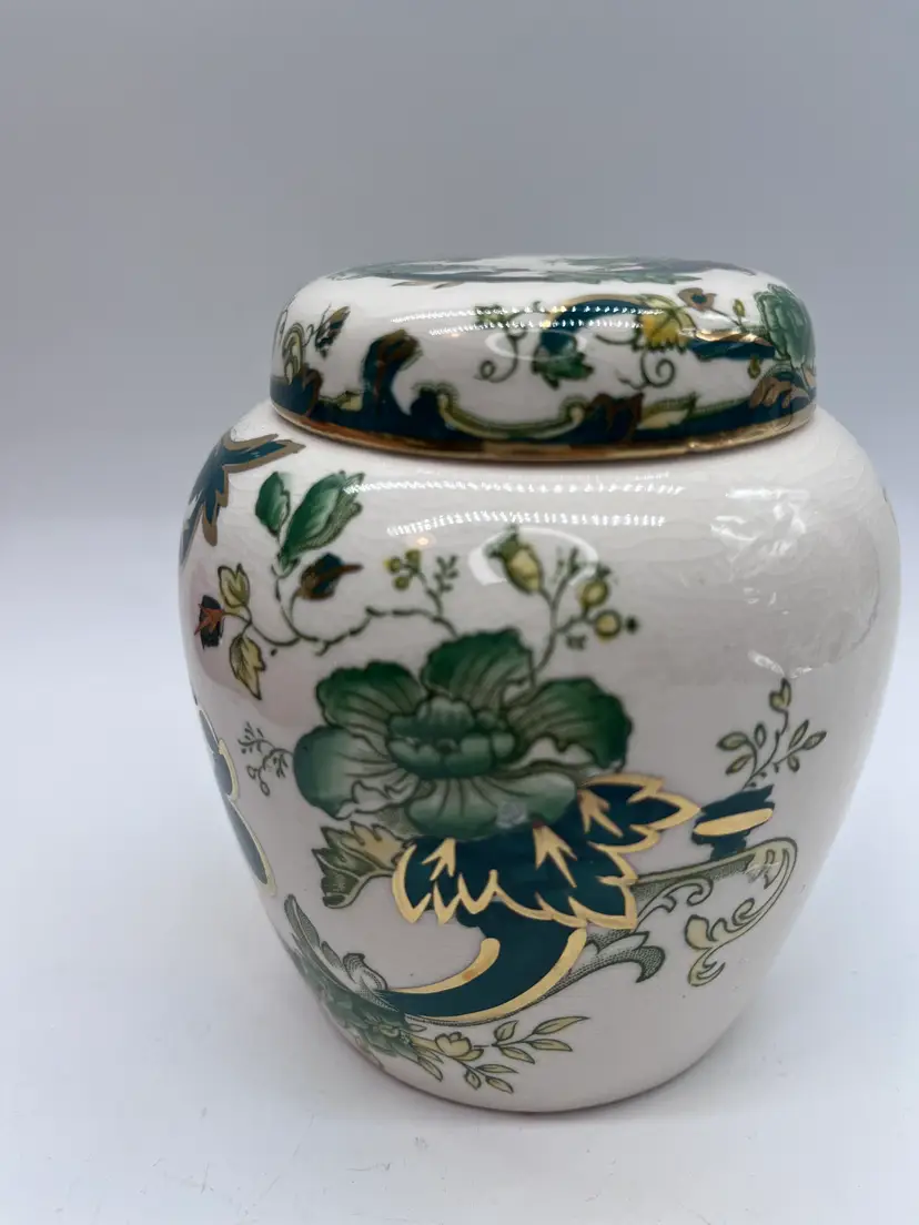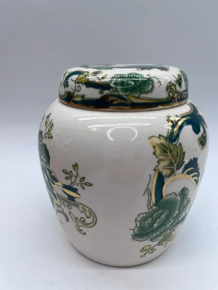 This beautifully detailed ginger jar is from one of the most prolific English producers. The company in fact is generally acknowledged as the inventor of ironstone in the early 19th century. Even though this piece is dated by the base stamp between 1910-1920, the ironstone renders it very durable and hardy, and it is in fine vintage condition. The additional strength from a small amount of added iron is the reason.