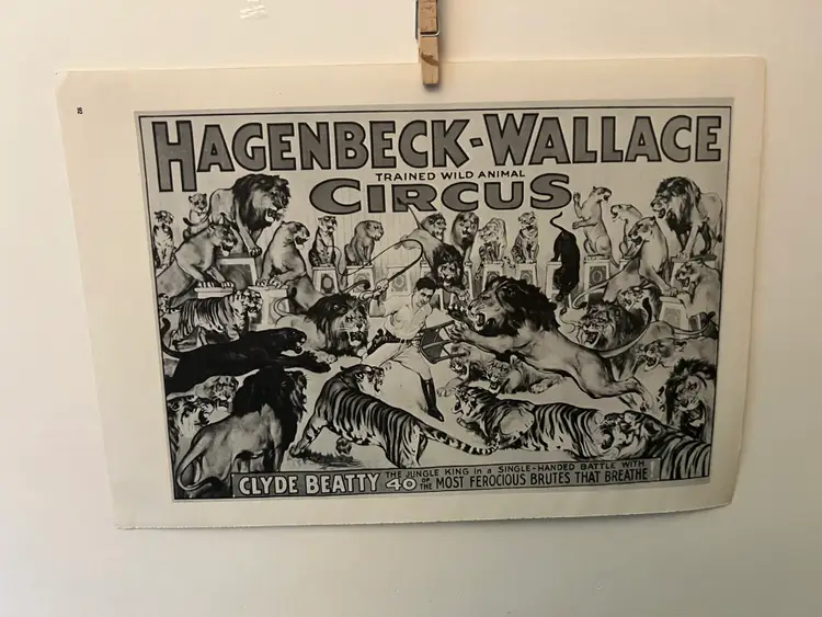 This poster print was removed from a book of circus posters. There may be binding adhesive on one edge. The reverse side of the page has another poster shown in the last picture