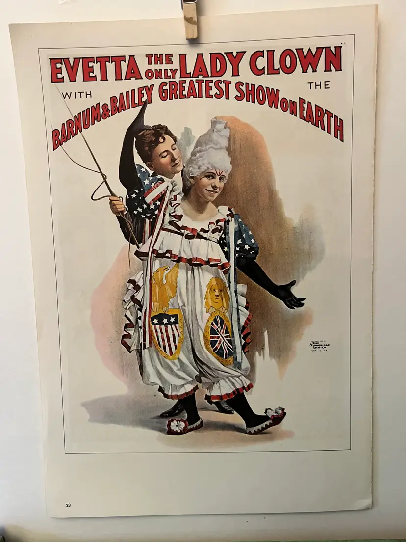 Titled: Evetta The Only Lady Clown 1970s reprint of a 1895 lithograph. Original printer: The Strobridge Litho Co. 11" x 16" This poster print was removed from a book of circus posters. There may be binding adhesive on one edge. The reverse side of the page has another poster shown in the last picture