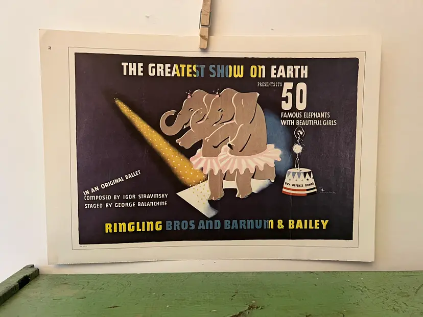 Title: The Greatest Show on Earth. 50 Famous Elephants with Beautiful Girls 1970s reprint of a 1942 lithograph. Original printer: E McKnight Kauffer 11" x 16"