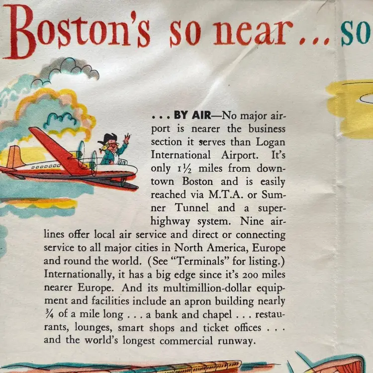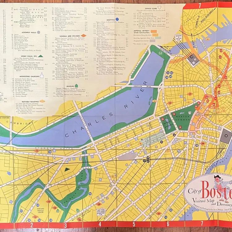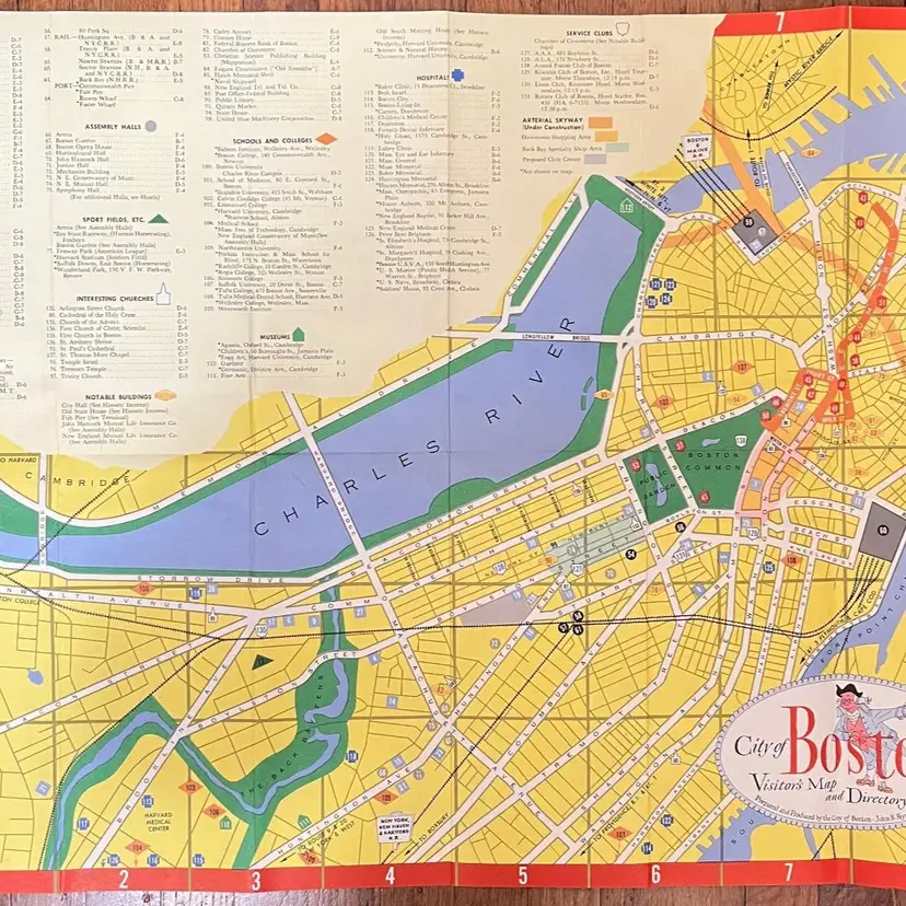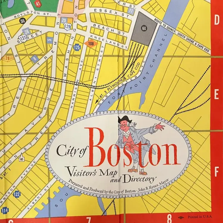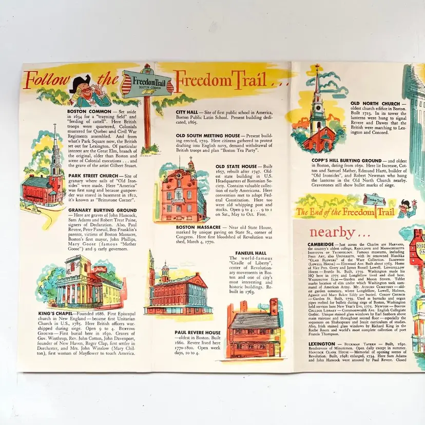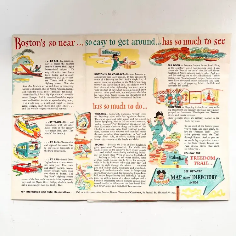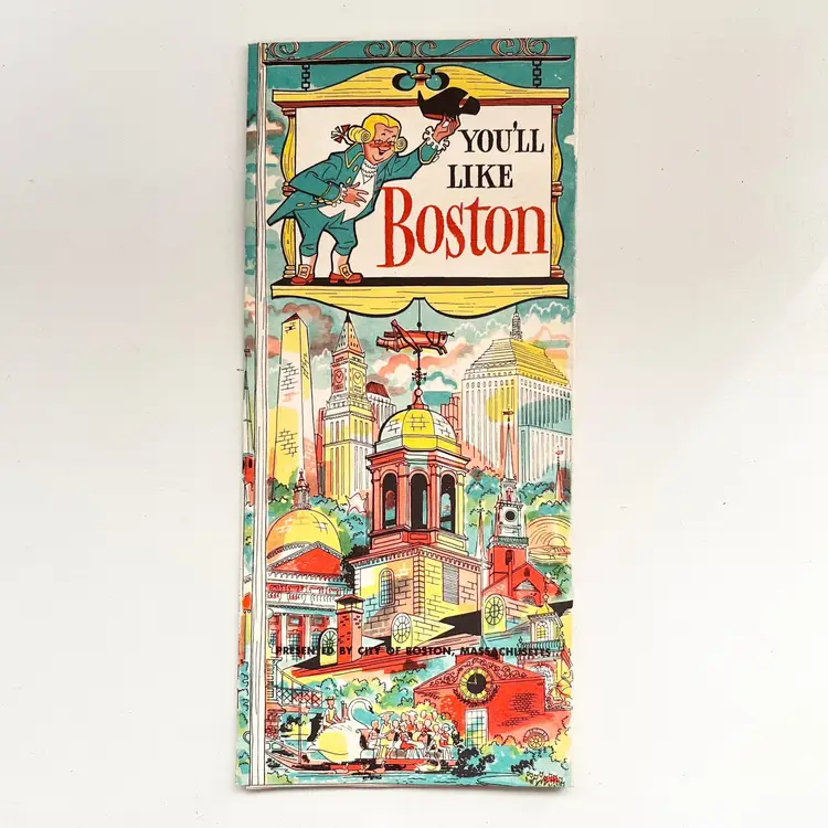 Boston Massachusetts Map Travel Brochure Freedom Trail Vintage 1950s 1960s Convention Bureau, Boston Chamber of Commerce Boston Sightseeing Follow the Freedom Trail to View the City Boston Common, Park Street Church, Granary Burying Ground, King's Chapel City Hall, Old South Meeting House, Old State House, Boston Massacre, Faneuil Hall, Paul Revere House Old North Church, Copp's Burying Ground, Cambridge, Lexington Boston Tea Party, Swan Boats, Concord, Plymouth Bunker Hill Monument, Navy Yard, State House, Provincetown, Salem, Quincy Boston Public Library, Horticultural Hall, Dorchester Heights Monument, Children's Art Centre, Museum of FIne Arts, Isabella Stewart Gardner Museum, Guild of Boston Artists, Museum of Science Large City of Boston Visitor's Map and Directory of Hotels, Historic Interests, Air/Bus/Rail/Port Terminals, Assembly Halls, Sport Fields, Interesting Churches, Notable Buildings, Schools and Colleges, Museums, Hospitals, Service Clubs and Arterial Skyway (Under Construction) Prepared and Produced by the City of Boston – John B. Hynes, Mayor Brochure measures 9 inches x 4 inches Map & Directory measures 24 inches x 18 inches Condition: Wear on the corners. A small white peeled paper spot on the front cover upper right in the blue near the word "You'll." Creased paper on the "Boston's so near" panel upper left. Packaged in a plastic sleeve inside a rigid envelope Visit my store to see more vintage ephemera, advertising, novelties, gifts, estate sale and yard sale finds https://district.net/u/finderspickerspaper SKU B29