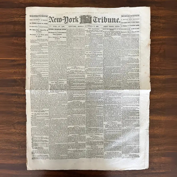 Antique New York Tribune Newspaper dated December 21, 1863 Vol. XXIII No. 7,086 Certificate of Authenticity Signed by Norman Shavin, Capricorn Corporation, Inc. Atlanta, Georgia 8 pages of News and Advertisements