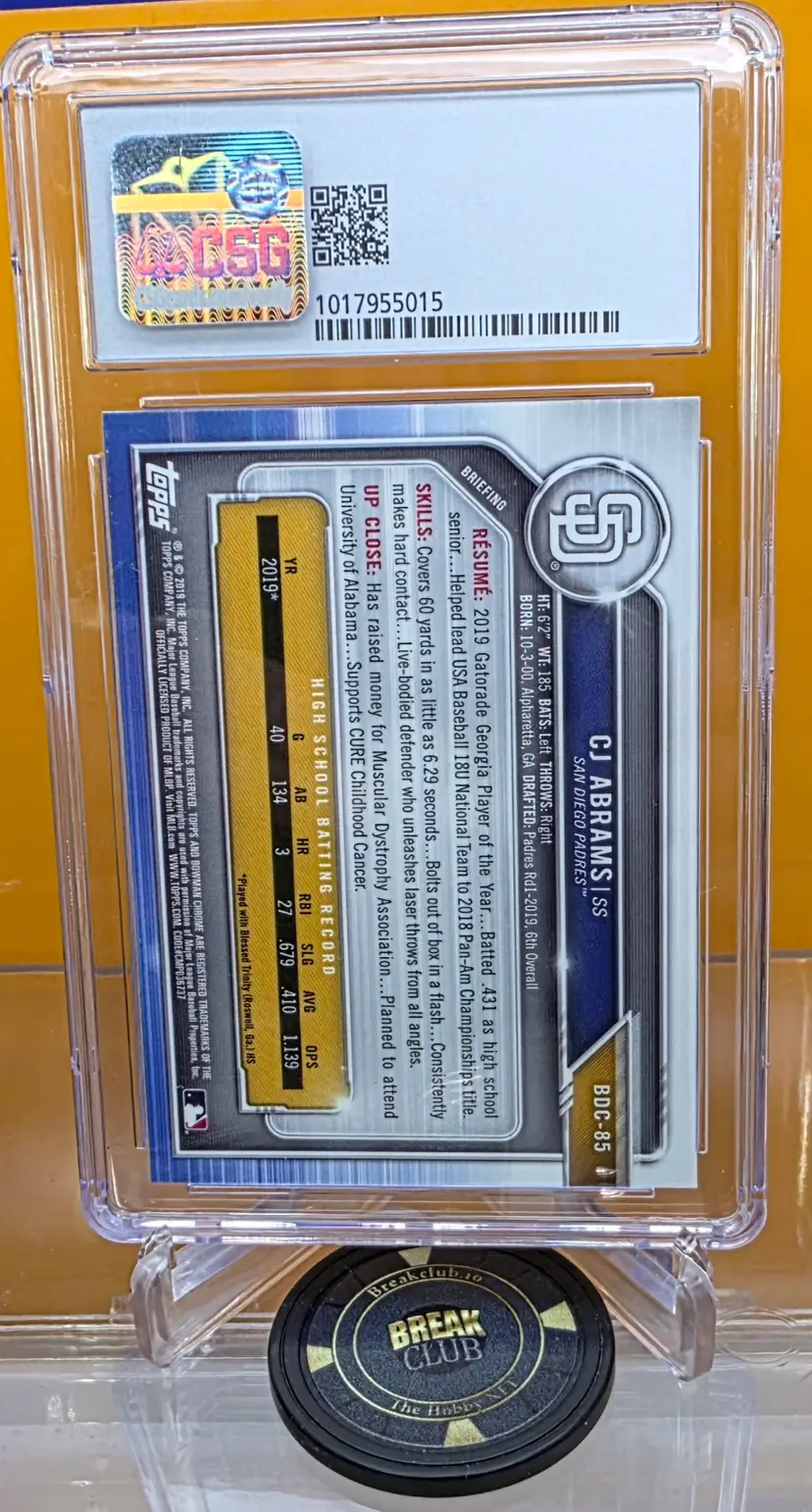 CJ Abrams 2019 Bowman Chrome Draft 1st #BDC-85 CSG Graded 9 Washington Nationals
