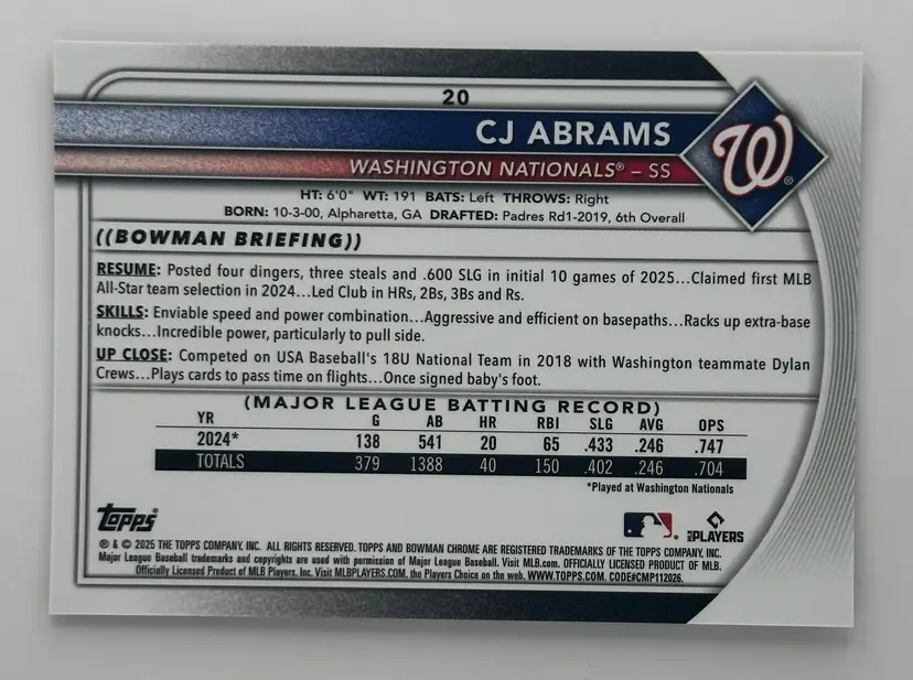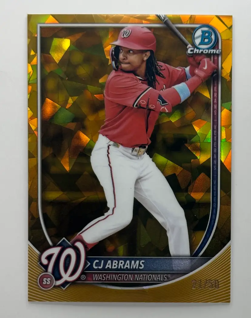 Snag this stunning CJ Abrams card from Bowman Chrome, featuring a gold refractor design and limited to just 50 copies. A must-have for any Washington Nationals fan!