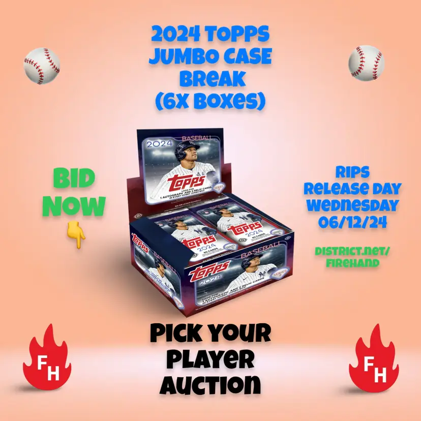 You are bidding on all the cards of the player listed in the title in this Jumbo Case (6x Jumbo Boxes) of 2024 Topps Series 2 Baseball Cards. Auctions end Release Day, Wednesday 06/12/2024 and Case will be opened LIVE shortly after the last spot ends. Opening will be viewable & simulcast on Firehand Cards District as well as YouTube. US Shipping is $5.00 for your first S2 auction spot won and only $.25 per additional spot won after that! Any spot won where no cards of the player are found in the box will receive a bonus card or pack from the Firehand collection. League Leaders or other multi-player base cards will be split as fairly as possible between the spots of the players depicted on the card. Any hit pulled (Cut Signatures, Sketches, Hidden Gems etc) of a player who is NOT listed in the auction will be assigned by draw between all participants. Any dual or multi-player #'d hits or autos featuring multiple players will be assigned live between the spots depicted on the card.