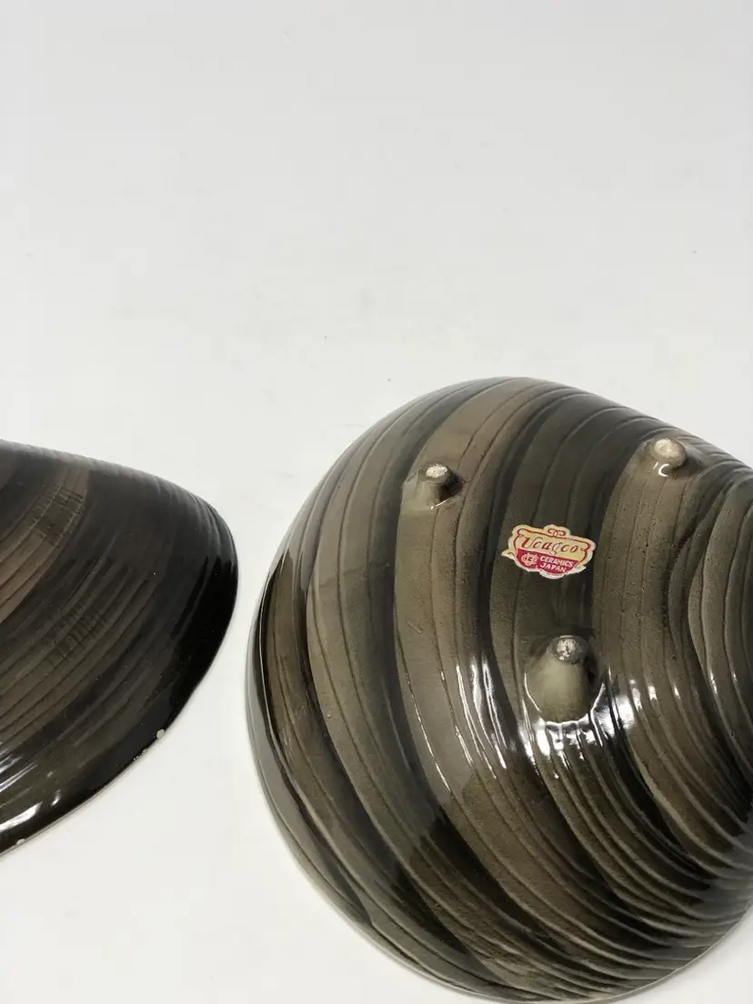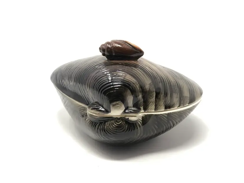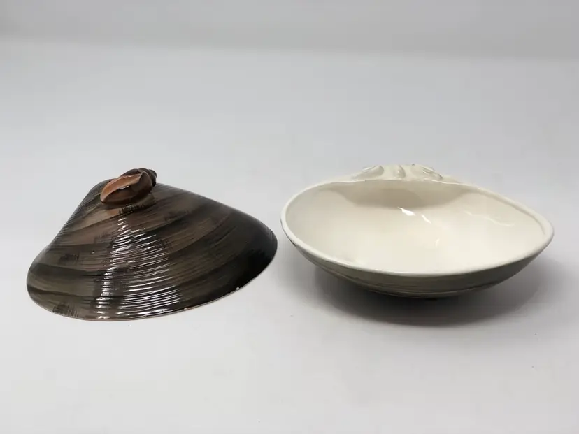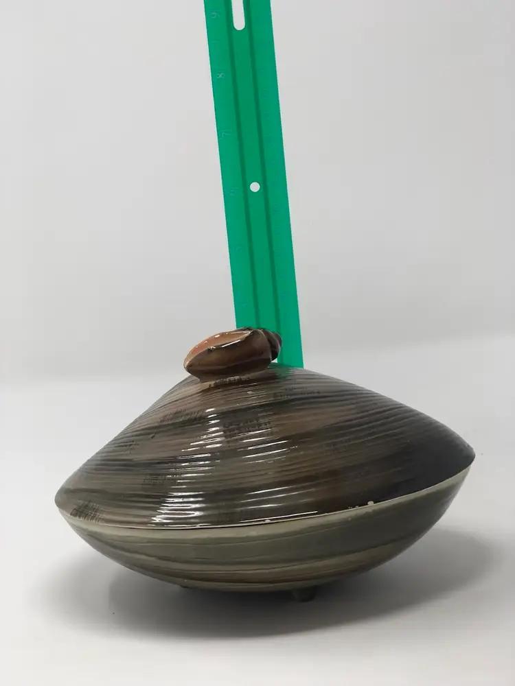 Large lidded trinket box with three small feet. Some small nicks on top rim but otherwise great condition with original red and gold sticker 6 1/2" wide and 3 1/2" tall