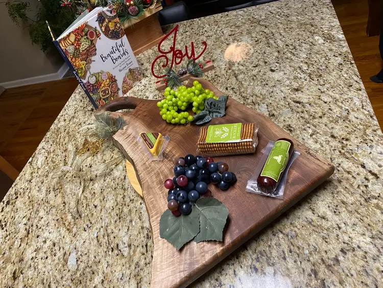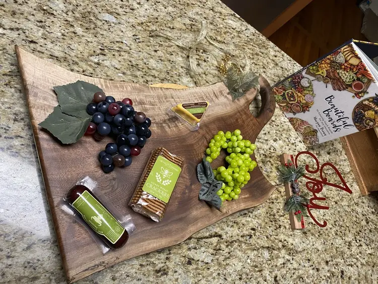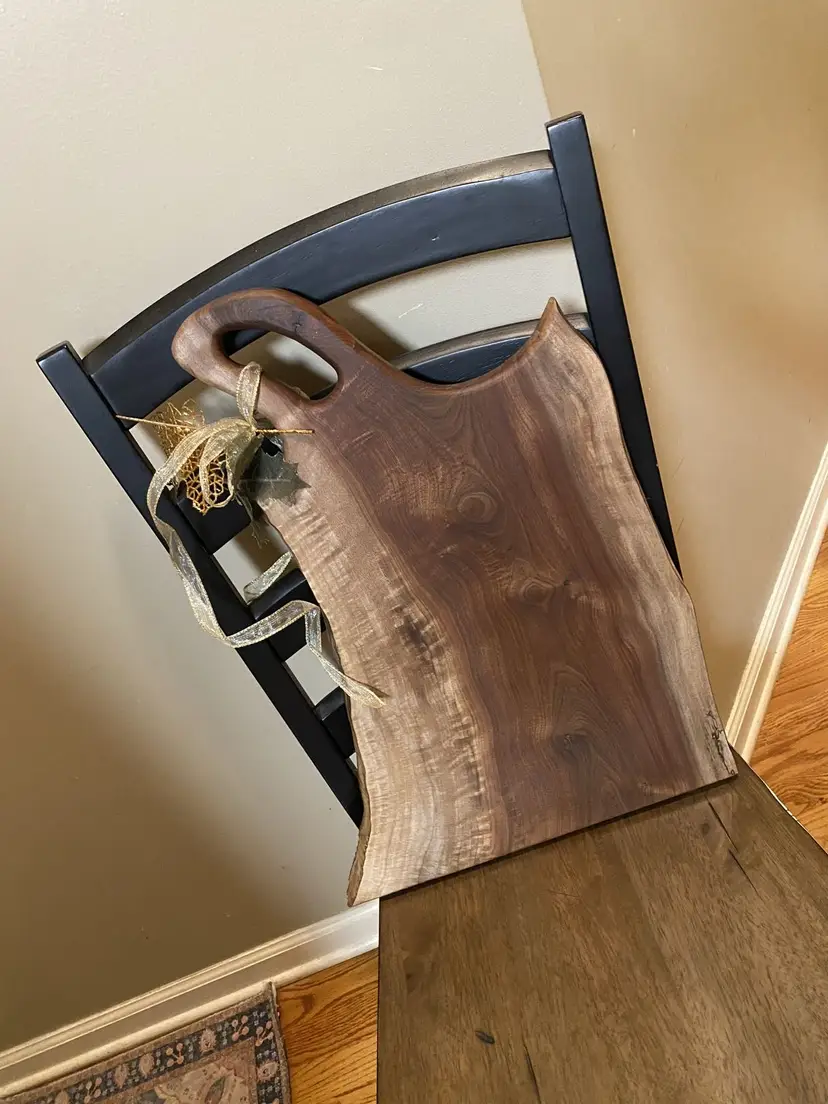 This live edge charcuterie board is handcrafted from solid Claro walnut. It's designed as a functional serving piece well suited for entertaining, gifting, or display.