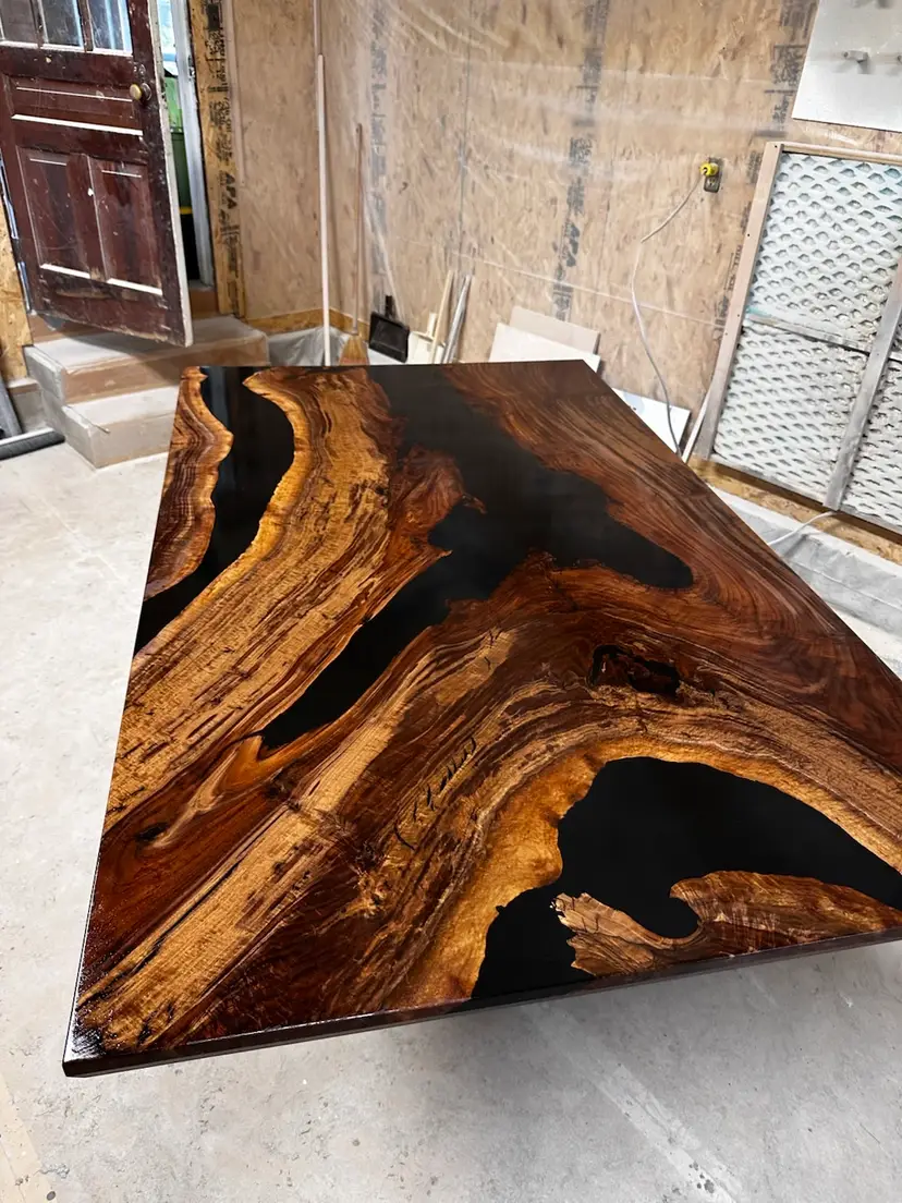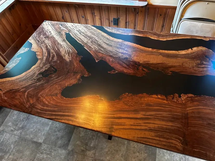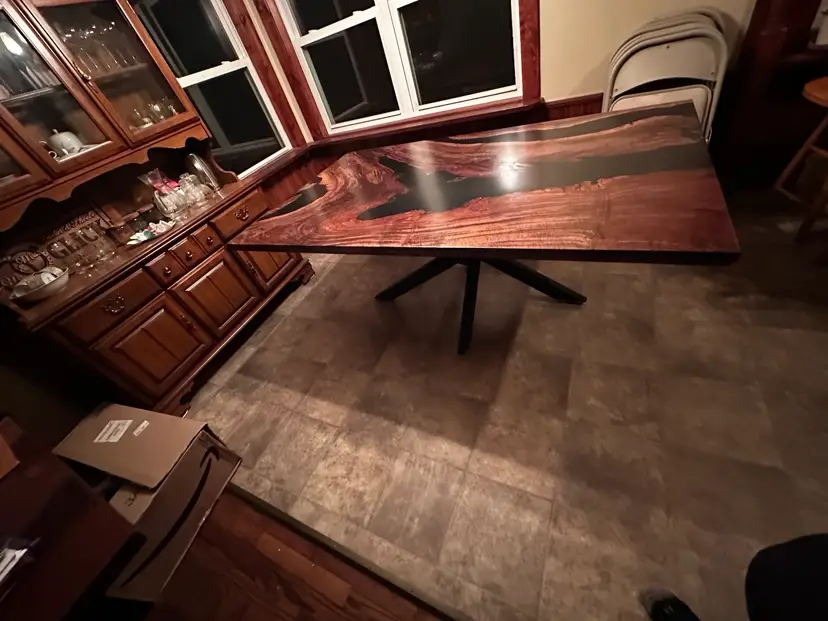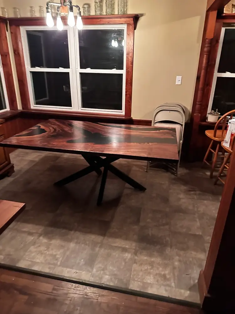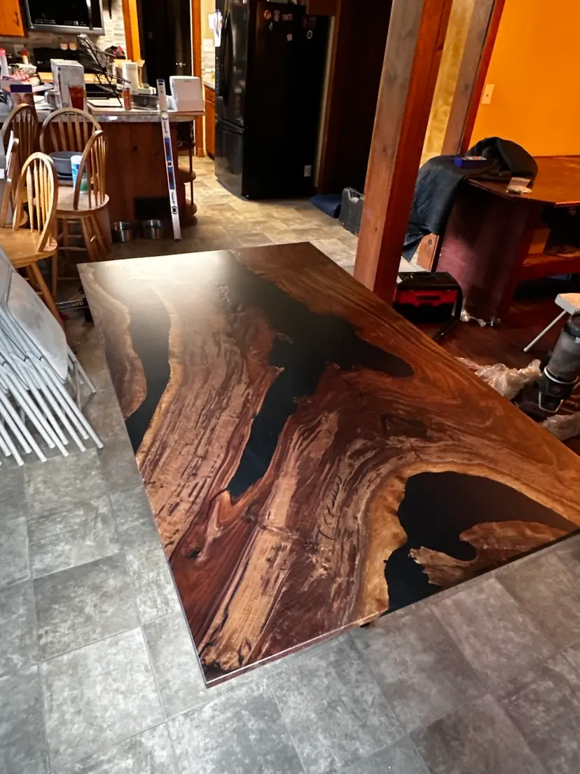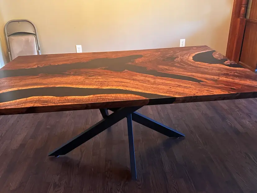 Stunning live edge walnut table with deep black resin inlays. Perfect for adding a touch of nature to your dining space. Finished with a durable varnish for lasting beauty. 72x42”