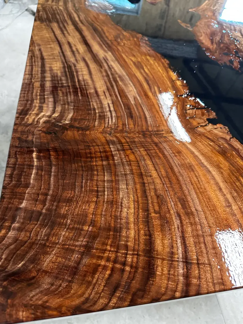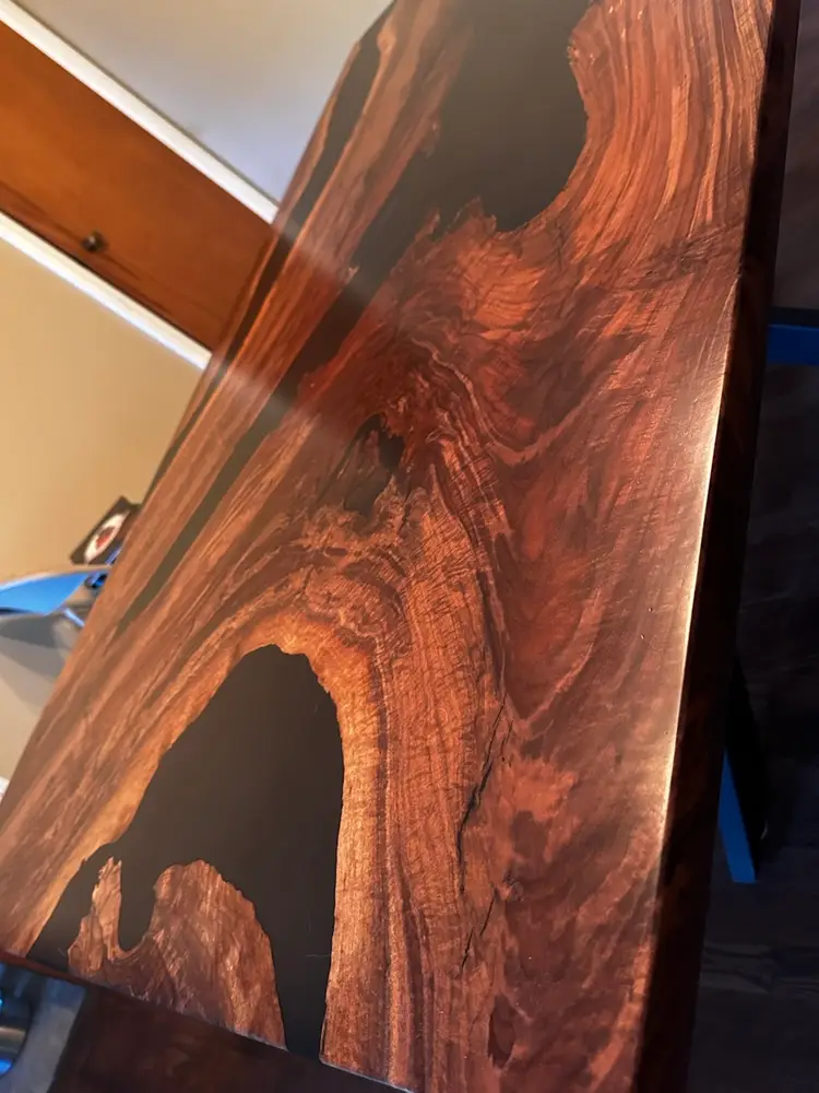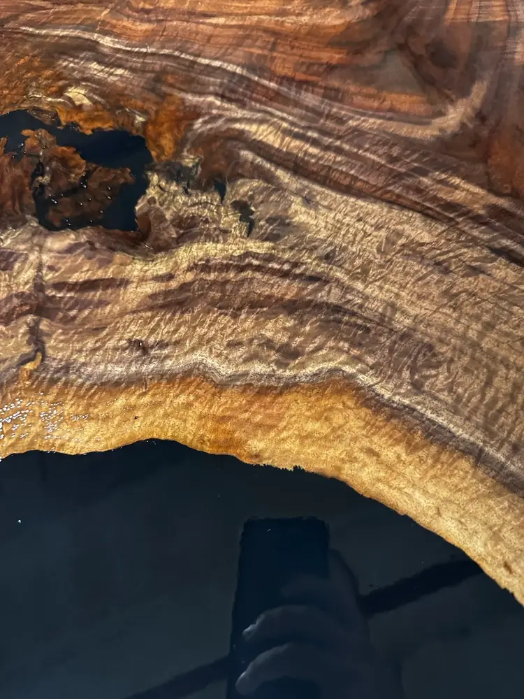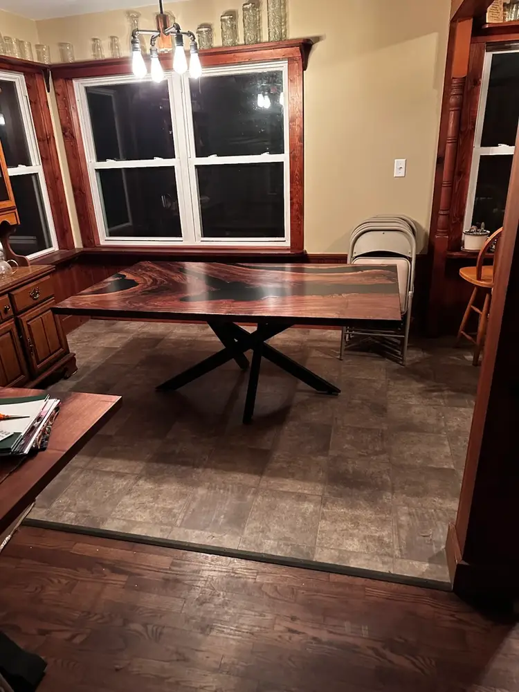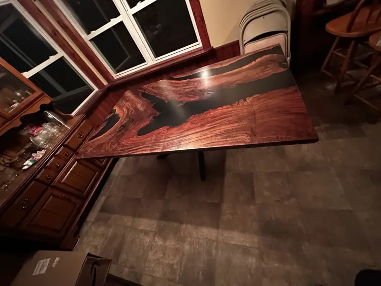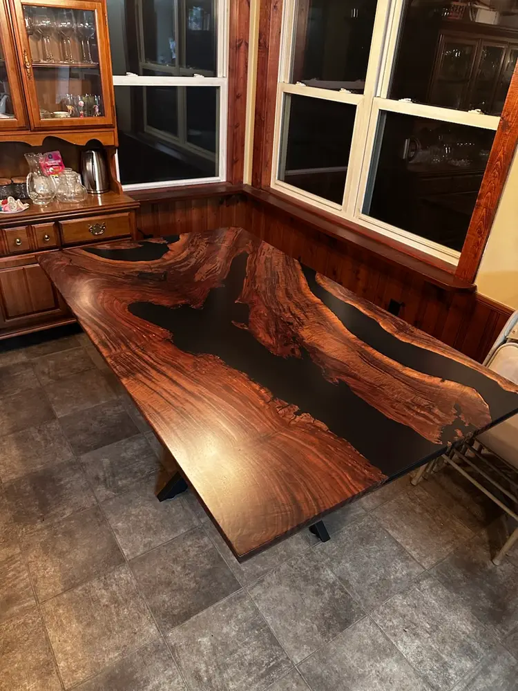 Stunning live edge walnut table with deep black resin inlays. Perfect for adding a touch of nature to your dining space. Finished with a durable varnish for lasting beauty. 72x42”