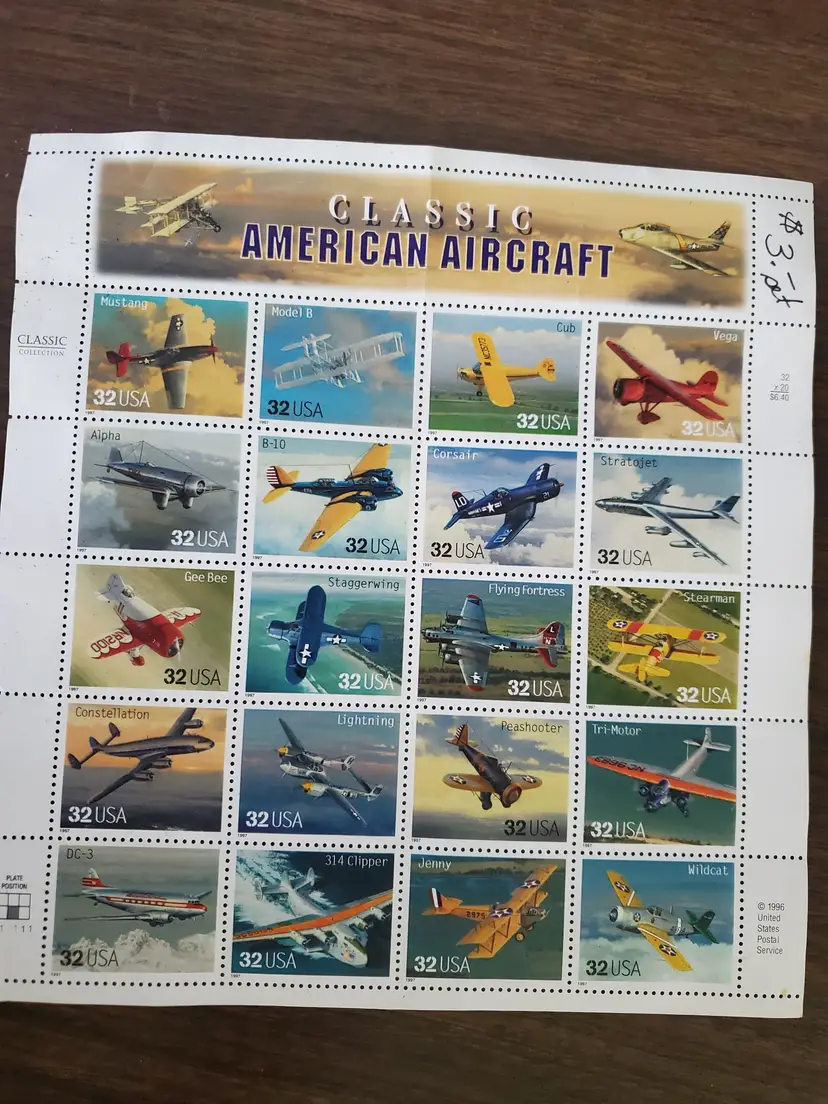 This Classic American Aircraft 1996 Collector's 32¢ Stamp Sheet Set of 20 Stamps is a must-have for all aviation enthusiasts. Featuring 20 original gum stamps with a face value of 6.40, this set showcases some of the most iconic planes in American history. The stamps are ungraded and uncertified, making them perfect for both collectors and those looking to add a unique touch to their mail or crafts. The multi-color stamps depict different planes and their specifications, including the year of issue and denomination. The stamps were made in the United States and are a great way to celebrate America's rich aviation history. Whether you're a stamp collector or simply looking for a unique addition to your collection, this Classic American Aircraft stamp sheet set is a great option.