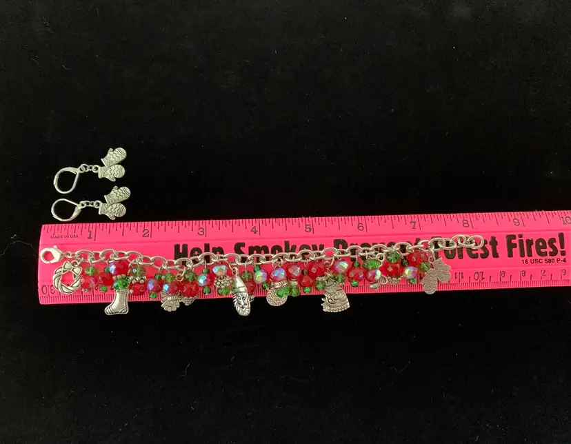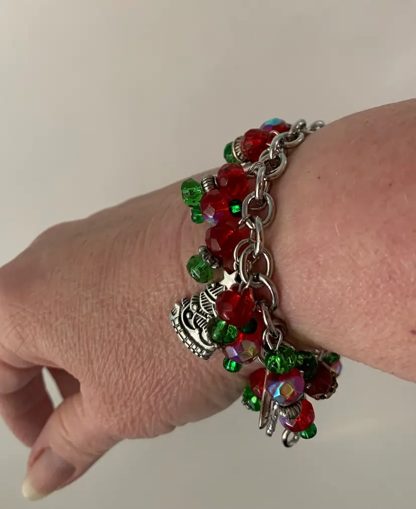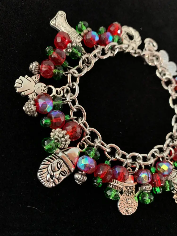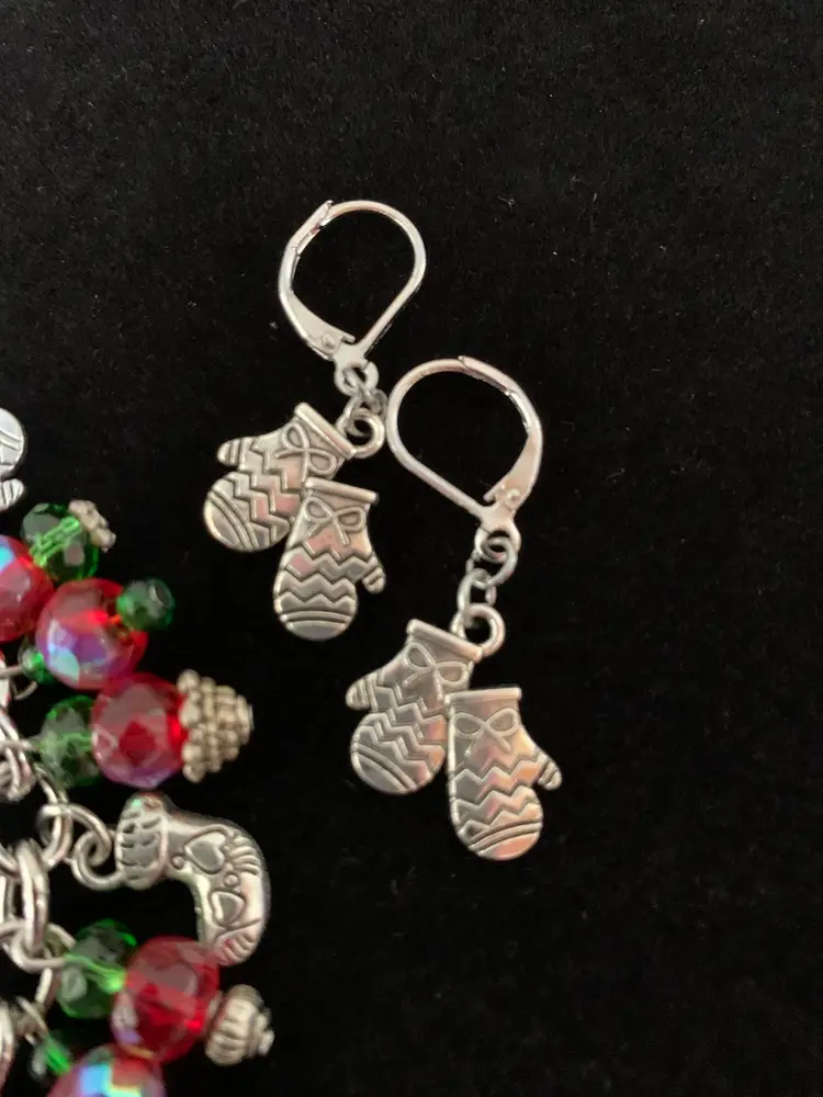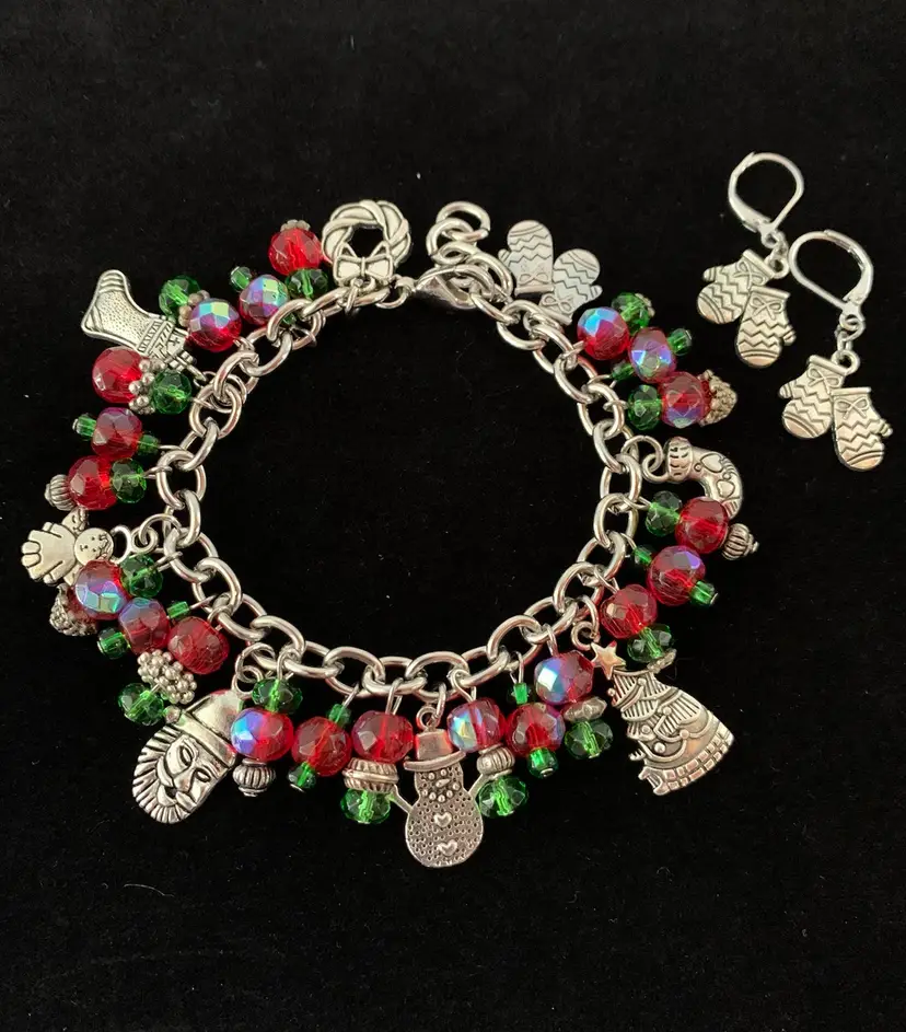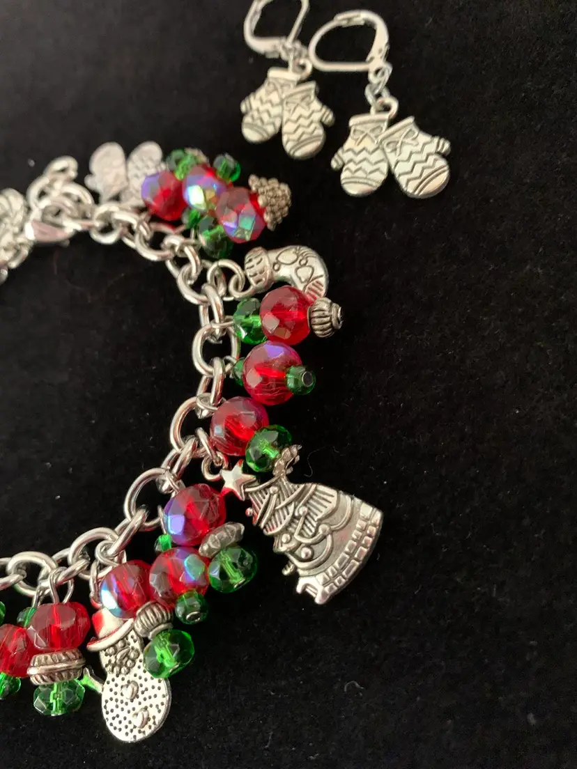 Silver toned charm bracelet with silver Christmas charms and red and green glass bead dangles. Matching mitten earrings are on silver toned lever back findings.
