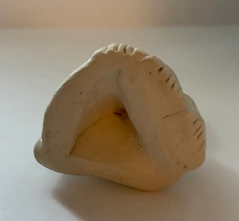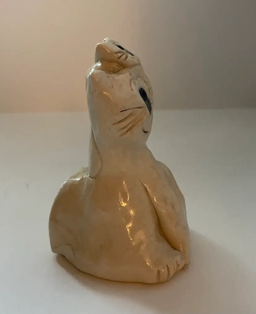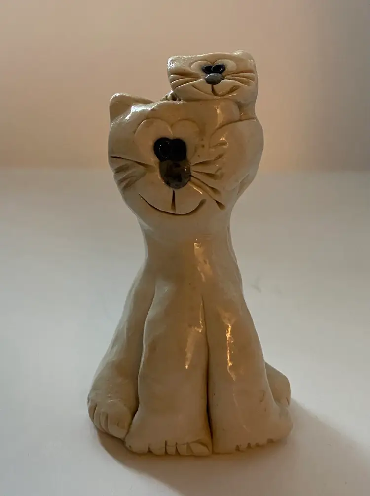 Handcrafted clay figurine. Looks like this might have been a person‘s craft project. There is no signature of artist. This reminds me a bit of Rinconada. A very heartwarming piece of sculpture.