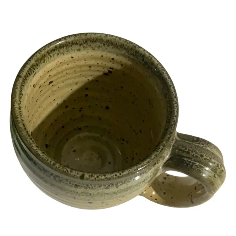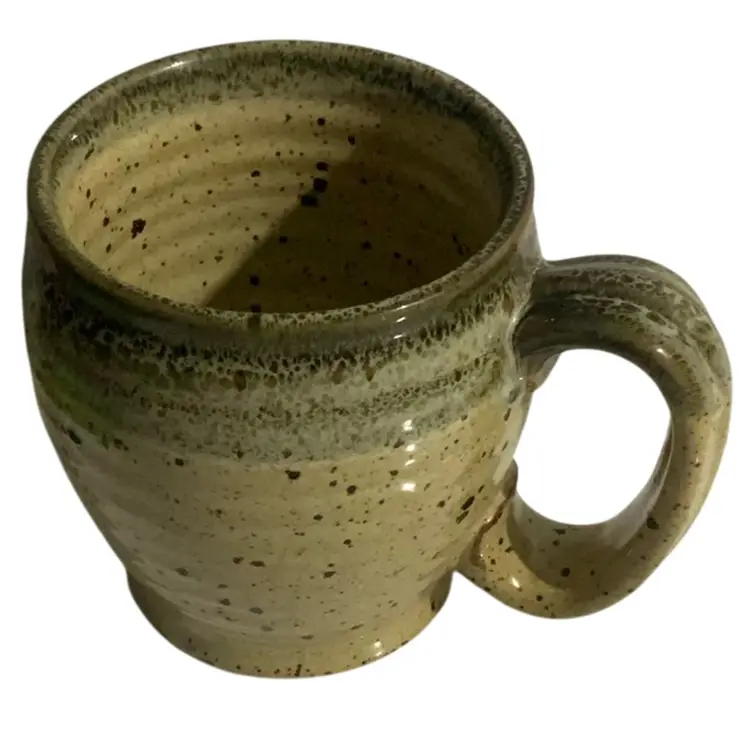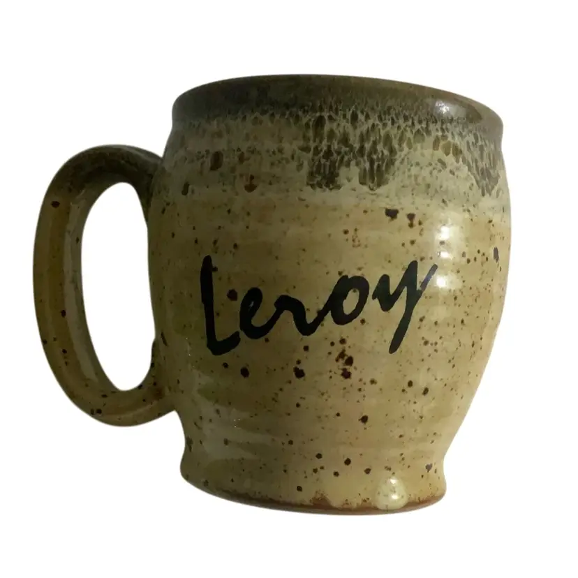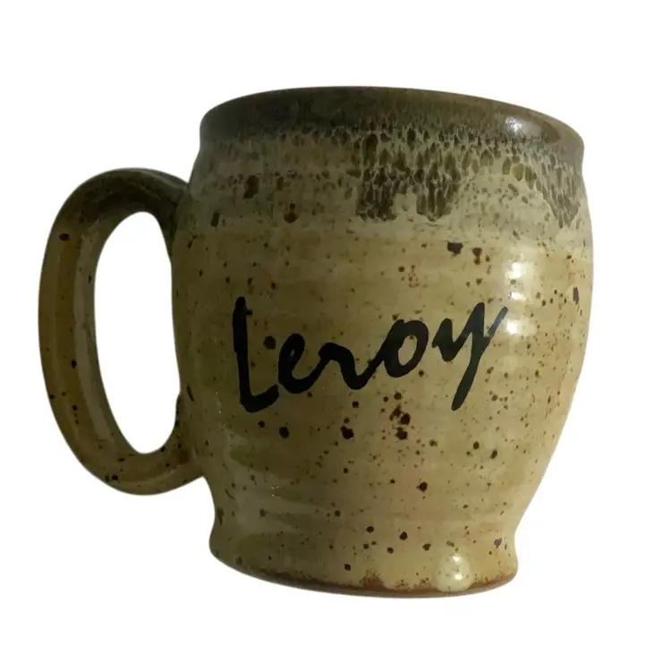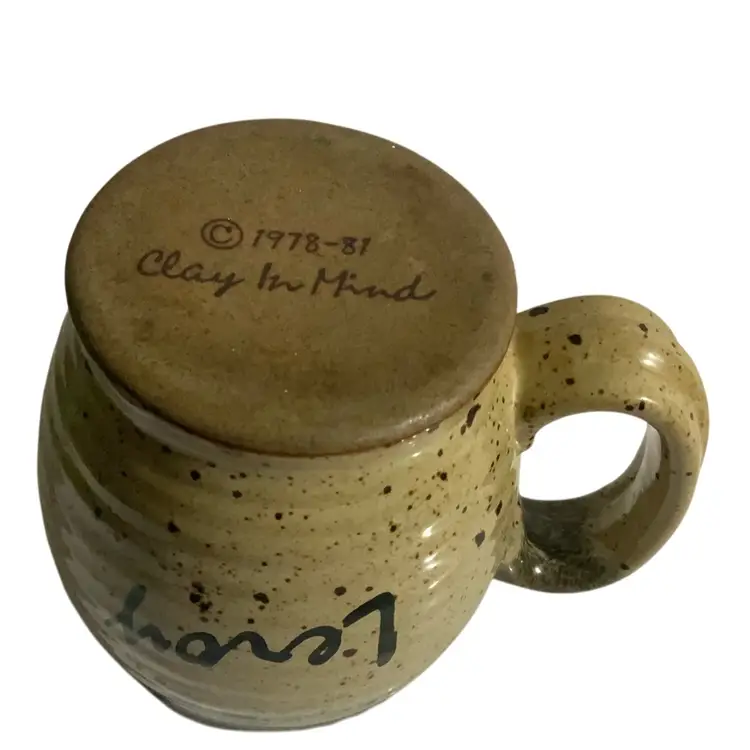 In great condition - vintage "Clay In Mind Pottery" coffee mug with the name "Leroy" inscribed on it. •It is made of beige clay with brown speckles and a darker brown rim. • The mug is handcrafted 1978-1981 4” tall be 4.75” with handle long