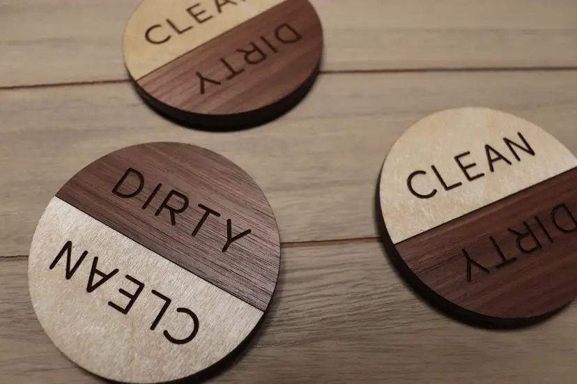 These laser engraved Birch and Walnut wood coasters are engraved and double layered to increase sturdiness. The word "Clean" is engraved on White Birch, and the word "Dirty" is engraved on Walnut. Measuring at 4", with a 1' magnet on the back, each dishwasher magnet is finished with a layer of polyurethane for protection.
