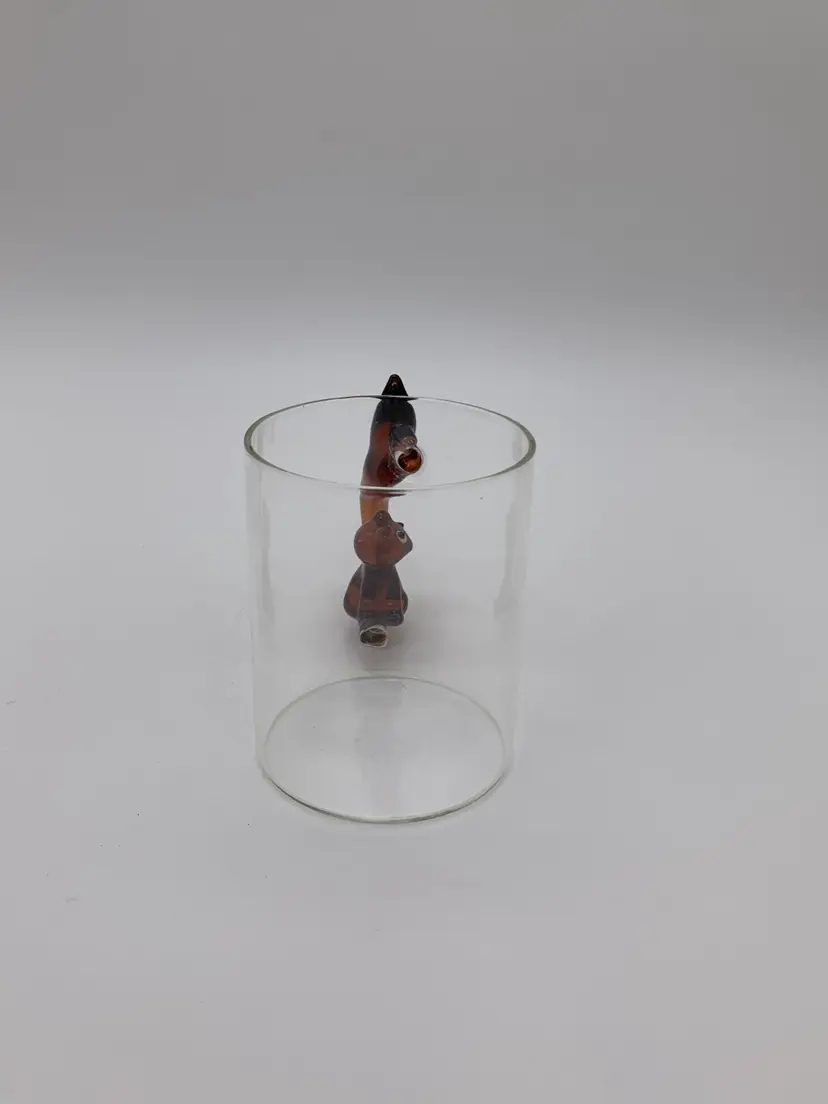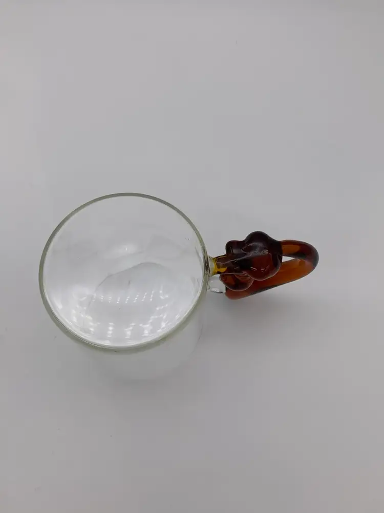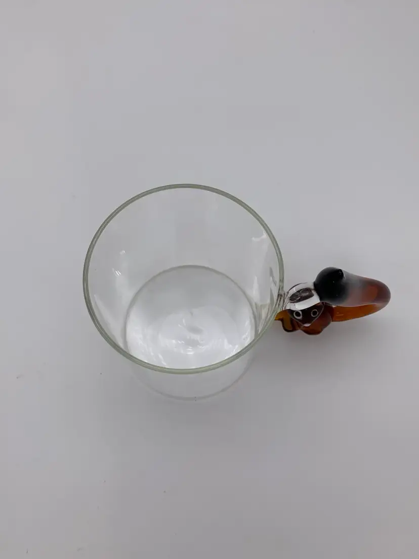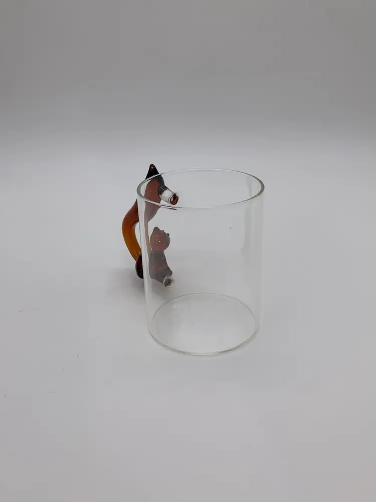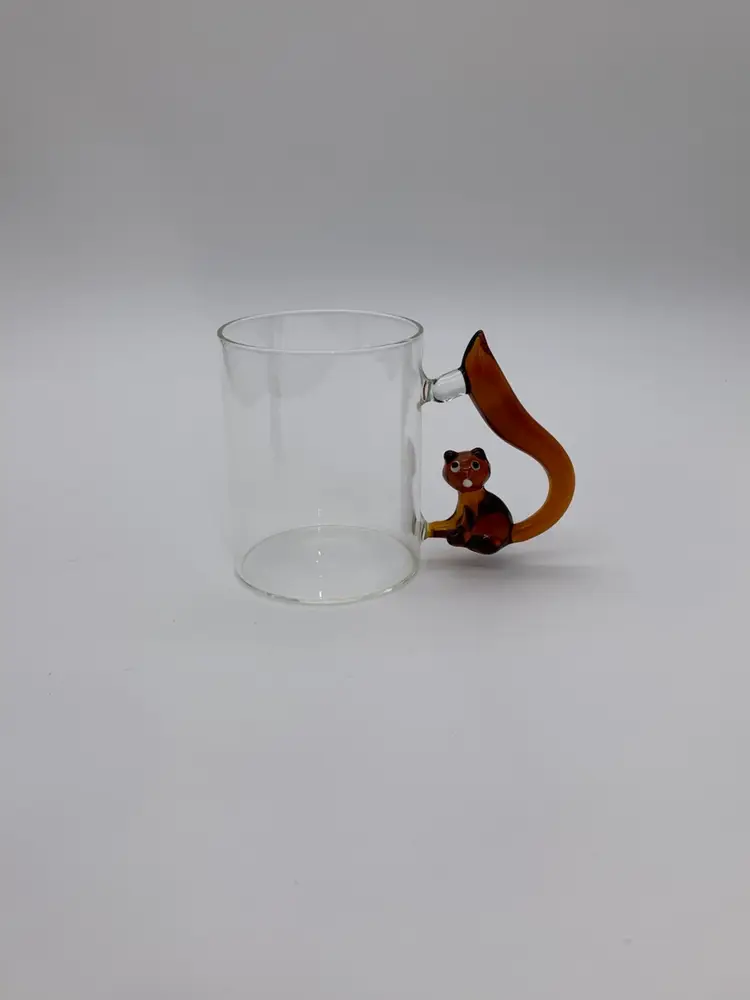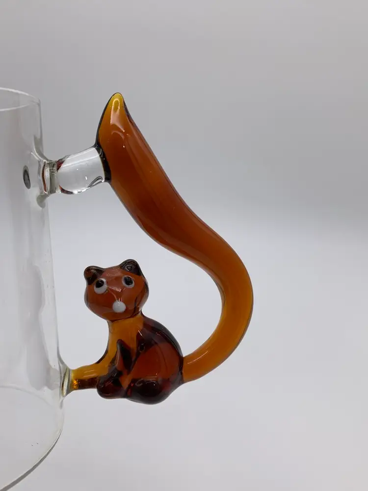 This is a clear 14oz glass tumbler with a unique art glass sculpted squirrel handle. The tumbler has a round/cylinder shape and features a solid pattern. It is suitable for all occasions and has a capacity of 14 Oz. The tumbler is made of glass and has a brown color. The item is 4" in height and 3.5" in width, and weighs 6.4 Oz. The tumbler is designed in an Art Deco style and has a theme of animals, fairytale and fantasy, and wild animals. It is recommended to hand wash only. The tumbler is perfect for those who love animals and want to add a touch of fantasy to their drinkware collection. The glass is in Excellent Lightly Used Vintage Pre-Owned Condition.